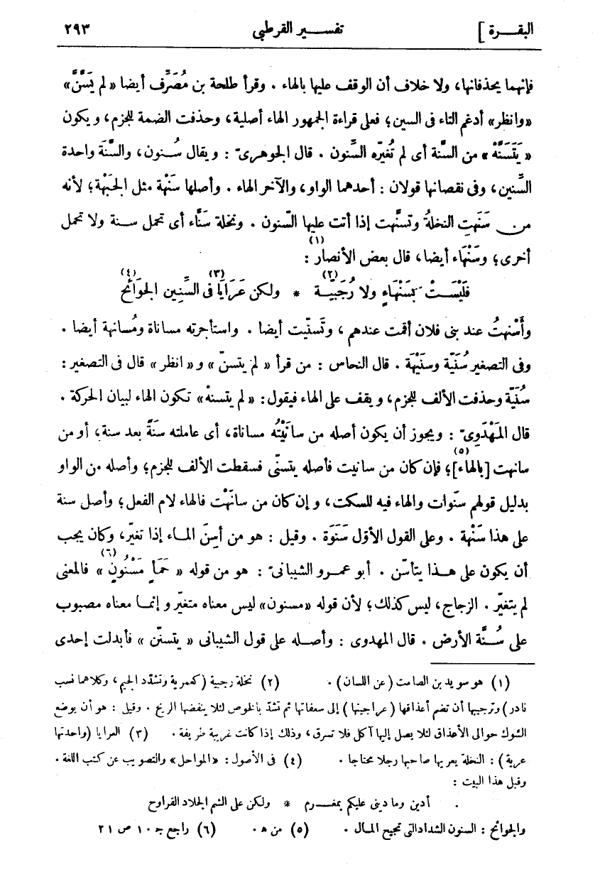 فَإِنَّهُمَا يَحْذِفَانِهَا، وَلَا خِلَافَ أَنَّ الْوَقْفَ عَلَيْهَا بالهاء. وقرأ طلحة ابن مُصَرِّفٍ أَيْضًا" لَمْ يَسَّنَّ وَانْظُرْ" أَدْغَمَ التَّاءَ فِي السِّينِ، فَعَلَى قِرَاءَةِ الْجُمْهُورِ الْهَاءُ أَصْلِيَّةٌ، وَحُذِفَتِ الضَّمَّةُ لِلْجَزْمِ، وَيَكُونُ" يَتَسَنَّهْ" مِنَ السَّنَةِ أَيْ لَمْ تُغَيِّرْهُ السِّنُونَ. قَالَ الْجَوْهَرِيُّ: وَيُقَالُ سُنُونَ، وَالسَّنَةُ وَاحِدَةُ السِّنِينَ، وَفِي نُقْصَانِهَا قَوْلَانِ: أَحَدُهُمَا الْوَاوُ، وَالْآخَرُ الْهَاءُ. وَأَصْلُهَا سَنْهَةٌ مِثْلَ الْجَبْهَةِ، لِأَنَّهُ مِنْ سَنِهَتِ النَّخْلَةُ وَتَسَنَّهَتْ إِذَا أَتَتْ عَلَيْهَا السِّنُونَ. وَنَخْلَةٌ سَنَّاءٌ أَيْ تَحْمِلُ سَنَةً وَلَا تَحْمِلُ أُخْرَى، وَسَنْهَاءٌ أَيْضًا، قَالَ بَعْضُ الْأَنْصَارِ: «١»