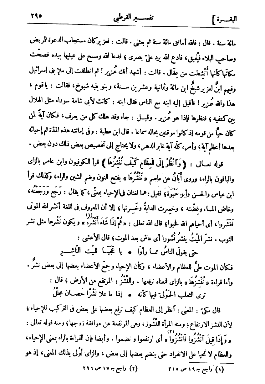 مِائَةِ سَنَةٍ. قَالَ: فَاللَّهُ أَمَاتَنِي مِائَةَ سَنَةٍ ثُمَّ بَعَثَنِي. قَالَتْ: فَعُزَيْرٌ كَانَ مُسْتَجَابُ الدَّعْوَةِ لِلْمَرِيضِ وَصَاحِبِ الْبَلَاءِ فَيُفِيقُ، فَادْعُ اللَّهَ يَرُدُّ عَلَيَّ بَصَرِي، فَدَعَا اللَّهَ وَمَسَحَ عَلَى عَيْنَيْهَا بِيَدِهِ فَصَحَّتْ مَكَانَهَا كَأَنَّهَا أُنْشِطَتْ مِنْ عِقَالٍ. قَالَتْ: أَشْهَدُ أَنَّكَ عُزَيْرٌ! ثُمَّ انْطَلَقَتْ إِلَى مَلَإِ بَنِي إِسْرَائِيلَ وَفِيهِمُ ابْنٌ لِعُزَيْرٍ شَيْخٌ ابن مائة وثمانية وَعِشْرِينَ سَنَةً، وَبَنُو بَنِيهِ شُيُوخٌ، فَقَالَتْ: يَا قَوْمُ، هَذَا وَاللَّهِ عُزَيْرٌ! فَأَقْبَلَ إِلَيْهِ ابْنُهُ مَعَ النَّاسِ فَقَالَ ابْنُهُ: كَانَتْ لِأَبِي شَامَةٌ سَوْدَاءُ مِثْلَ الْهِلَالِ بَيْنَ كَتِفَيْهِ، فَنَظَرَهَا فَإِذَا هُوَ عُزَيْرٌ. وَقِيلَ: جَاءَ وَقَدْ هَلَكَ كُلُّ مَنْ يَعْرِفُ، فَكَانَ آيَةً لِمَنْ كَانَ حَيًّا مِنْ قَوْمِهِ إِذْ كَانُوا مُوقِنِينَ بِحَالِهِ سَمَاعًا. قَالَ ابْنُ عَطِيَّةَ: وَفِي إِمَاتَتِهِ هَذِهِ الْمُدَّةَ ثُمَّ إِحْيَائِهِ بَعْدَهَا أَعْظَمُ آيَةٍ، وَأَمْرُهُ كُلُّهُ آيَةٌ غَابِرَ الدَّهْرِ، وَلَا يَحْتَاجُ إِلَى تَخْصِيصِ بَعْضِ ذَلِكَ دُونَ بَعْضٍ. قَوْلُهُ تَعَالَى: (وَانْظُرْ إِلَى الْعِظامِ كَيْفَ نُنْشِزُها) قَرَأَ الْكُوفِيُّونَ وَابْنُ عَامِرٍ بِالزَّايِ وَالْبَاقُونَ بِالرَّاءِ، وَرَوَى أَبَانٌ عَنْ عَاصِمٍ" نَنْشُرُهَا" بِفَتْحِ النُّونِ وَضَمِّ الشِّينِ وَالرَّاءِ، وَكَذَلِكَ قَرَأَ ابْنُ عَبَّاسٍ وَالْحَسَنُ وَأَبُو حَيْوَةَ، فَقِيلَ: هُمَا لُغَتَانِ فِي الْإِحْيَاءِ بِمَعْنًى، كَمَا يُقَالُ رَجَعَ وَرَجَعْتُهُ، وَغَاضَ الْمَاءُ وَغِضْتُهُ، وَخَسِرَتِ الدَّابَّةُ وَخَسِرْتُهَا، إِلَّا أَنَّ الْمَعْرُوفَ فِي اللُّغَةِ أَنْشَرَ اللَّهُ الْمَوْتَى فَنَشَرُوا، أَيْ أَحْيَاهُمُ اللَّهُ فَحَيُوا، قَالَ اللَّهُ تَعَالَى:" ثُمَّ إِذا شاءَ أَنْشَرَهُ" «١» ويكون نشرها مثل نَشَرَ الثَّوْبَ. نَشَرَ الْمَيِّتُ يَنْشُرُ نُشُورًا أَيْ عَاشَ بَعْدَ الْمَوْتِ، قَالَ الْأَعْشَى: