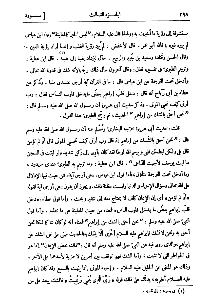 مستشرقة إِلَى رُؤْيَةِ مَا أُخْبِرَتْ بِهِ، وَلِهَذَا قَالَ عَلَيْهِ السَّلَامُ: (لَيْسَ الْخَبَرُ كَالْمُعَايَنَةِ) رَوَاهُ ابْنُ عَبَّاسٍ وَلَمْ يَرْوِهِ غَيْرُهُ، قَالَهُ أَبُو عُمَرَ. قَالَ الْأَخْفَشُ: لَمْ يُرِدْ رُؤْيَةَ الْقَلْبِ وَإِنَّمَا أَرَادَ رُؤْيَةَ الْعَيْنِ. وَقَالَ الْحَسَنُ وَقَتَادَةُ وَسَعِيدُ بْنُ جُبَيْرٍ وَالرَّبِيعُ: سَأَلَ لِيَزْدَادَ يَقِينًا إِلَى يَقِينِهِ «١». قَالَ ابْنُ عَطِيَّةَ: وَتَرْجَمَ الطَّبَرِيُّ فِي تَفْسِيرِهِ فَقَالَ: وَقَالَ آخَرُونَ سَأَلَ ذَلِكَ رَبَّهُ، لِأَنَّهُ شَكَّ فِي قُدْرَةِ اللَّهِ تَعَالَى. وَأَدْخَلَ تَحْتَ التَّرْجَمَةِ عَنِ ابْنِ عَبَّاسٍ قَالَ: مَا فِي الْقُرْآنِ آيَةٌ أَرْجَى عِنْدِي مِنْهَا. وَذُكِرَ عَنْ عَطَاءِ بْنِ أَبِي رَبَاحٍ أَنَّهُ قَالَ: دَخَلَ قَلْبَ إِبْرَاهِيمَ بَعْضُ مَا يَدْخُلُ قُلُوبَ النَّاسِ فَقَالَ: رَبِّ أَرِنِي كَيْفَ تُحْيِي الْمَوْتَى. وَذَكَرَ حَدِيثِ أَبِي هُرَيْرَةَ أَنَّ رَسُولَ اللَّهِ صَلَّى اللَّهُ عَلَيْهِ وَسَلَّمَ قَالَ: (نَحْنُ أَحَقُّ بِالشَّكِّ مِنْ إِبْرَاهِيمَ) الْحَدِيثَ، ثُمَّ رَجَّحَ الطَّبَرِيُّ هَذَا الْقَوْلَ. قُلْتُ: حَدِيثُ أَبِي هُرَيْرَةَ خَرَّجَهُ الْبُخَارِيُّ وَمُسْلِمٌ عَنْهُ أَنَّ رَسُولَ اللَّهِ صَلَّى اللَّهُ عَلَيْهِ وَسَلَّمَ قَالَ: (نَحْنُ أَحَقُّ بِالشَّكِّ من إبراهيم إذ قال ر ب أَرِنِي كَيْفَ تُحْيِي الْمَوْتَى قَالَ أَوَلَمْ تُؤْمِنْ قَالَ بَلَى وَلَكِنْ لِيَطْمَئِنَّ قَلْبِي وَيَرْحَمُ اللَّهُ لُوطًا لَقَدْ كَانَ يَأْوِي إِلَى رُكْنٍ شَدِيدٍ وَلَوْ لَبِثْتُ فِي السِّجْنِ مَا لَبِثَ يُوسُفَ لَأَجَبْتُ الدَّاعِيَ (. قَالَ ابْنُ عَطِيَّةَ: وَمَا تَرْجَمَ بِهِ الطَّبَرِيُّ عِنْدِي مَرْدُودٌ، وَمَا أُدْخِلَ تَحْتَ التَّرْجَمَةِ مُتَأَوَّلٌ، فَأَمَّا قَوْلُ ابْنِ عَبَّاسٍ: (هِيَ أرجى آية) فمن حيث فيها الا دلال عَلَى اللَّهِ تَعَالَى وَسُؤَالُ الْإِحْيَاءِ فِي الدُّنْيَا وَلَيْسَتْ مَظِنَّةَ ذَلِكَ. وَيَجُوزُ أَنْ يَقُولَ: هِيَ أَرْجَى آيَةٍ لِقَوْلِهِ" أَوَلَمْ تُؤْمِنْ" أَيْ إِنَّ الْإِيمَانَ كَافٍ لَا يُحْتَاجُ مَعَهُ إِلَى تَنْقِيرٍ وَبَحْثٍ. وَأَمَّا قَوْلُ عَطَاءٍ:" دَخَلَ قَلْبَ إِبْرَاهِيمَ بَعْضُ مَا يَدْخُلُ قُلُوبَ النَّاسِ" فَمَعْنَاهُ مِنْ حَيْثُ الْمُعَايَنَةُ عَلَى مَا تَقَدَّمَ. وَأَمَّا قَوْلُ النَّبِيِّ صَلَّى اللَّهُ عَلَيْهِ وَسَلَّمَ: (نَحْنُ أَحَقُّ بِالشَّكِّ مِنْ إِبْرَاهِيمَ) فَمَعْنَاهُ أَنَّهُ لَوْ كَانَ شَاكًّا لَكُنَّا نَحْنُ أَحَقُّ بِهِ وَنَحْنُ لَا نَشُكُّ فَإِبْرَاهِيمُ عَلَيْهِ السَّلَامُ أَحْرَى أَلَّا يَشُكَّ، فَالْحَدِيثُ مَبْنِيٌّ عَلَى نَفْيِ الشَّكِّ عَنْ إِبْرَاهِيمَ، وَالَّذِي رُوِيَ فِيهِ عَنِ النَّبِيِّ صَلَّى اللَّهُ عَلَيْهِ وَسَلَّمَ أَنَّهُ قَالَ: (ذَلِكَ مَحْضُ الْإِيمَانِ) إِنَّمَا هُوَ فِي الْخَوَاطِرِ الَّتِي لَا تَثْبُتُ، وَأَمَّا الشَّكُّ فَهُوَ تَوَقُّفٌ بَيْنَ أَمْرَيْنِ لَا مَزِيَّةَ لِأَحَدِهِمَا عَلَى الْآخَرِ، وَذَلِكَ هُوَ الْمَنْفِيُّ عَنِ الْخَلِيلِ عَلَيْهِ السَّلَامُ. وَإِحْيَاءُ الْمَوْتَى إِنَّمَا يَثْبُتُ بِالسَّمْعِ وَقَدْ كَانَ إِبْرَاهِيمُ عَلَيْهِ السَّلَامُ أَعْلَمَ بِهِ، يَدُلُّكَ عَلَى ذَلِكَ قَوْلُهُ:" رَبِّيَ الَّذِي يُحْيِي وَيُمِيتُ" فَالشَّكُّ يَبْعُدُ عَلَى مَنْ