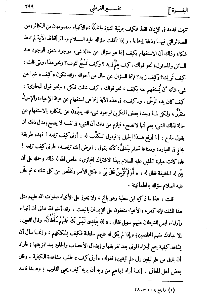 تَثْبُتُ قَدَمُهُ فِي الْإِيمَانِ فَقَطْ فَكَيْفَ بِمَرْتَبَةِ النُّبُوَّةِ وَالْخُلَّةِ، وَالْأَنْبِيَاءُ مَعْصُومُونَ مِنَ الْكَبَائِرِ وَمِنَ الصَّغَائِرِ الَّتِي فِيهَا رَذِيلَةٌ إِجْمَاعًا. وَإِذَا تَأَمَّلْتَ سُؤَالَهُ عَلَيْهِ السَّلَامُ وَسَائِرَ أَلْفَاظِ الْآيَةِ لَمْ تُعْطِ شَكًّا، وَذَلِكَ أَنَّ الِاسْتِفْهَامَ بِكَيْفَ إِنَّمَا هو سؤال عن حالة شي مَوْجُودٍ مُتَقَرِّرِ الْوُجُودِ عِنْدَ السَّائِلِ وَالْمَسْئُولِ، نَحْوَ قَوْلِكَ: كَيْفَ عِلْمُ زَيْدٍ؟ وَكَيْفَ نَسْجُ الثَّوْبِ؟ وَنَحْوَ هَذَا. وَمَتَى قُلْتَ: كَيْفَ ثَوْبُكَ؟ وَكَيْفَ زَيْدٌ؟ فَإِنَّمَا السُّؤَالُ عَنْ حَالٍ مِنْ أَحْوَالِهِ. وقد تكون" كيف" خبرا عن شي شَأْنُهُ أَنْ يُسْتَفْهَمَ عَنْهُ بِكَيْفَ، نَحْوَ قَوْلِكَ: كَيْفَ شِئْتَ فَكُنْ، وَنَحْوَ قَوْلِ الْبُخَارِيِّ: كَيْفَ كَانَ بَدْءُ الْوَحْيِ. وَ" كَيْفَ" فِي هَذِهِ الْآيَةِ إِنَّمَا هِيَ اسْتِفْهَامٌ عَنْ هَيْئَةِ الْإِحْيَاءِ، وَالْإِحْيَاءُ مُتَقَرِّرٌ، وَلَكِنْ لَمَّا وَجَدْنَا بَعْضَ الْمُنْكِرِينَ لوجود شي قَدْ يُعَبِّرُونَ عَنْ إِنْكَارِهِ بِالِاسْتِفْهَامِ عَنْ حَالَةٍ لِذَلِكَ الشَّيْءِ يُعْلَمُ أَنَّهَا لَا تَصِحُّ، فَيَلْزَمُ مِنْ ذَلِكَ أَنَّ الشَّيْءَ فِي نَفْسِهِ لَا يَصِحُّ، مِثَالُ ذَلِكَ أَنْ يَقُولَ مُدَّعٍ: أَنَا أَرْفَعُ هَذَا الْجَبَلَ، فَيَقُولُ الْمُكَذِّبُ لَهُ: أَرِنِي كَيْفَ تَرْفَعُهُ! فَهَذِهِ طَرِيقَةُ مَجَازٍ فِي الْعِبَارَةِ، وَمَعْنَاهَا تَسْلِيمٌ جَدَلِيٌّ، كَأَنَّهُ يَقُولُ: افْرِضْ أَنَّكَ تَرْفَعُهُ، فَأَرِنِي كَيْفَ تَرْفَعُهُ! فَلَمَّا كَانَتْ عِبَارَةُ الْخَلِيلِ عَلَيْهِ السَّلَامُ بِهَذَا الِاشْتِرَاكِ الْمَجَازِيِّ، خَلَّصَ اللَّهُ لَهُ ذَلِكَ وَحَمَلَهُ عَلَى أَنْ بَيَّنَ لَهُ الْحَقِيقَةَ فَقَالَ لَهُ:" أَوَلَمْ تُؤْمِنْ قالَ بَلى " فَكَمُلَ الْأَمْرُ وَتَخَلَّصَ مِنْ كُلِّ شَكٍّ، ثُمَّ عَلَّلَ عَلَيْهِ السَّلَامُ سُؤَالَهُ بِالطُّمَأْنِينَةِ. قُلْتُ: هَذَا مَا ذَكَرَهُ ابْنُ عَطِيَّةَ وَهُوَ بَالِغٌ، وَلَا يَجُوزُ عَلَى الْأَنْبِيَاءِ صَلَوَاتُ اللَّهِ عَلَيْهِمْ مِثْلُ هَذَا الشَّكِّ فَإِنَّهُ كُفْرٌ، وَالْأَنْبِيَاءُ مُتَّفِقُونَ عَلَى الْإِيمَانِ بِالْبَعْثِ. وَقَدْ أَخْبَرَ اللَّهُ تَعَالَى أَنَّ أَنْبِيَاءَهُ وَأَوْلِيَاءَهُ لَيْسَ لِلشَّيْطَانِ عَلَيْهِمْ سَبِيلٌ فَقَالَ:" إِنَّ عِبادِي لَيْسَ لَكَ عَلَيْهِمْ سُلْطانٌ" «١» وَقَالَ اللَّعِينُ: إِلَّا عِبَادَكَ مِنْهُمُ الْمُخْلَصِينَ، وَإِذَا لَمْ يَكُنْ لَهُ عَلَيْهِمْ سَلْطَنَةٌ فَكَيْفَ يُشَكِّكُهُمْ، وَإِنَّمَا سَأَلَ أَنْ يُشَاهِدَ كَيْفِيَّةَ جَمْعِ أَجْزَاءِ الْمَوْتَى بَعْدَ تَفْرِيقِهَا وَإِيصَالِ الْأَعْصَابِ وَالْجُلُودِ بَعْدَ تَمْزِيقِهَا، فَأَرَادَ أَنْ يَتَرَقَّى مِنْ عِلْمِ الْيَقِينِ إِلَى عِلْمِ الْيَقِينِ، فَقَوْلُهُ:" أَرِنِي كَيْفَ" طَلَبَ مُشَاهَدَةَ الْكَيْفِيَّةِ. وَقَالَ بَعْضُ أَهْلِ الْمَعَانِي: إِنَّمَا أَرَادَ إِبْرَاهِيمُ مِنْ رَبِّهِ أَنْ يُرِيَهُ كَيْفَ يحيى القلوب، وهذا فاسد
