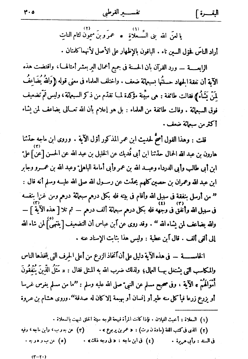 أَرَادَ النَّاسَ فَحَوَّلَ السِّينَ تَاءً. الْبَاقُونَ بِالْإِظْهَارِ عَلَى الْأَصْلِ لِأَنَّهُمَا كَلِمَتَانِ. الرابعة- وَرَدَ الْقُرْآنُ بِأَنَّ الْحَسَنَةَ فِي جَمِيعِ أَعْمَالِ الْبِرِّ بِعَشْرِ أَمْثَالِهَا، وَاقْتَضَتْ هَذِهِ الْآيَةُ أَنَّ نَفَقَةَ الْجِهَادِ حَسَنَتُهَا بِسَبْعِمِائَةِ ضِعْفٍ. وَاخْتَلَفَ الْعُلَمَاءُ فِي مَعْنَى قَوْلِهِ (وَاللَّهُ يُضاعِفُ لِمَنْ يَشاءُ) فَقَالَتْ طَائِفَةٌ: هِيَ مُبَيِّنَةٌ مُؤَكِّدَةٌ لِمَا تَقَدَّمَ مِنْ ذِكْرِ السَّبْعِمِائَةِ، وَلَيْسَ ثَمَّ تَضْعِيفٌ فَوْقَ السَّبْعِمِائَةِ. وَقَالَتْ طَائِفَةٌ مِنَ الْعُلَمَاءِ: بَلْ هُوَ إِعْلَامٌ بِأَنَّ اللَّهَ تَعَالَى يُضَاعِفُ لِمَنْ يَشَاءُ أَكْثَرَ مِنْ سَبْعِمِائَةِ ضِعْفٍ. قُلْتُ: وَهَذَا الْقَوْلُ أَصَحُّ لِحَدِيثِ ابْنِ عُمَرَ الْمَذْكُورِ أَوَّلَ الْآيَةِ. وَرَوَى ابْنُ مَاجَهْ حَدَّثَنَا هَارُونُ بْنُ عَبْدِ اللَّهِ الْحَمَّالُ حَدَّثَنَا ابْنُ أَبِي فُدَيْكٍ عَنِ الْخَلِيلِ بْنِ عَبْدِ اللَّهِ عَنِ الْحَسَنِ [عَنْ «٣»] عَلِيِّ بْنِ أَبِي طَالِبٍ وَأَبِي الدَّرْدَاءِ وَعَبْدِ الله بن عمرو وَأَبِي أُمَامَةَ الْبَاهِلِيِّ وَعَبْدِ اللَّهِ بْنِ عَمْرٍو وَجَابِرِ بْنِ عَبْدِ اللَّهِ وَعِمْرَانَ بْنِ حُصَيْنٍ كُلِّهِمْ يُحَدِّثُ عَنْ رَسُولِ اللَّهِ صَلَّى اللَّهُ عَلَيْهِ وَسَلَّمَ أَنَّهُ قَالَ:" مَنْ أَرْسَلَ بِنَفَقَةٍ فِي سَبِيلِ اللَّهِ وَأَقَامَ فِي بَيْتِهِ فَلَهُ بِكُلِّ دِرْهَمٍ سَبْعُمِائَةِ دِرْهَمٍ وَمَنْ غَزَا بِنَفْسِهِ فِي سَبِيلِ اللَّهِ وَأَنْفَقَ «٤» فِي وَجْهِهِ «٥» فَلَهُ بِكُلِّ دِرْهَمٍ سَبْعُمِائَةِ أَلْفِ دِرْهَمٍ- ثُمَّ تَلَا [هذه الآية «٦»]- والله يضاعف لمن يشاء الله". وَقَدْ رُوِيَ عَنِ ابْنِ عَبَّاسٍ أَنَّ التَّضْعِيفَ [يَنْتَهِي «٧»] لِمَنْ شَاءَ اللَّهُ إِلَى أَلْفَيْ أَلْفٍ. قَالَ ابْنُ عَطِيَّةَ: وَلَيْسَ هَذَا بِثَابِتِ الْإِسْنَادِ عَنْهُ. الْخَامِسَةُ- فِي هَذِهِ الْآيَةِ دَلِيلٌ عَلَى أَنَّ اتِّخَاذَ الزَّرْعِ مِنْ أَعْلَى الْحِرَفِ الَّتِي يَتَّخِذُهَا النَّاسُ وَالْمَكَاسِبُ الَّتِي يَشْتَغِلُ بِهَا الْعُمَّالُ، وَلِذَلِكَ ضَرَبَ اللَّهُ بِهِ الْمَثَلَ فَقَالَ:" مَثَلُ الَّذِينَ يُنْفِقُونَ أَمْوالَهُمْ" الْآيَةَ. وَفِي صَحِيحِ مُسْلِمٍ عَنِ النَّبِيِّ صَلَّى اللَّهُ عَلَيْهِ وَسَلَّمَ:" مَا مِنْ مُسْلِمٍ يَغْرِسُ غَرْسًا أَوْ يَزْرَعُ زَرْعًا فَيَأْكُلُ مِنْهُ طَيْرٌ أَوْ إِنْسَانٌ أَوْ بَهِيمَةٌ إِلَّا كَانَ لَهُ صَدَقَةً". وَرَوَى هِشَامُ بْنُ عروة