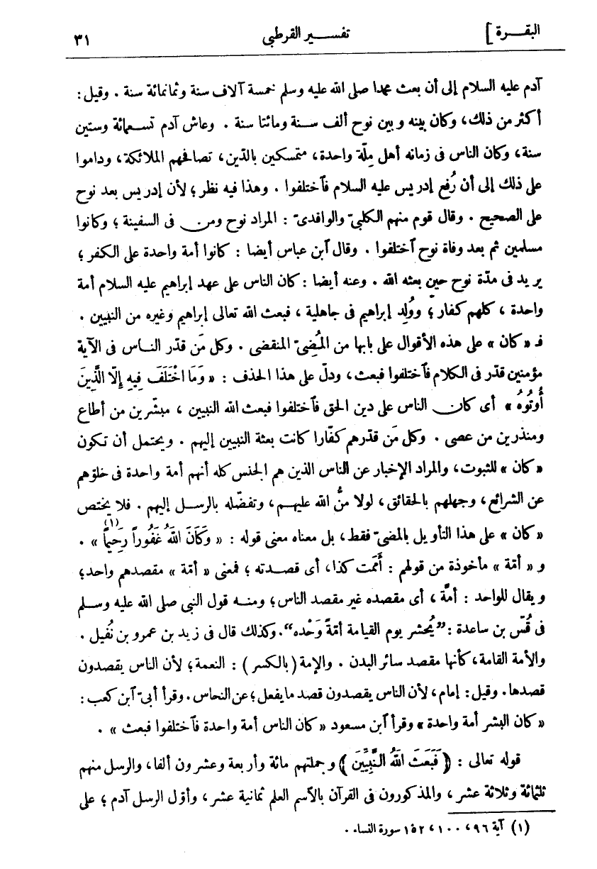 آدَمَ عَلَيْهِ السَّلَامُ إِلَى أَنْ بَعَثَ مُحَمَّدًا صَلَّى اللَّهُ عَلَيْهِ وَسَلَّمَ خَمْسَةُ آلَافِ سَنَةٍ وَثَمَانِمِائَةِ سَنَةٍ. وَقِيلَ: أَكْثَرُ مِنْ ذَلِكَ، وَكَانَ بَيْنَهُ وَبَيْنَ نُوحٍ أَلْفُ سَنَةٍ وَمِائَتَا سَنَةٍ. وَعَاشَ آدَمُ تِسْعَمِائَةٍ وَسِتِّينَ سَنَةً، وَكَانَ النَّاسُ فِي زَمَانِهِ أَهْلَ مِلَّةٍ وَاحِدَةٍ، مُتَمَسِّكِينَ بِالدِّينِ، تُصَافِحُهُمُ الْمَلَائِكَةُ، وَدَامُوا عَلَى ذَلِكَ إِلَى أَنْ رُفِعَ إِدْرِيسُ عَلَيْهِ السَّلَامُ فَاخْتَلَفُوا. وَهَذَا فِيهِ نَظَرٌ، لِأَنَّ إِدْرِيسَ بَعْدَ نُوحٍ عَلَى الصَّحِيحِ. وَقَالَ قَوْمٌ مِنْهُمُ الْكَلْبِيُّ وَالْوَاقِدِيُّ: الْمُرَادُ نُوحٌ وَمَنْ فِي السَّفِينَةِ، وَكَانُوا مُسْلِمِينَ ثُمَّ بَعْدَ وَفَاةِ نُوحٍ اخْتَلَفُوا. وَقَالَ ابْنُ عَبَّاسٍ أَيْضًا: كَانُوا أُمَّةً وَاحِدَةً عَلَى الْكُفْرِ، يُرِيدُ فِي مُدَّةِ نُوحٍ حِينَ بَعَثَهُ اللَّهُ. وَعَنْهُ أَيْضًا: كَانَ النَّاسُ عَلَى عَهْدِ إِبْرَاهِيمَ عَلَيْهِ السَّلَامُ أُمَّةً وَاحِدَةً، كُلُّهُمْ كُفَّارٌ، وَوُلِدَ إِبْرَاهِيمُ فِي جَاهِلِيَّةٍ، فَبَعَثَ اللَّهُ تَعَالَى إِبْرَاهِيمَ وَغَيْرَهُ مِنَ النَّبِيِّينَ. فَ" كَانَ" عَلَى هَذِهِ الْأَقْوَالِ عَلَى بَابِهَا مِنَ الْمُضِيِّ الْمُنْقَضِي. وَكُلُّ مَنْ قَدَّرَ النَّاسَ فِي الْآيَةِ مُؤْمِنِينَ قَدَّرَ فِي الْكَلَامِ فَاخْتَلَفُوا فَبَعَثَ، وَدَلَّ عَلَى هَذَا الْحَذْفِ:" وَمَا اخْتَلَفَ فِيهِ إِلَّا الَّذِينَ أُوتُوهُ" أَيْ كَانَ النَّاسُ عَلَى دِينِ الْحَقِّ فَاخْتَلَفُوا فَبَعَثَ اللَّهُ النَّبِيِّينَ، مُبَشِّرِينَ مَنْ أَطَاعَ وَمُنْذِرِينَ مَنْ عَصَى. وَكُلُّ مَنْ قَدَّرَهُمْ كُفَّارًا كَانَتْ بَعْثَةُ النَّبِيِّينَ إِلَيْهِمْ. وَيُحْتَمَلُ أَنْ تَكُونَ" كانَ" لِلثُّبُوتِ، وَالْمُرَادُ الْإِخْبَارُ عَنِ النَّاسِ الَّذِينَ هُمُ الْجِنْسُ كُلُّهُ أَنَّهُمْ أُمَّةٌ وَاحِدَةٌ فِي خُلُوِّهِمْ عَنِ الشَّرَائِعِ، وَجَهْلِهِمْ بِالْحَقَائِقِ، لَوْلَا مَنُّ اللَّهِ عَلَيْهِمْ، وَتَفَضُّلُهُ بِالرُّسُلِ إِلَيْهِمْ. فَلَا يَخْتَصُّ" كانَ" عَلَى هَذَا التَّأْوِيلِ بِالْمُضِيِّ فَقَطْ، بَلْ مَعْنَاهُ مَعْنَى قَوْلِهِ:" وَكانَ اللَّهُ غَفُوراً رَحِيماً «١» ". وَ" أُمَّةً" مَأْخُوذَةٌ مِنْ قَوْلِهِمْ: أَمَمْتُ كَذَا، أَيْ قَصَدْتُهُ، فَمَعْنَى" أُمَّةً" مَقْصِدُهُمْ وَاحِدٌ، وَيُقَالُ لِلْوَاحِدِ: أُمَّةٌ، أَيْ مَقْصِدُهُ غَيْرُ مَقْصِدِ النَّاسِ، وَمِنْهُ قَوْلُ النَّبِيِّ صَلَّى اللَّهُ عَلَيْهِ وَسَلَّمَ فِي قُسِّ بْنِ سَاعِدَةَ:" يُحْشَرُ يَوْمَ الْقِيَامَةِ أُمَّةً وَحْدَهُ". وَكَذَلِكَ قال في زيد بن عمر وابن نُفَيْلٍ. وَالْأُمَّةُ الْقَامَةُ، كَأَنَّهَا مَقْصِدُ سَائِرِ الْبَدَنِ. وَالْإِمَّةُ (بِالْكَسْرِ): النِّعْمَةُ، لِأَنَّ النَّاسَ يَقْصِدُونَ قَصْدَهَا. وَقِيلَ: إِمَامٌ، لِأَنَّ النَّاسَ يَقْصِدُونَ قَصْدَ مَا يَفْعَلُ، عَنِ النَّحَّاسِ. وَقَرَأَ أُبَيُّ بْنُ كَعْبٍ:" كَانَ الْبَشَرُ أُمَّةً وَاحِدَةً" وَقَرَأَ ابْنُ مَسْعُودٍ" كَانَ النَّاسُ أُمَّةً وَاحِدَةً فَاخْتَلَفُوا فَبَعَثَ". قَوْلُهُ تَعَالَى: فَبَعَثَ اللَّهُ النَّبِيِّينَ وَجُمْلَتُهُمْ مِائَةٌ وَأَرْبَعَةٌ وَعِشْرُونَ أَلْفًا، وَالرُّسُلُ مِنْهُمْ ثَلَاثُمِائَةٍ وَثَلَاثَةَ عَشَرَ، وَالْمَذْكُورُونَ فِي الْقُرْآنِ بِالِاسْمِ الْعَلَمِ ثَمَانِيَةَ عَشَرَ، وأول الرسل آدم، على