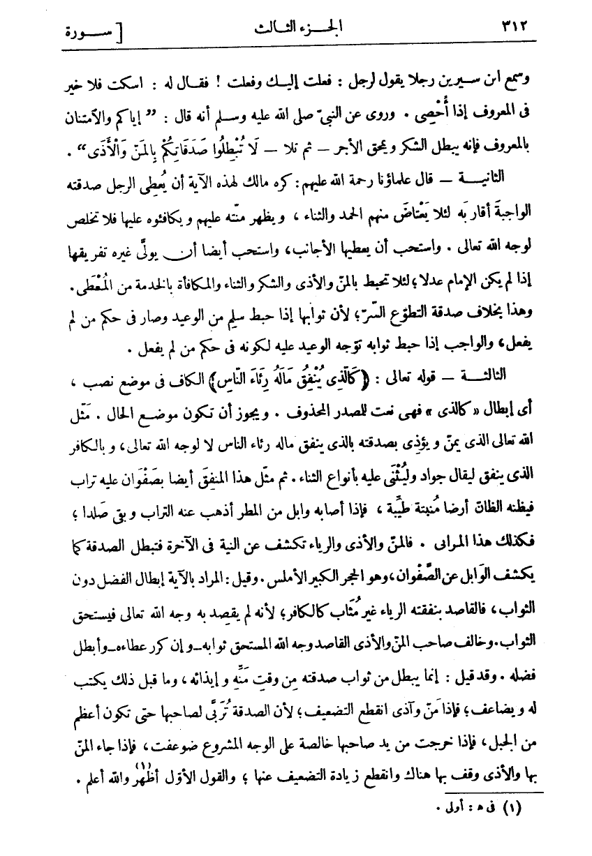 وسمع ابن سيرين رجلا يقول لرجل: وفعلت إِلَيْكَ وَفَعَلْتُ! فَقَالَ لَهُ: اسْكُتْ فَلَا خَيْرَ فِي الْمَعْرُوفِ، إِذَا أُحْصِيَ. وَرُوِيَ عَنِ النَّبِيِّ صَلَّى اللَّهُ عَلَيْهِ وَسَلَّمَ أَنَّهُ قَالَ:" إِيَّاكُمْ وَالِامْتِنَانَ بِالْمَعْرُوفِ فَإِنَّهُ يُبْطِلُ الشُّكْرَ وَيَمْحَقُ الْأَجْرَ- ثُمَّ تَلَا-" لَا تُبْطِلُوا صَدَقاتِكُمْ بِالْمَنِّ وَالْأَذى ". الثَّانِيَةُ- قَالَ عُلَمَاؤُنَا رَحْمَةُ اللَّهِ عَلَيْهِمْ: كَرِهَ مَالِكٌ لِهَذِهِ الْآيَةِ أَنْ يُعْطِيَ الرَّجُلُ صَدَقَتَهُ الْوَاجِبَةَ أَقَارِبَهُ لِئَلَّا يَعْتَاضَ مِنْهُمُ الْحَمْدَ وَالثَّنَاءَ، وَيُظْهِرَ مِنَّتَهُ عَلَيْهِمْ وَيُكَافِئُوهُ عَلَيْهَا فَلَا تَخْلُصُ لِوَجْهِ اللَّهِ تَعَالَى. وَاسْتَحَبَّ أَنْ يُعْطِيَهَا الْأَجَانِبَ، وَاسْتَحَبَّ أَيْضًا أَنْ يُوَلِّيَ غَيْرَهُ تَفْرِيقَهَا إِذَا لَمْ يَكُنِ الْإِمَامُ عَدْلًا، لِئَلَّا تَحْبَطَ بِالْمَنِّ وَالْأَذَى وَالشُّكْرِ وَالثَّنَاءِ وَالْمُكَافَأَةِ بِالْخِدْمَةِ مِنَ الْمُعْطَى. وَهَذَا بِخِلَافِ صَدَقَةِ التَّطَوُّعِ السِّرِّ، لِأَنَّ ثَوَابَهَا إِذَا حَبِطَ سَلِمَ مِنَ الْوَعِيدِ وَصَارَ فِي حُكْمِ مَنْ لَمْ يَفْعَلْ، وَالْوَاجِبُ إِذَا حَبِطَ ثَوَابُهُ تَوَجَّهَ الْوَعِيدُ عَلَيْهِ لِكَوْنِهِ فِي حُكْمِ مَنْ لَمْ يَفْعَلْ. الثَّالِثَةُ- قَوْلُهُ تَعَالَى: (كَالَّذِي يُنْفِقُ مالَهُ رِئاءَ النَّاسِ) الْكَافُ فِي مَوْضِعِ نَصْبٍ، أَيْ إِبْطَالَ" كَالَّذِي" فَهِيَ نَعْتٌ لِلْمَصْدَرِ الْمَحْذُوفِ. وَيَجُوزُ أَنْ تَكُونَ مَوْضِعَ الْحَالِ. مَثَّلَ اللَّهُ تَعَالَى الَّذِي يَمُنُّ وَيُؤْذِي بِصَدَقَتِهِ بِالَّذِي يُنْفِقُ مالَهُ رِئاءَ النَّاسِ لَا لِوَجْهِ اللَّهِ تَعَالَى، وَبِالْكَافِرِ الَّذِي يُنْفِقُ لِيُقَالَ جَوَّادٌ وَلِيُثْنَى عَلَيْهِ بِأَنْوَاعِ الثَّنَاءِ. ثُمَّ مَثَّلَ هَذَا الْمُنْفِقَ أَيْضًا بِصَفْوَانٍ عَلَيْهِ تُرَابٌ فَيَظُنُّهُ الظَّانُّ أَرْضًا مُنْبِتَةً طَيِّبَةً، فَإِذَا أَصَابَهُ وَابِلٌ مِنَ الْمَطَرِ أَذْهَبَ عَنْهُ التُّرَابَ وَبَقِيَ صَلْدًا، فَكَذَلِكَ هَذَا الْمُرَائِي. فَالْمَنُّ وَالْأَذَى وَالرِّيَاءُ تَكْشِفُ عَنِ النِّيَّةِ فِي الْآخِرَةِ فَتَبْطُلُ الصَّدَقَةُ كَمَا يَكْشِفُ الْوَابِلُ عَنِ الصَّفْوَانِ، وَهُوَ الْحَجَرُ الْكَبِيرُ الْأَمْلَسُ. وَقِيلَ: الْمُرَادُ بِالْآيَةِ إِبْطَالُ الْفَضْلِ دُونَ الثَّوَابِ، فَالْقَاصِدُ بِنَفَقَتِهِ الرِّيَاءَ غَيْرُ مُثَابٍ كَالْكَافِرِ، لِأَنَّهُ لَمْ يَقْصِدْ بِهِ وَجْهَ اللَّهِ تَعَالَى فَيَسْتَحِقُّ الثَّوَابَ. وَخَالَفَ صَاحِبُ الْمَنِّ وَالْأَذَى الْقَاصِدَ وَجْهَ اللَّهِ الْمُسْتَحِقَّ ثَوَابَهُ- وَإِنْ كَرَّرَ عَطَاءَهُ- وَأَبْطَلَ فَضْلَهُ. وَقَدْ قِيلَ: إِنَّمَا يَبْطُلُ مِنْ ثَوَابِ صَدَقَتِهِ مِنْ وَقْتِ مَنِّهِ وَإِيذَائِهِ، وَمَا قَبْلَ ذَلِكَ يُكْتَبُ لَهُ وَيُضَاعَفُ، فَإِذَا مَنَّ وَآذَى انْقَطَعَ التَّضْعِيفُ، لِأَنَّ الصَّدَقَةَ تُرْبَى لِصَاحِبِهَا حَتَّى تَكُونَ أَعْظَمَ مِنَ الْجَبَلِ، فَإِذَا خَرَجَتْ مِنْ يَدِ صَاحِبِهَا خَالِصَةً عَلَى الْوَجْهِ الْمَشْرُوعِ ضُوعِفَتْ، فَإِذَا جَاءَ الْمَنُّ بِهَا وَالْأَذَى وُقِفَ بِهَا هُنَاكَ وَانْقَطَعَ زِيَادَةُ التَّضْعِيفِ عَنْهَا، وَالْقَوْلُ الْأَوَّلُ أَظْهَرُ «١» والله أعلم.
