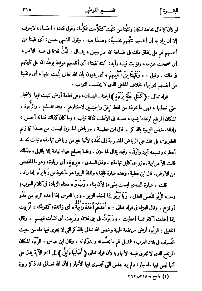 لَوْ كَانَ كَمَا قَالَ مُجَاهِدٌ لَكَانَ وَتَثَبُّتًا من تثبت ككرمت تَكَرُّمًا، وَقَوْلُ قَتَادَةَ: احْتِسَابًا، لَا يُعْرَفُ إِلَّا أَنْ يُرَادَ بِهِ أَنَّ أَنْفُسَهُمْ تُثَبِّتُهُمْ مُحْتَسِبَةً، وَهَذَا بَعِيدٌ. وَقَوْلُ الشَّعْبِيِّ حَسَنٌ، أَيْ تَثْبِيتًا مِنْ أَنْفُسِهِمْ لَهُمْ عَلَى إِنْفَاقِ ذَلِكَ فِي طَاعَةِ اللَّهِ عَزَّ وَجَلَّ، يُقَالُ: ثَبَّتُّ فُلَانًا فِي هَذَا الْأَمْرِ، أَيْ صَحَّحْتُ عَزْمَهُ، وَقَوَّيْتُ فِيهِ رَأْيَهُ، أُثَبِّتُهُ تَثْبِيتًا، أَيْ أَنْفُسُهُمْ مُوقِنَةٌ بِوَعْدِ اللَّهِ عَلَى تَثْبِيتِهِمْ فِي ذَلِكَ. وَقِيلَ:" وَتَثْبِيتاً مِنْ أَنْفُسِهِمْ" أَيْ يُقِرُّونَ بِأَنَّ اللَّهَ تَعَالَى يُثَبِّتُ عَلَيْهَا، أَيْ وَتَثْبِيتًا مِنْ أَنْفُسِهِمْ لِثَوَابِهَا، بِخِلَافِ الْمُنَافِقِ الَّذِي لَا يَحْتَسِبُ الثَّوَابَ. قَوْلُهُ تَعَالَى: (كَمَثَلِ جَنَّةٍ بِرَبْوَةٍ) الْجَنَّةُ الْبُسْتَانُ، وَهِيَ قِطْعَةُ أَرْضٍ تَنْبُتُ فِيهَا الْأَشْجَارُ حَتَّى تُغَطِّيَهَا، فَهِيَ مَأْخُوذَةٌ مِنْ لَفْظِ الْجِنِّ وَالْجَنِينِ لِاسْتِتَارِهِمْ. وَقَدْ تَقَدَّمَ. وَالرَّبْوَةُ: الْمَكَانُ الْمُرْتَفِعُ ارْتِفَاعًا يَسِيرًا، مَعَهُ فِي الْأَغْلَبِ كَثَافَةُ تُرَابٍ، وَمَا كَانَ كَذَلِكَ فَنَبَاتُهُ أَحْسَنُ، وَلِذَلِكَ خَصَّ الرَّبْوَةَ بِالذِّكْرِ. قَالَ ابْنُ عَطِيَّةَ: وَرِيَاضُ الْحَزْنِ لَيْسَتْ مِنْ هَذَا كَمَا زَعَمَ الطَّبَرِيُّ، بَلْ تِلْكَ هِيَ الرِّيَاضُ الْمَنْسُوبَةُ إِلَى نَجْدٍ، لِأَنَّهَا خَيْرٌ مِنْ رِيَاضِ تِهَامَةَ، وَنَبَاتُ نَجْدٍ أَعْطَرُ، وَنَسِيمُهُ أَبْرَدُ وَأَرَقُّ، وَنَجْدٌ يُقَالُ لَهَا حَزْنُ. وَقَلَّمَا يَصْلُحُ هَوَاءُ تِهَامَةَ إِلَّا بِاللَّيْلِ، وَلِذَلِكَ قَالَتِ الْأَعْرَابِيَّةُ:" زَوْجِي كَلَيْلِ تِهَامَةَ". وَقَالَ السُّدِّيُّ:" بِرَبْوَةٍ" أَيْ بِرَبَاوَةٍ، وَهُوَ مَا انْخَفَضَ مِنَ الْأَرْضِ. قَالَ ابْنُ عَطِيَّةَ: وَهَذِهِ عِبَارَةٌ قَلِقَةٌ، وَلَفْظُ الرَّبْوَةِ هُوَ مَأْخُوذٌ مِنْ رَبَا يَرْبُو إِذَا زَادَ. قُلْتُ: عِبَارَةُ السُّدِّيِّ لَيْسَتْ بِشَيْءٍ، لِأَنَّ بناء" رب و" مَعْنَاهُ الزِّيَادَةُ فِي كَلَامِ الْعَرَبِ، وَمِنْهُ الرَّبْوُ لِلنَّفَسِ الْعَالِي. رَبَا يَرْبُو إِذَا أَخَذَهُ الرَّبْوُ. وَرَبَا الْفَرَسُ إِذَا أَخَذَهُ الرَّبْوُ مِنْ عَدْوٍ أَوْ فَزَعٍ. وَقَالَ الْفَرَّاءُ فِي قَوْلِهِ تَعَالَى:" فَأَخَذَهُمْ أَخْذَةً رابِيَةً «١» " أَيْ زَائِدَةً، كَقَوْلِكَ: أَرْبَيْتُ إِذَا أَخَذْتَ أَكْثَرَ مِمَّا أَعْطَيْتَ. وَرَبَوْتُ فِي بَنِي فُلَانٍ وَرَبِيتُ أَيْ نَشَأْتُ فِيهِمْ. وَقَالَ الْخَلِيلُ: الرَّبْوَةُ أَرْضٌ مُرْتَفِعَةٌ طَيِّبَةٌ وَخَصَّ اللَّهُ تَعَالَى بِالذِّكْرِ الَّتِي لَا يَجْرِي فِيهَا مَاءٌ مِنْ حَيْثُ الْعُرْفِ فِي بِلَادِ الْعَرَبِ، فَمَثَّلَ لَهُمْ مَا يُحِسُّونَهُ وَيُدْرِكُونَهُ. وَقَالَ ابْنُ عَبَّاسٍ: الرَّبْوَةُ الْمَكَانُ الْمُرْتَفِعُ الَّذِي لَا تَجْرِي فِيهِ الْأَنْهَارُ، لِأَنَّ قَوْلَهُ تَعَالَى: (أَصابَها وابِلٌ) إِلَى آخِرِ الْآيَةِ يَدُلُّ عَلَى أَنَّهَا لَيْسَ فِيهَا مَاءٌ جَارٍ، وَلَمْ يُرِدْ جِنْسَ الَّتِي تَجْرِي فِيهَا الْأَنْهَارُ، لِأَنَّ اللَّهَ تَعَالَى قَدْ ذَكَرَ رَبْوَةً