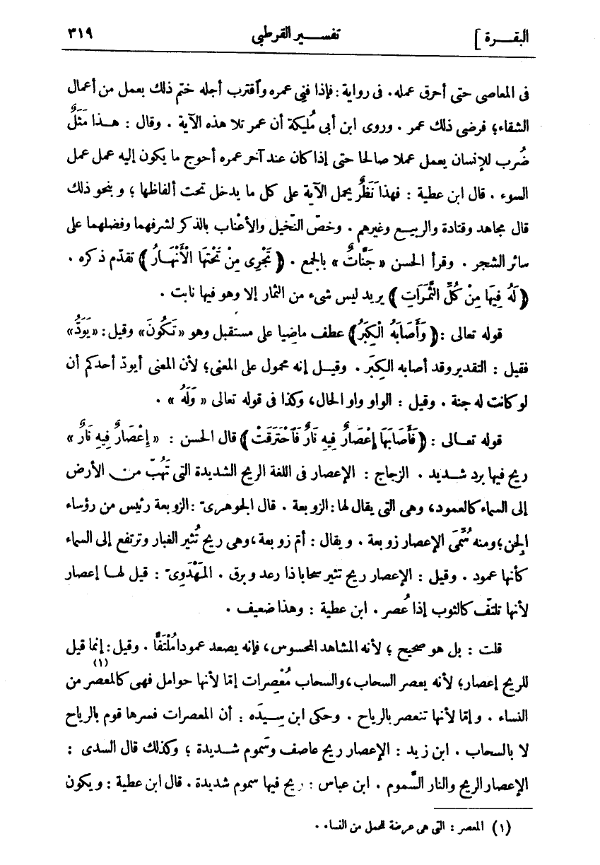 فِي الْمَعَاصِي حَتَّى أَحْرَقَ عَمَلَهُ. فِي رِوَايَةٍ: فَإِذَا فَنِيَ عُمُرُهُ وَاقْتَرَبَ أَجَلُهُ خَتَمَ ذَلِكَ بِعَمَلٍ مِنْ أَعْمَالِ الشَّقَاءِ، فَرَضِيَ ذَلِكَ عُمَرُ. وَرَوَى ابْنُ أَبِي مُلَيْكَةَ أَنَّ عُمَرَ تَلَا هَذِهِ الْآيَةَ. وَقَالَ: هَذَا مَثَلٌ ضُرِبَ لِلْإِنْسَانِ يَعْمَلُ عَمَلًا صَالِحًا حَتَّى إِذَا كَانَ عِنْدَ آخِرِ عُمُرِهِ أَحْوَجَ مَا يَكُونُ إِلَيْهِ عَمِلَ عَمَلَ السُّوءِ. قَالَ ابْنُ عَطِيَّةَ: فَهَذَا نَظَرٌ يَحْمِلُ الْآيَةَ عَلَى كُلِّ مَا يَدْخُلُ تَحْتَ أَلْفَاظِهَا، وَبِنَحْوِ ذَلِكَ قَالَ مُجَاهِدٌ وَقَتَادَةُ وَالرَّبِيعُ وَغَيْرُهُمْ. وَخَصَّ النَّخِيلَ وَالْأَعْنَابَ بِالذِّكْرِ لِشَرَفِهِمَا وَفَضْلِهِمَا عَلَى سَائِرِ الشَّجَرِ. وَقَرَأَ الْحَسَنُ" جَنَّاتٌ" بِالْجَمْعِ. (تَجْرِي مِنْ تَحْتِهَا الْأَنْهارُ) تَقَدَّمَ ذِكْرُهُ. (لَهُ فِيها مِنْ كُلِّ الثَّمَراتِ) يريد ليس شي مِنَ الثِّمَارِ إِلَّا وَهُوَ فِيهَا نَابِتٌ. قَوْلُهُ تَعَالَى: (وَأَصابَهُ الْكِبَرُ) عَطَفَ مَاضِيًا عَلَى مُسْتَقْبَلٍ وَهُوَ" تَكُونَ" وَقِيلَ:" يَوَدُّ" فَقِيلَ: التَّقْدِيرُ وَقَدْ أَصَابَهُ الْكِبَرُ. وَقِيلَ إِنَّهُ مَحْمُولٌ عَلَى الْمَعْنَى، لِأَنَّ الْمَعْنَى أَيَوَدُّ أَحَدُكُمْ أَنْ لَوْ كَانَتْ لَهُ جَنَّةٌ. وَقِيلَ: الْوَاوُ وَاوُ الْحَالِ، وَكَذَا فِي قَوْلِهِ تَعَالَى" وَلَهُ". قَوْلُهُ تَعَالَى: (فَأَصابَها إِعْصارٌ فِيهِ نارٌ فَاحْتَرَقَتْ) قَالَ الْحَسَنُ:" إِعْصارٌ فِيهِ نارٌ" رِيحٌ فِيهَا بَرْدٌ شَدِيدٌ. الزَّجَّاجُ: الْإِعْصَارُ فِي اللُّغَةِ الرِّيحُ الشَّدِيدَةُ الَّتِي تَهُبُّ مِنَ الْأَرْضِ إِلَى السَّمَاءِ كَالْعَمُودِ، وَهِيَ الَّتِي يُقَالُ لَهَا: الزَّوْبَعَةُ. قَالَ الْجَوْهَرِيُّ: الزَّوْبَعَةُ رَئِيسٌ مِنْ رُؤَسَاءِ الْجِنِّ، وَمِنْهُ سُمِّيَ الْإِعْصَارُ زَوْبَعَةً. وَيُقَالُ: أُمُّ زَوْبَعَةٍ، وَهِيَ رِيحٌ تُثِيرُ الْغُبَارَ وَتَرْتَفِعُ إِلَى السَّمَاءِ كَأَنَّهَا عَمُودٌ. وَقِيلَ: الْإِعْصَارُ رِيحٌ تُثِيرُ سَحَابًا ذَا رَعْدٍ وَبَرْقٍ. الْمَهْدَوِيُّ: قِيلَ لَهَا إِعْصَارٌ لِأَنَّهَا تَلْتَفُّ كَالثَّوْبِ إِذَا عُصِرَ. ابْنُ عَطِيَّةَ: وَهَذَا ضَعِيفٌ. قُلْتُ: بَلْ هُوَ صَحِيحٌ، لِأَنَّهُ الْمُشَاهَدُ الْمَحْسُوسُ، فَإِنَّهُ يَصْعَدُ عَمُودًا مُلْتَفًّا. وَقِيلَ: إِنَّمَا قِيلَ لِلرِّيحِ إِعْصَارٌ، لِأَنَّهُ يَعْصِرُ السَّحَابَ، وَالسَّحَابُ مُعْصِرَاتٌ إِمَّا لِأَنَّهَا حَوَامِلُ فَهِيَ كَالْمُعْصِرِ «١» مِنَ النِّسَاءِ. وَإِمَّا لِأَنَّهَا تَنْعَصِرُ بِالرِّيَاحِ. وَحَكَى ابْنُ سِيدَهْ: أَنَّ الْمُعْصِرَاتِ فَسَّرَهَا قَوْمٌ بِالرِّيَاحِ لَا بِالسَّحَابِ. ابْنُ زَيْدٍ: الْإِعْصَارُ رِيحٌ عَاصِفٌ وَسَمُومٌ شَدِيدَةٌ، وَكَذَلِكَ قَالَ السُّدِّيُّ: الْإِعْصَارُ الرِّيحُ وَالنَّارُ السَّمُومُ. ابْنُ عَبَّاسٍ: رِيحٌ فِيهَا سَمُومٌ شَدِيدَةٌ. قَالَ ابْنُ عَطِيَّةَ: ويكون
