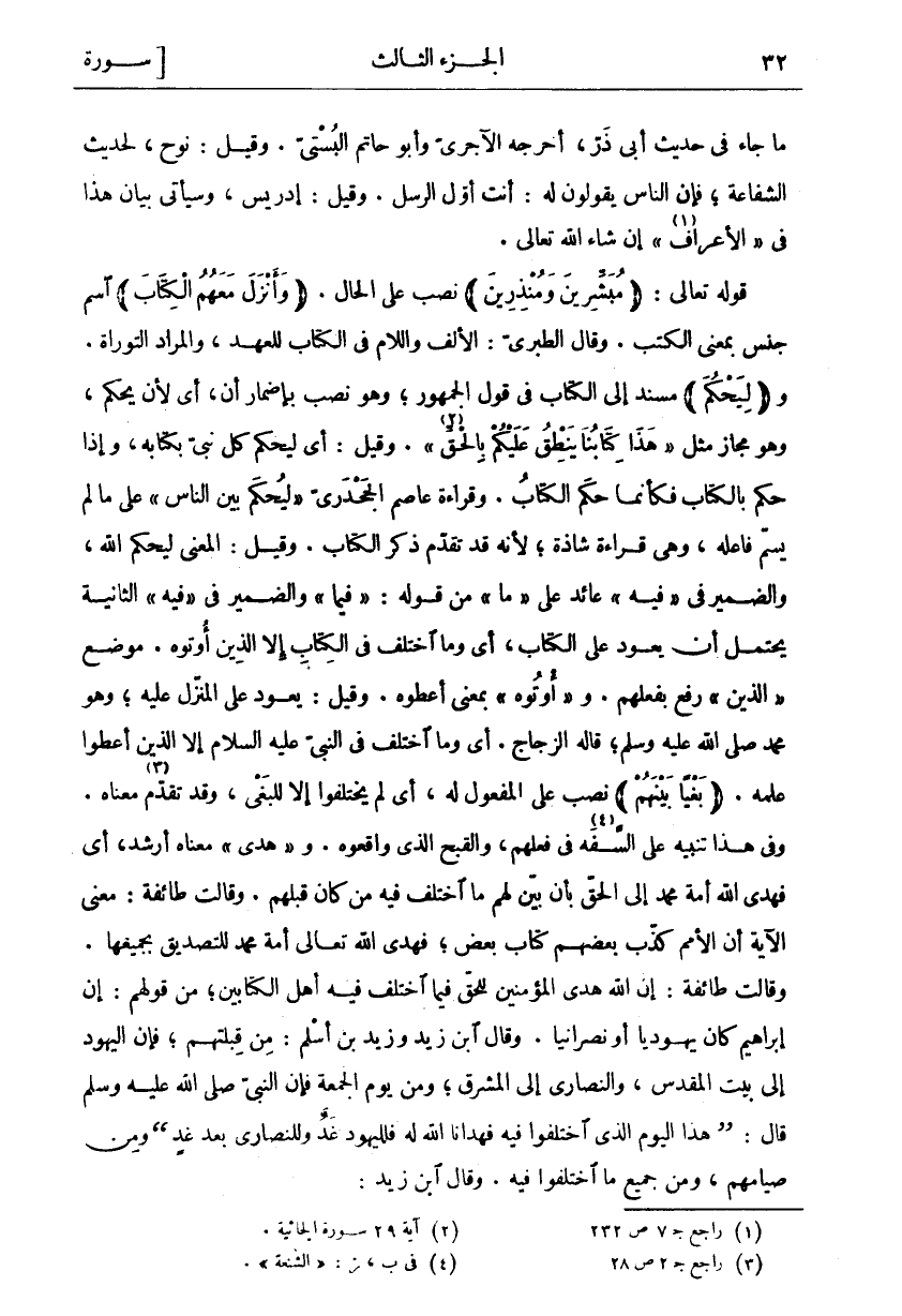 مَا جَاءَ فِي حَدِيثِ أَبِي ذَرٍّ، أَخْرَجَهُ الْآجُرِّيُّ وَأَبُو حَاتِمٍ الْبُسْتِيُّ. وَقِيلَ: نُوحٌ، لِحَدِيثِ الشَّفَاعَةِ، فَإِنَّ النَّاسَ يَقُولُونَ لَهُ: أَنْتَ أَوَّلُ الرُّسُلِ. وَقِيلَ: إِدْرِيسُ، وَسَيَأْتِي بَيَانُ هَذَا فِي" الْأَعْرَافِ" «١» إِنْ شَاءَ اللَّهُ تَعَالَى. قَوْلُهُ تَعَالَى: مُبَشِّرِينَ وَمُنْذِرِينَ نَصْبٌ عَلَى الْحَالِ. وَأَنْزَلَ مَعَهُمُ الْكِتابَ اسْمُ جِنْسٍ بِمَعْنَى الْكُتُبِ. وَقَالَ الطَّبَرِيُّ: الْأَلِفُ واللام في الكتاب للعهد، والمراد التوراة. ولِيَحْكُمَ مُسْنَدٌ إِلَى الْكِتَابِ فِي قَوْلِ الْجُمْهُورِ، وَهُوَ نَصْبٌ بِإِضْمَارِ أَنْ، أَيْ لِأَنْ يَحْكُمَ، وَهُوَ مَجَازٌ مِثْلَ" هَذَا كِتابُنا يَنْطِقُ عَلَيْكُمْ بِالْحَقِّ «٢» ". وَقِيلَ: أَيْ لِيَحْكُمَ كُلُّ نَبِيٍّ بِكِتَابِهِ، وَإِذَا حَكَمَ بِالْكِتَابِ فَكَأَنَّمَا حَكَمَ الْكِتَابُ. وَقِرَاءَةُ عَاصِمٍ الْجَحْدَرِيِّ" لِيُحْكَمَ بَيْنَ النَّاسِ" عَلَى مَا لَمْ يُسَمَّ فَاعِلُهُ، وَهِيَ قِرَاءَةٌ شَاذَّةٌ، لِأَنَّهُ قَدْ تَقَدَّمَ ذِكْرُ الْكِتَابِ. وَقِيلَ: الْمَعْنَى لِيَحْكُمَ اللَّهُ، وَالضَّمِيرُ فِي" فِيهِ" عَائِدٌ عَلَى" مَا" مِنْ قَوْلِهِ:" فِيمَا" وَالضَّمِيرُ فِي" فِيهِ" الثَّانِيَةِ يُحْتَمَلُ أَنْ يَعُودَ عَلَى الْكِتَابِ، أَيْ وَمَا اخْتَلَفَ فِي الْكِتَابِ إِلَّا الَّذِينَ أُوتُوهُ. مَوْضِعُ" الَّذِينَ" رَفْعٌ بِفِعْلِهِمْ. وَ" أُوتُوهُ" بِمَعْنَى أُعْطُوهُ. وَقِيلَ: يَعُودُ عَلَى الْمُنَزَّلِ عَلَيْهِ، وَهُوَ مُحَمَّدٌ صَلَّى اللَّهُ عَلَيْهِ وَسَلَّمَ، قَالَهُ الزَّجَّاجُ. أَيْ وَمَا اخْتَلَفَ فِي النَّبِيِّ عَلَيْهِ السَّلَامُ إِلَّا الَّذِينَ أُعْطُوا عِلْمَهُ. (بَغْياً بَيْنَهُمْ) نُصِبَ عَلَى الْمَفْعُولِ لَهُ، أَيْ لَمْ يَخْتَلِفُوا إِلَّا لِلْبَغْيِ، وَقَدْ تَقَدَّمَ «٣» مَعْنَاهُ. وَفِي هَذَا تَنْبِيهٌ عَلَى السَّفَهِ «٤» في فعلهم، والقبح الذي واقعوه. و" فَهَدَى" مَعْنَاهُ أَرْشَدَ، أَيْ فَهَدَى اللَّهُ أُمَّةَ مُحَمَّدٍ إِلَى الْحَقِّ بِأَنْ بَيَّنَ لَهُمْ مَا اخْتَلَفَ فِيهِ مَنْ كَانَ قَبْلَهُمْ. وَقَالَتْ طَائِفَةٌ: مَعْنَى الْآيَةِ أَنَّ الْأُمَمَ كَذَّبَ بَعْضُهُمْ كِتَابَ بَعْضٍ، فَهَدَى اللَّهُ تَعَالَى أُمَّةَ مُحَمَّدٍ لِلتَّصْدِيقِ بِجَمِيعِهَا. وَقَالَتْ طَائِفَةٌ: إِنَّ اللَّهَ هَدَى الْمُؤْمِنِينَ لِلْحَقِّ فِيمَا اخْتَلَفَ فِيهِ أَهْلُ الْكِتَابَيْنِ، مِنْ قَوْلِهِمْ: إِنَّ إِبْرَاهِيمَ كَانَ يَهُودِيًّا أَوْ نَصْرَانِيًّا. وَقَالَ ابْنُ زَيْدٍ وَزَيْدُ بْنُ أَسْلَمَ: مِنْ قِبْلَتِهِمْ، فَإِنَّ الْيَهُودَ إِلَى بَيْتِ الْمَقْدِسِ، وَالنَّصَارَى إِلَى الْمَشْرِقِ، وَمِنْ يَوْمِ الْجُمُعَةِ فَإِنَّ النَّبِيَّ صَلَّى اللَّهُ عَلَيْهِ وَسَلَّمَ قَالَ:" هَذَا الْيَوْمُ الَّذِي اخْتَلَفُوا فِيهِ فَهَدَانَا اللَّهُ لَهُ فَلِلْيَهُودِ غَدٌ وَلِلنَّصَارَى بَعْدَ غَدٍ" وَمِنْ صِيَامِهِمْ، وَمِنْ جَمِيعِ ما اختلفوا فيه. وقال ابن زيد: