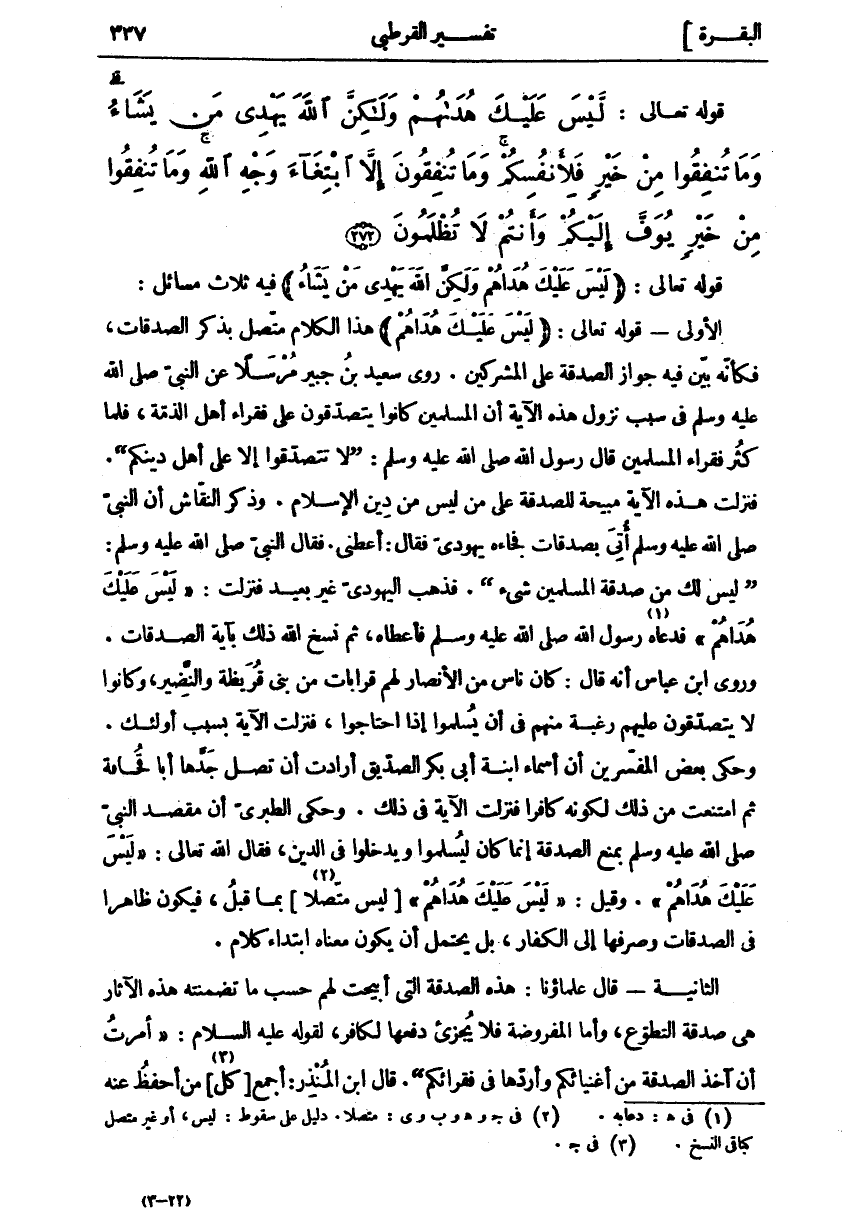 لَيْسَ عَلَيْكَ هُداهُمْ وَلكِنَّ اللَّهَ يَهْدِي مَنْ يَشاءُ وَما تُنْفِقُوا مِنْ خَيْرٍ فَلِأَنْفُسِكُمْ وَما تُنْفِقُونَ إِلاَّ ابْتِغاءَ وَجْهِ اللَّهِ وَما تُنْفِقُوا مِنْ خَيْرٍ يُوَفَّ إِلَيْكُمْ وَأَنْتُمْ لَا تُظْلَمُونَ (٢٧٢)