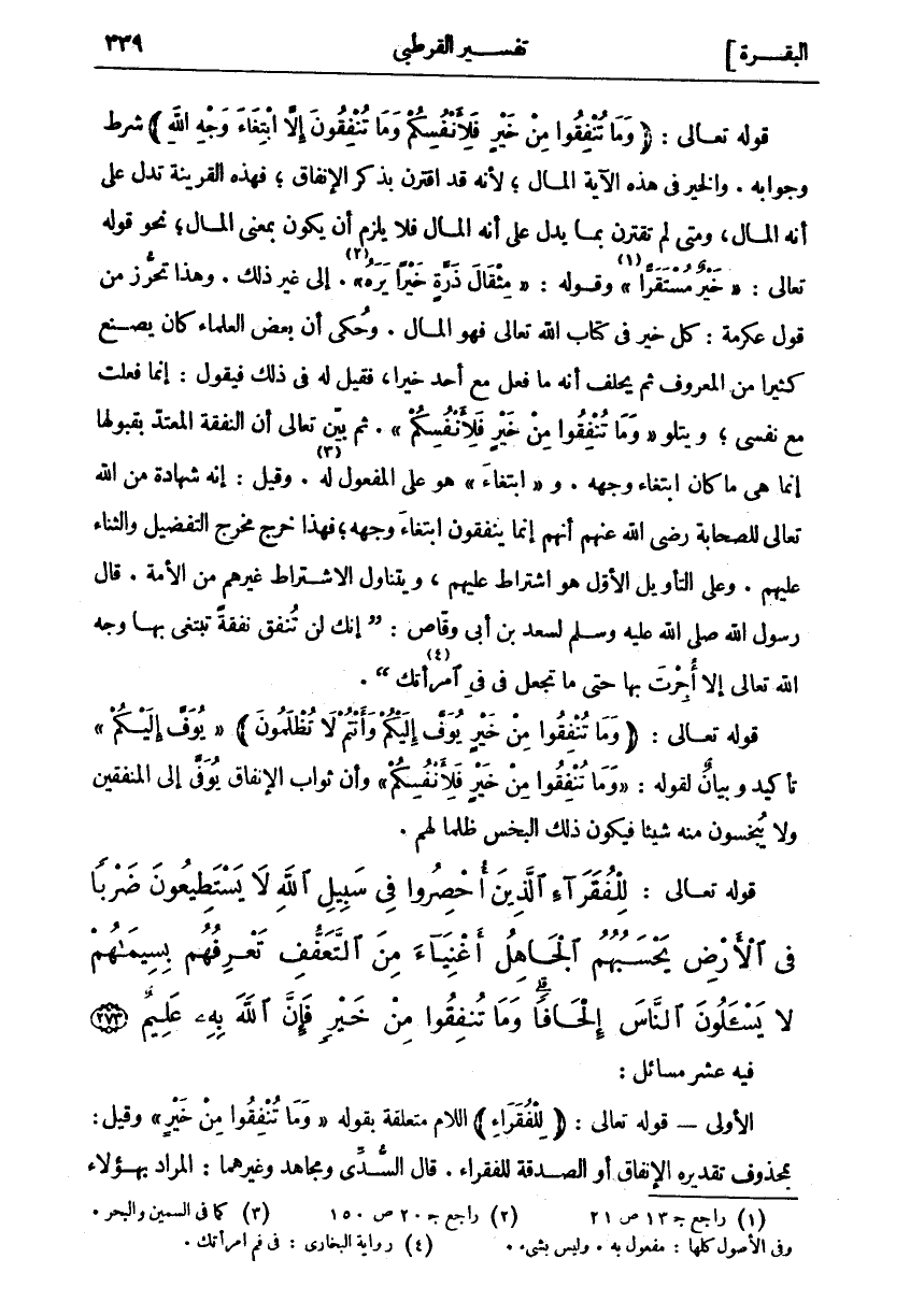 فِيهِ عَشْرُ مَسَائِلَ: الْأُولَى- قَوْلُهُ تَعَالَى: (لِلْفُقَراءِ) اللَّامُ مُتَعَلِّقَةٌ بِقَوْلِهِ" وَما تُنْفِقُوا مِنْ خَيْرٍ" وَقِيلَ: بِمَحْذُوفٍ تَقْدِيرُهُ الْإِنْفَاقُ أَوِ الصَّدَقَةُ لِلْفُقَرَاءِ. قَالَ السُّدِّيُّ وَمُجَاهِدٌ وَغَيْرُهُمَا: المراد بهؤلاء