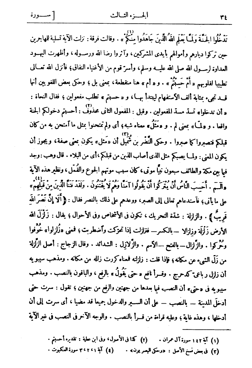 " أَمْ حَسِبْتُمْ أَنْ تَدْخُلُوا الْجَنَّةَ وَلَمَّا يَعْلَمِ اللَّهُ الَّذِينَ جاهَدُوا مِنْكُمْ «١» ". وَقَالَتْ فِرْقَةٌ: نَزَلَتِ الْآيَةُ تَسْلِيَةً لِلْمُهَاجِرِينَ حِينَ تَرَكُوا دِيَارَهُمْ وَأَمْوَالَهُمْ بِأَيْدِي الْمُشْرِكِينَ، وَآثَرُوا رِضَا اللَّهِ وَرَسُولِهِ، وَأَظْهَرَتِ الْيَهُودُ الْعَدَاوَةَ لِرَسُولِ اللَّهِ صَلَّى اللَّهُ عَلَيْهِ وَسَلَّمَ، وَأَسَرَّ قَوْمٌ مِنَ الْأَغْنِيَاءِ النِّفَاقَ، فَأَنْزَلَ اللَّهُ تَعَالَى تَطْيِيبًا لِقُلُوبِهِمْ" أَمْ حَسِبْتُمْ". وَ" أَمْ" هُنَا مُنْقَطِعَةٌ، بِمَعْنَى بَلْ، وَحَكَى بَعْضُ اللغويين أنها قد تجئ بِمَثَابَةِ أَلِفِ الِاسْتِفْهَامِ لِيُبْتَدَأَ بِهَا، وَ" حَسِبْتُمْ" تَطْلُبُ مَفْعُولَيْنِ، فَقَالَ النُّحَاةُ:" أَنْ تَدْخُلُوا" تَسُدُّ مَسَدَّ الْمَفْعُولَيْنِ. وَقِيلَ: الْمَفْعُولُ الثَّانِي مَحْذُوفٌ «٢»: أَحَسِبْتُمْ دُخُولَكُمُ الْجَنَّةَ وَاقِعًا. وَ" لَمَّا" بِمَعْنَى لَمْ. وَ" مَثَلُ" مَعْنَاهُ شَبَهُ، أَيْ وَلَمْ تُمْتَحَنُوا بِمِثْلِ مَا امْتُحِنَ بِهِ مَنْ كَانَ قَبْلَكُمْ فَتَصْبِرُوا كَمَا صَبَرُوا. وَحَكَى النَّضْرُ بْنُ شُمَيْلٍ «٣» أَنَّ" مَثَلُ" يَكُونُ بِمَعْنَى صِفَةٍ، وَيَجُوزُ أَنْ يَكُونَ الْمَعْنَى: وَلَمَّا يُصِبْكُمْ مِثْلُ الَّذِي أَصَابَ الَّذِينَ مِنْ قَبْلِكُمْ، أَيْ مِنَ الْبَلَاءِ. قَالَ وَهْبٌ: وُجِدَ فِيمَا بَيْنَ مَكَّةَ وَالطَّائِفِ سَبْعُونَ نَبِيًّا مَوْتَى، كَانَ سَبَبُ مَوْتِهِمُ الْجُوعَ وَالْقُمَّلَ، وَنَظِيرُ هَذِهِ الْآيَةِ" الم. أَحَسِبَ النَّاسُ أَنْ يُتْرَكُوا أَنْ يَقُولُوا آمَنَّا وَهُمْ لَا يُفْتَنُونَ. وَلَقَدْ فَتَنَّا الَّذِينَ مِنْ قَبْلِهِمْ «٤» " عَلَى مَا يَأْتِي، فَاسْتَدْعَاهُمْ تَعَالَى إِلَى الصَّبْرِ، وَوَعَدَهُمْ عَلَى ذَلِكَ بِالنَّصْرِ فَقَالَ: (أَلا إِنَّ نَصْرَ اللَّهِ قَرِيبٌ). وَالزَّلْزَلَةُ: شِدَّةُ التَّحْرِيكِ، تَكُونُ فِي الْأَشْخَاصِ وَفِي الْأَحْوَالِ، يُقَالُ: زَلْزَلَ اللَّهُ الْأَرْضَ زَلْزَلَةً وَزِلْزَالًا- بِالْكَسْرِ- فَتَزَلْزَلَتْ إِذَا تَحَرَّكَتْ وَاضْطَرَبَتْ، فَمَعْنَى" زُلْزِلُوا" خُوِّفُوا وَحُرِّكُوا. وَالزَّلْزَالُ- بِالْفَتْحِ- الِاسْمُ. وَالزَّلَازِلُ: الشَّدَائِدُ. وَقَالَ الزَّجَّاجُ: أَصْلُ الزَّلْزَلَةِ مِنْ زَلَّ الشَّيْءُ عَنْ مَكَانِهِ، فَإِذَا قُلْتُ: زَلْزَلْتُهُ فَمَعْنَاهُ كَرَّرْتُ زَلَلَهُ مِنْ مَكَانِهِ. وَمَذْهَبُ سِيبَوَيْهِ أَنَّ زَلْزَلَ رُبَاعِيٌّ كَدَحْرَجَ. وَقَرَأَ نَافِعٌ" حَتَّى يَقُولُ" بِالرَّفْعِ، وَالْبَاقُونَ بِالنَّصْبِ. وَمَذْهَبُ سِيبَوَيْهِ فِي" حَتَّى" أَنَّ النَّصْبَ فِيمَا بَعْدَهَا مِنْ جِهَتَيْنِ وَالرَّفْعُ مِنْ جِهَتَيْنِ، تَقُولُ: سِرْتُ حَتَّى أَدْخُلَ الْمَدِينَةَ- بِالنَّصْبِ- عَلَى أَنَّ السَّيْرَ وَالدُّخُولَ جَمِيعًا قَدْ مَضَيَا، أَيْ سِرْتُ إِلَى أَنْ أَدْخُلَهَا، وَهَذِهِ غَايَةٌ، وَعَلَيْهِ قِرَاءَةُ مَنْ قَرَأَ بِالنَّصْبِ. وَالْوَجْهُ الآخر في النصب في غير الآية