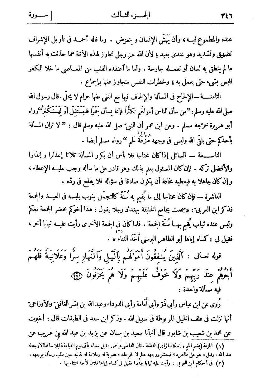 الَّذِينَ يُنْفِقُونَ أَمْوالَهُمْ بِاللَّيْلِ وَالنَّهارِ سِرًّا وَعَلانِيَةً فَلَهُمْ أَجْرُهُمْ عِنْدَ رَبِّهِمْ وَلا خَوْفٌ عَلَيْهِمْ وَلا هُمْ يَحْزَنُونَ (٢٧٤)