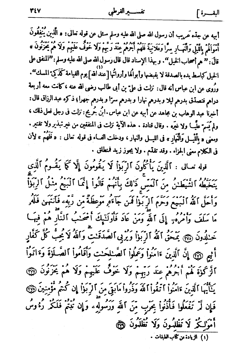 الَّذِينَ يَأْكُلُونَ الرِّبا لَا يَقُومُونَ إِلاَّ كَما يَقُومُ الَّذِي يَتَخَبَّطُهُ الشَّيْطانُ مِنَ الْمَسِّ ذلِكَ بِأَنَّهُمْ قالُوا إِنَّمَا الْبَيْعُ مِثْلُ الرِّبا وَأَحَلَّ اللَّهُ الْبَيْعَ وَحَرَّمَ الرِّبا فَمَنْ جاءَهُ مَوْعِظَةٌ مِنْ رَبِّهِ فَانْتَهى فَلَهُ مَا سَلَفَ وَأَمْرُهُ إِلَى اللَّهِ وَمَنْ عادَ فَأُولئِكَ أَصْحابُ النَّارِ هُمْ فِيها خالِدُونَ (٢٧٥) يَمْحَقُ اللَّهُ الرِّبا وَيُرْبِي الصَّدَقاتِ وَاللَّهُ لَا يُحِبُّ كُلَّ كَفَّارٍ أَثِيمٍ (٢٧٦) إِنَّ الَّذِينَ آمَنُوا وَعَمِلُوا الصَّالِحاتِ وَأَقامُوا الصَّلاةَ وَآتَوُا الزَّكاةَ لَهُمْ أَجْرُهُمْ عِنْدَ رَبِّهِمْ وَلا خَوْفٌ عَلَيْهِمْ وَلا هُمْ يَحْزَنُونَ (٢٧٧) يَا أَيُّهَا الَّذِينَ آمَنُوا اتَّقُوا اللَّهَ وَذَرُوا مَا بَقِيَ مِنَ الرِّبا إِنْ كُنْتُمْ مُؤْمِنِينَ (٢٧٨) فَإِنْ لَمْ تَفْعَلُوا فَأْذَنُوا بِحَرْبٍ مِنَ اللَّهِ وَرَسُولِهِ وَإِنْ تُبْتُمْ فَلَكُمْ رُؤُسُ أَمْوالِكُمْ لا تَظْلِمُونَ وَلا تُظْلَمُونَ (٢٧٩)