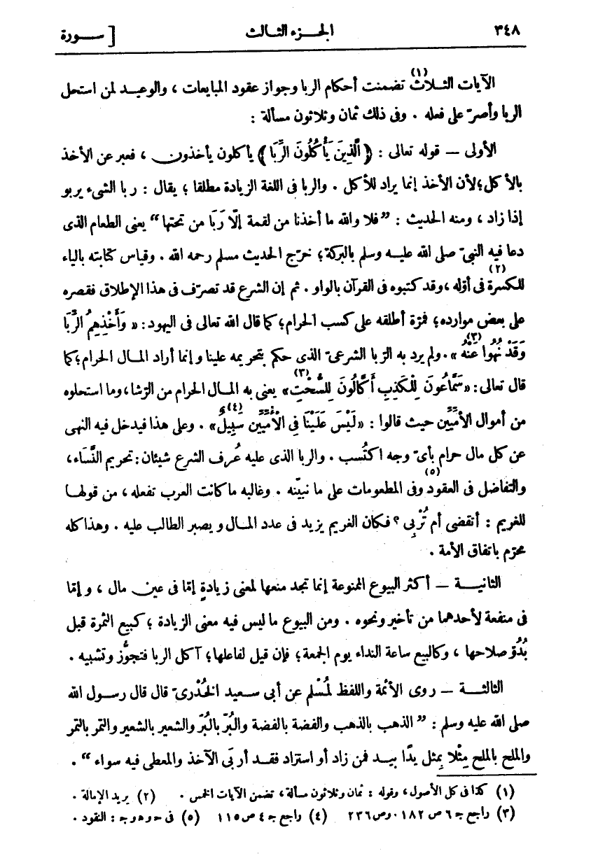 الْآيَاتُ الثَّلَاثُ «١» تَضَمَّنَتْ أَحْكَامَ الرِّبَا وَجَوَازَ عُقُودِ الْمُبَايِعَاتِ، وَالْوَعِيدَ لِمَنْ اسْتَحَلَّ الرِّبَا وَأَصَرَّ عَلَى فِعْلِهِ. وَفِي ذَلِكَ ثَمَانٌ وَثَلَاثُونَ مَسْأَلَةً: الْأُولَى- قَوْلُهُ تَعَالَى: (الَّذِينَ يَأْكُلُونَ الرِّبا) يَأْكُلُونَ يَأْخُذُونَ، فَعَبَّرَ عَنِ الْأَخْذِ بِالْأَكْلِ، لِأَنَّ الْأَخْذَ إِنَّمَا يُرَادُ لِلْأَكْلِ. وَالرِّبَا فِي اللُّغَةِ الزِّيَادَةُ مُطْلَقًا، يُقَالُ: رَبَا الشَّيْءُ يَرْبُو إِذَا زَادَ، وَمِنْهُ الْحَدِيثُ:" فَلَا وَاللَّهِ مَا أَخَذْنَا مِنْ لُقْمَةٍ إِلَّا رَبَا مِنْ تَحْتِهَا" يَعْنِي الطَّعَامَ الَّذِي دَعَا فِيهِ النَّبِيُّ صَلَّى اللَّهُ عَلَيْهِ وَسَلَّمَ بِالْبَرَكَةِ، خَرَّجَ الْحَدِيثَ مُسْلِمٌ رَحِمَهُ اللَّهُ. وَقِيَاسُ كِتَابَتِهِ بِالْيَاءِ لِلْكَسْرَةِ «٢» فِي أَوَّلِهِ، وَقَدْ كَتَبُوهُ فِي الْقُرْآنِ بِالْوَاوِ. ثُمَّ إِنَّ الشَّرْعَ قَدْ تَصَرَّفَ فِي هَذَا الْإِطْلَاقِ فَقَصَرَهُ عَلَى بَعْضِ مَوَارِدِهِ، فَمَرَّةً أَطْلَقَهُ عَلَى كَسْبِ الْحَرَامِ، كَمَا قال الله تعالى في اليهود:" وَأَخْذِهِمُ الرِّبَوا وَقَدْ نُهُوا عَنْهُ «٣» ". وَلَمْ يُرِدْ بِهِ الرِّبَا الشَّرْعِيَّ الَّذِي حُكِمَ بِتَحْرِيمِهِ عَلَيْنَا وَإِنَّمَا أَرَادَ الْمَالَ الْحَرَامَ، كَمَا قَالَ تَعَالَى:" سَمَّاعُونَ لِلْكَذِبِ أَكَّالُونَ لِلسُّحْتِ «٤» " يَعْنِي بِهِ الْمَالَ الْحَرَامَ مِنَ الرِّشَا، وَمَا اسْتَحَلُّوهُ مِنْ أَمْوَالِ الْأُمِّيِّينَ حَيْثُ قَالُوا:" لَيْسَ عَلَيْنا فِي الْأُمِّيِّينَ سَبِيلٌ «٥» ". وَعَلَى هَذَا فَيَدْخُلُ فِيهِ النَّهْيُ عَنْ كُلِّ مَالٍ حَرَامٍ بِأَيِّ وَجْهٍ اكْتُسِبَ. وَالرِّبَا الَّذِي عَلَيْهِ عُرْفُ الشَّرْعِ شَيْئَانِ: تَحْرِيمُ النَّسَاءِ، وَالتَّفَاضُلُ فِي الْعُقُودِ «٦» وَفِي الْمَطْعُومَاتِ عَلَى مَا نُبَيِّنُهُ. وَغَالِبُهُ مَا كَانَتِ الْعَرَبُ تَفْعَلُهُ، مِنْ قَوْلِهَا لِلْغَرِيمِ: أَتَقْضِي أَمْ تُرْبِي؟ فَكَانَ الْغَرِيمُ يَزِيدُ فِي عَدَدِ الْمَالِ وَيَصْبِرُ الطَّالِبُ عَلَيْهِ. وَهَذَا كُلُّهُ مُحَرَّمٌ بِاتِّفَاقِ الْأُمَّةِ. الثَّانِيَةُ- أَكْثَرُ الْبُيُوعِ الْمَمْنُوعَةِ إِنَّمَا تَجِدُ مَنْعَهَا لِمَعْنَى زِيَادَةٍ إِمَّا فِي عَيْنِ مَالٍ، وَإِمَّا فِي مَنْفَعَةٍ لِأَحَدِهِمَا مِنْ تَأْخِيرٍ وَنَحْوِهِ. وَمِنَ الْبُيُوعِ مَا لَيْسَ فِيهِ مَعْنَى الزِّيَادَةِ، كَبَيْعِ الثَّمَرَةِ قَبْلَ بُدُوِّ صَلَاحِهَا، وَكَالْبَيْعِ سَاعَةَ النِّدَاءِ يَوْمَ الْجُمُعَةِ، فَإِنْ قِيلَ لِفَاعِلِهَا، آكِلُ الرِّبَا فَتَجَوُّزٌ وَتَشْبِيهٌ. الثَّالِثَةُ- رَوَى الْأَئِمَّةُ وَاللَّفْظُ لِمُسْلِمٍ عَنْ أَبِي سَعِيدٍ الْخُدْرِيِّ قَالَ قَالَ رَسُولُ اللَّهِ صَلَّى اللَّهُ عَلَيْهِ وَسَلَّمَ:" الذَّهَبُ بِالذَّهَبِ وَالْفِضَّةُ بِالْفِضَّةِ وَالْبُرُّ بِالْبُرِّ وَالشَّعِيرُ بِالشَّعِيرِ وَالتَّمْرُ بِالتَّمْرِ وَالْمِلْحُ بِالْمِلْحِ مِثْلًا بِمِثْلٍ يَدًا بِيَدٍ فَمَنْ زَادَ أَوِ اسْتَزَادَ فقد أربى الآخذ والمعطى فيه سواء".