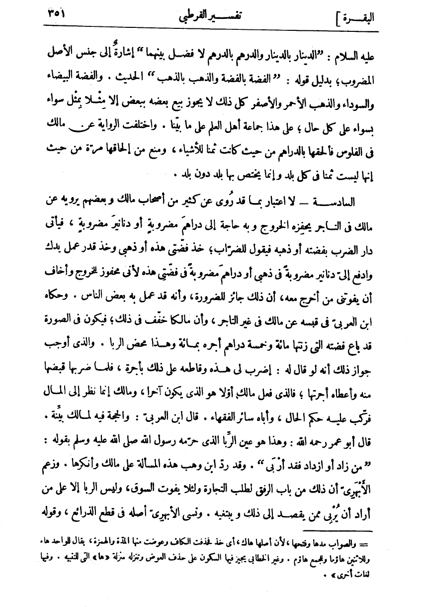 عَلَيْهِ السَّلَامُ:" الدِّينَارُ بِالدِّينَارِ وَالدِّرْهَمُ بِالدِّرْهَمِ لَا فَضْلَ بَيْنَهُمَا" إِشَارَةٌ إِلَى جِنْسِ الْأَصْلِ الْمَضْرُوبِ، بِدَلِيلِ قَوْلِهِ:" الْفِضَّةُ بِالْفِضَّةِ وَالذَّهَبُ بِالذَّهَبِ" الْحَدِيثَ. وَالْفِضَّةُ الْبَيْضَاءُ وَالسَّوْدَاءُ وَالذَّهَبُ الْأَحْمَرُ وَالْأَصْفَرُ كُلُّ ذَلِكَ لَا يَجُوزُ بَيْعُ بَعْضِهِ بِبَعْضٍ إِلَّا مِثْلًا بِمِثْلٍ سَوَاءً بِسَوَاءٍ عَلَى كُلِّ حَالٍ، عَلَى هَذَا جَمَاعَةُ أَهْلِ الْعِلْمِ عَلَى مَا بَيَّنَّا. وَاخْتَلَفَتِ الرِّوَايَةُ عَنْ مَالِكٍ فِي الْفُلُوسِ فَأَلْحَقَهَا بِالدَّرَاهِمِ مِنْ حَيْثُ كَانَتْ ثَمَنًا لِلْأَشْيَاءِ، وَمَنَعَ مِنْ إِلْحَاقِهَا مَرَّةً مِنْ حَيْثُ إِنَّهَا لَيْسَتْ ثَمَنًا فِي كُلِّ بَلَدٍ وَإِنَّمَا يَخْتَصُّ بِهَا بَلَدٌ دُونَ بَلَدٍ. السَّادِسَةُ- لَا اعْتِبَارَ بِمَا قَدْ رُوِيَ عَنْ كَثِيرٍ مِنْ أَصْحَابِ مَالِكٍ وَبَعْضُهُمْ يَرْوِيهِ عَنْ مَالِكٍ فِي التَّاجِرِ يَحْفِزُهُ الْخُرُوجُ وَبِهِ حَاجَةٌ إِلَى دَرَاهِمَ مَضْرُوبَةٍ أَوْ دَنَانِيرَ مَضْرُوبَةٍ، فَيَأْتِي دَارَ الضَّرْبِ بِفِضَّتِهِ أَوْ ذَهَبِهِ فَيَقُولُ لِلضَّرَّابِ، خُذْ فِضَّتِي هَذِهِ أَوْ ذَهَبِي وَخُذْ قَدْرَ عَمَلِ يَدِكَ وَادْفَعْ إِلَيَّ دَنَانِيرَ مَضْرُوبَةً فِي ذَهَبِي أَوْ دَرَاهِمَ مَضْرُوبَةً فِي فِضَّتِي هَذِهِ لِأَنِّي مَحْفُوزٌ لِلْخُرُوجِ وَأَخَافُ أَنْ يَفُوتَنِي مَنْ أَخْرُجُ مَعَهُ، أَنَّ ذَلِكَ جَائِزٌ لِلضَّرُورَةِ، وَأَنَّهُ قَدْ عَمِلَ بِهِ بَعْضُ النَّاسِ. وَحَكَاهُ ابْنُ الْعَرَبِيِّ فِي قَبَسِهِ عَنْ مَالِكٍ فِي غَيْرِ التَّاجِرِ، وَإِنَّ مَالِكًا خَفَّفَ فِي ذَلِكَ، فَيَكُونُ فِي الصُّورَةِ قَدْ بَاعَ فِضَّتَهُ الَّتِي زِنَتُهَا مِائَةٌ وَخَمْسَةُ دَرَاهِمَ أَجْرُهُ بِمِائَةٍ وَهَذَا مَحْضُ الرِّبَا. وَالَّذِي أَوْجَبَ جَوَازَ ذَلِكَ أَنَّهُ لَوْ قَالَ لَهُ: اضْرِبْ لِي هَذِهِ وَقَاطَعَهُ عَلَى ذَلِكَ بِأُجْرَةٍ، فَلَمَّا ضَرَبَهَا قَبَضَهَا مِنْهُ وَأَعْطَاهُ أُجْرَتَهَا، فَالَّذِي فَعَلَ مَالِكٌ أَوَّلًا هُوَ الَّذِي يَكُونُ آخِرًا، وَمَالِكٌ إِنَّمَا نَظَرَ إِلَى الْمَالِ فَرَكَّبَ عَلَيْهِ حُكْمَ الْحَالِ، وَأَبَاهُ سَائِرُ الْفُقَهَاءِ. قَالَ ابْنُ الْعَرَبِيِّ: وَالْحُجَّةُ فِيهِ لِمَالِكٍ بَيِّنَةٌ. قَالَ أَبُو عُمَرَ رَحِمَهُ اللَّهُ: وَهَذَا هُوَ عَيْنُ الرِّبَا الَّذِي حَرَّمَهُ رَسُولُ اللَّهِ صَلَّى اللَّهُ عَلَيْهِ وَسَلَّمَ بِقَوْلِهِ:" مَنْ زَادَ أَوِ ازْدَادَ فَقَدْ أَرْبَى". وَقَدْ رَدَّ ابْنُ وَهْبٍ هَذِهِ الْمَسْأَلَةَ عَلَى مَالِكٍ وَأَنْكَرَهَا. وَزَعَمَ الْأَبْهَرِيُّ أَنَّ ذَلِكَ مِنْ بَابِ الرِّفْقِ لِطَلَبِ التِّجَارَةِ وَلِئَلَّا يَفُوتَ السُّوقُ، وَلَيْسَ الرِّبَا إِلَّا عَلَى مَنْ أَرَادَ أَنْ يُرْبِيَ مِمَّنْ يَقْصِدُ إِلَى ذَلِكَ وَيَبْتَغِيهِ. وَنَسِيَ الْأَبْهَرِيُّ أَصْلَهُ فِي قَطْعِ الذَّرَائِعِ، وَقَوْلِهِ