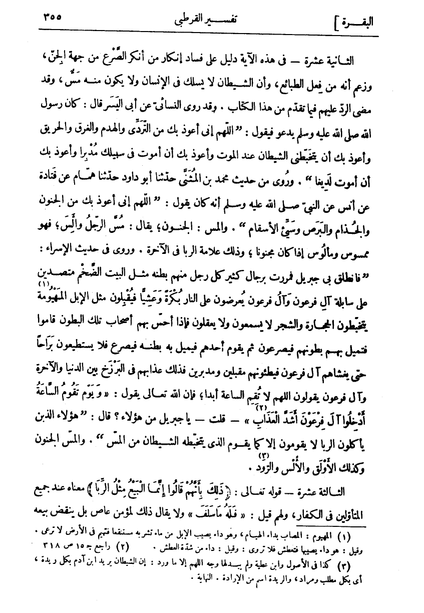 الثَّانِيَةَ عَشْرَةَ- فِي هَذِهِ الْآيَةِ دَلِيلٌ عَلَى فَسَادِ إِنْكَارِ مَنْ أَنْكَرَ الصَّرْعَ مِنْ جِهَةِ الْجِنِّ، وَزَعَمَ أَنَّهُ مِنْ فِعْلِ الطَّبَائِعِ، وَأَنَّ الشَّيْطَانَ لَا يَسْلُكُ فِي الْإِنْسَانِ وَلَا يَكُونُ مِنْهُ مَسٌّ، وَقَدْ مَضَى الرَّدُّ عَلَيْهِمْ فِيمَا تَقَدَّمَ مِنْ هَذَا الْكِتَابِ. وَقَدْ رَوَى النَّسَائِيُّ عَنْ أَبِي الْيَسَرِ قَالَ: كَانَ رَسُولُ اللَّهِ صَلَّى اللَّهُ عَلَيْهِ وَسَلَّمَ يَدْعُو فَيَقُولُ:" اللَّهُمَّ إِنِّي أَعُوَذُ بِكَ مِنَ التَّرَدِّي وَالْهَدْمِ وَالْغَرَقِ وَالْحَرِيقِ وَأَعُوذُ بِكَ أَنْ يَتَخَبَّطَنِي الشَّيْطَانُ عِنْدَ الْمَوْتِ وَأَعُوذُ بِكَ أَنْ أَمُوتَ فِي سَبِيلِكَ مُدْبِرًا وَأَعُوذُ بِكَ أَنْ أَمُوتَ لَدِيغًا". وَرُوِيَ مِنْ حَدِيثِ مُحَمَّدِ بْنِ الْمُثَنَّى حَدَّثَنَا أَبُو دَاوُدَ حَدَّثَنَا هَمَّامٌ عَنْ قَتَادَةَ عَنْ أَنَسٍ عَنِ النَّبِيِّ صَلَّى اللَّهُ عَلَيْهِ وَسَلَّمَ أَنَّهُ كَانَ يَقُولُ:" اللَّهُمَّ إِنِّي أَعُوَذُ بِكَ مِنَ الْجُنُونِ وَالْجُذَامِ وَالْبَرَصِ وَسَيِّئِ الْأَسْقَامِ". وَالْمَسُّ: الْجُنُونُ، يُقَالُ: مُسَّ الرَّجُلُ وَأَلِسَ، فَهُوَ مَمْسُوسٌ وَمَأْلُوسٌ إِذَا كَانَ مَجْنُونًا، وَذَلِكَ عَلَامَةُ الرِّبَا فِي الْآخِرَةِ. وَرُوِيَ فِي حَدِيثِ الْإِسْرَاءِ:" فَانْطَلَقَ بِي جِبْرِيلُ فَمَرَرْتُ بِرِجَالٍ كَثِيرٍ كُلُّ رَجُلٍ مِنْهُمْ بَطْنُهُ مِثْلُ الْبَيْتِ الضَّخْمِ مُتَصَدِّينَ عَلَى سَابِلَةِ آلِ فِرْعَوْنَ وَآلُ فِرْعَوْنَ يُعْرَضُونَ عَلَى النَّارِ بُكْرَةً وَعَشِيًّا فَيُقْبِلُونَ مِثْلَ الْإِبِلِ الْمَهْيُومَةِ «١» يَتَخَبَّطُونَ الْحِجَارَةَ وَالشَّجَرَ لَا يَسْمَعُونَ وَلَا يَعْقِلُونَ فَإِذَا أَحَسَّ بِهِمْ أَصْحَابُ تِلْكَ الْبُطُونِ قَامُوا فَتَمِيلُ بِهِمْ بُطُونُهُمْ فَيُصْرَعُونَ ثُمَّ يَقُومُ أَحَدُهُمْ فَيَمِيلُ بِهِ بَطْنُهُ فَيُصْرَعُ فَلَا يَسْتَطِيعُونَ بَرَاحًا حَتَّى يَغْشَاهُمْ آلُ فِرْعَوْنَ فَيَطَئُونَهُمْ مُقْبِلِينَ وَمُدْبِرِينَ فَذَلِكَ عَذَابُهُمْ فِي الْبَرْزَخِ بَيْنَ الدُّنْيَا وَالْآخِرَةِ وَآلُ فِرْعَوْنَ يَقُولُونَ اللَّهُمَّ لَا تُقِمِ السَّاعَةَ أَبَدًا، فَإِنَّ اللَّهَ تَعَالَى يَقُولُ:" وَيَوْمَ تَقُومُ السَّاعَةُ أَدْخِلُوا آلَ فِرْعَوْنَ أَشَدَّ الْعَذابِ «٢» "- قُلْتُ- يَا جِبْرِيلُ مَنْ هَؤُلَاءِ؟ قَالَ:" هَؤُلَاءِ الَّذِينَ يَأْكُلُونَ الرِّبا لَا يَقُومُونَ إِلَّا كَما يَقُومُ الَّذِي يَتَخَبَّطُهُ الشَّيْطانُ مِنَ الْمَسِّ". وَالْمَسُّ الْجُنُونُ وَكَذَلِكَ الاولق والألس والرود «٣». الثالثة عشرة- قوله تعالى: (ذلِكَ بِأَنَّهُمْ قالُوا إِنَّمَا الْبَيْعُ مِثْلُ الرِّبا) مَعْنَاهُ عِنْدَ جَمِيعِ الْمُتَأَوِّلِينَ فِي الْكُفَّارِ، وَلَهُمْ قِيلَ:" فَلَهُ مَا سَلَفَ" وَلَا يُقَالُ ذَلِكَ لمؤمن عاص بل ينقض بيعه