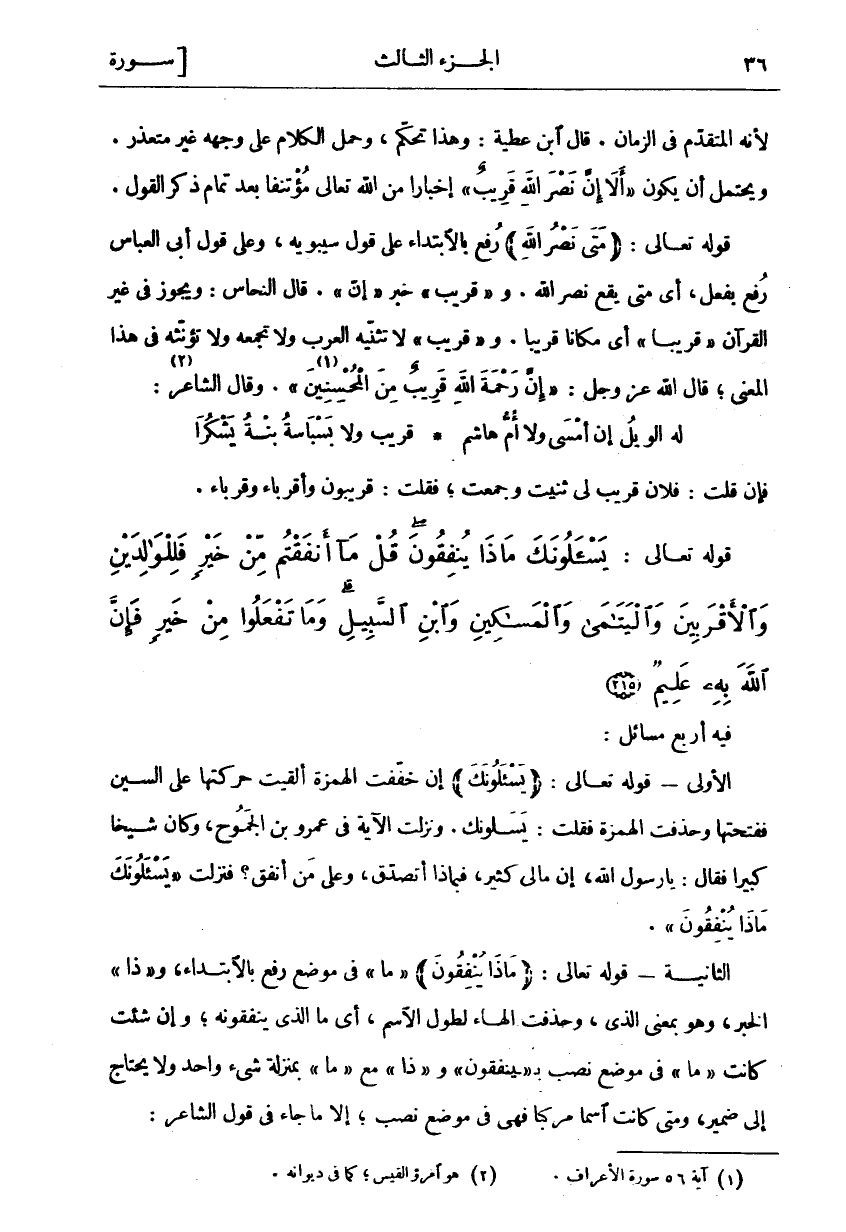 لِأَنَّهُ الْمُتَقَدِّمُ فِي الزَّمَانِ. قَالَ ابْنُ عَطِيَّةَ: وَهَذَا تَحَكُّمٌ، وَحَمْلُ الْكَلَامِ عَلَى وَجْهِهِ غَيْرُ مُتَعَذِّرٍ. وَيُحْتَمَلُ أَنْ يَكُونَ" أَلا إِنَّ نَصْرَ اللَّهِ قَرِيبٌ" إِخْبَارًا مِنَ اللَّهِ تَعَالَى مُؤْتَنِفًا بَعْدَ تَمَامِ ذِكْرِ الْقَوْلِ. قَوْلُهُ تَعَالَى: مَتى نَصْرُ اللَّهِ رُفِعَ بِالِابْتِدَاءِ عَلَى قَوْلِ سِيبَوَيْهِ، وَعَلَى قَوْلِ أَبِي الْعَبَّاسِ رُفِعَ بِفِعْلٍ، أَيْ مَتَى يَقَعُ نَصْرُ اللَّهِ. وَ" قَرِيبٌ" خَبَرُ" أَنْ". قَالَ النَّحَّاسَ: وَيَجُوزُ فِي غَيْرِ الْقُرْآنِ" قَرِيبًا" أَيْ مَكَانًا قَرِيبًا. وَ" قَرِيبٌ" لَا تُثَنِّيهِ الْعَرَبُ وَلَا تَجْمَعُهُ وَلَا تُؤَنِّثُهُ فِي هَذَا الْمَعْنَى، قَالَ اللَّهُ عَزَّ وَجَلَّ:" إِنَّ رَحْمَتَ اللَّهِ قَرِيبٌ مِنَ الْمُحْسِنِينَ «١» ". وَقَالَ الشَّاعِرُ «٢»: