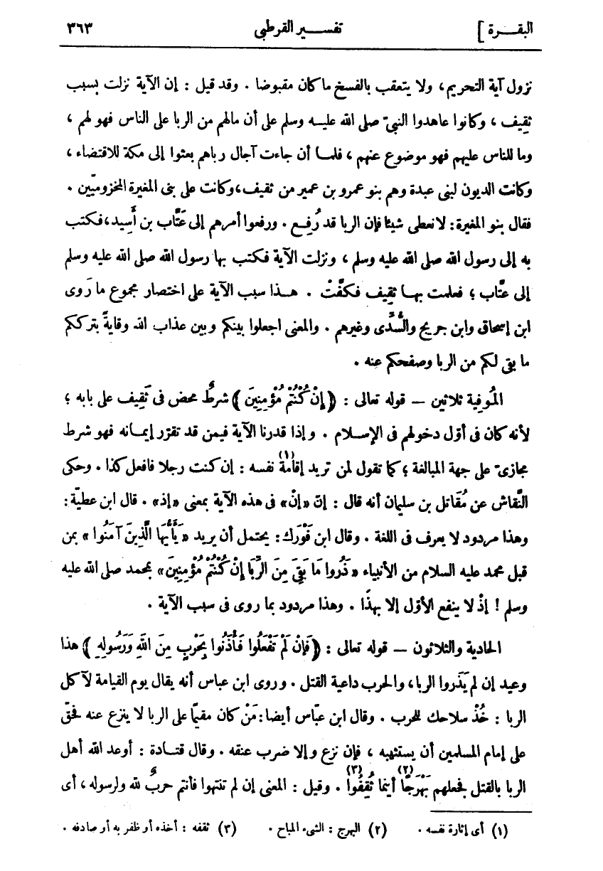 نُزُولِ آيَةِ التَّحْرِيمِ وَلَا يُتَعَقَّبُ بِالْفَسْخِ مَا كَانَ مَقْبُوضًا. وَقَدْ قِيلَ: إِنَّ الْآيَةَ نَزَلَتْ بِسَبَبِ ثَقِيفٍ، وَكَانُوا عَاهَدُوا النَّبِيَّ صَلَّى اللَّهُ عَلَيْهِ وَسَلَّمَ عَلَى أَنَّ مالهم مِنَ الرِّبَا عَلَى النَّاسِ فَهُوَ لَهُمْ، وَمَا لِلنَّاسِ عَلَيْهِمْ فَهُوَ مَوْضُوعٌ عَنْهُمْ، فَلَمَّا أَنْ جَاءَتْ آجَالُ رِبَاهُمْ بَعَثُوا إِلَى مَكَّةَ لِلِاقْتِضَاءِ، وكانت الديون لبنى عبد ة وَهُمْ بَنُو عَمْرِو بْنِ عُمَيْرٍ مِنْ ثَقِيفٍ، وَكَانَتْ عَلَى بَنِي الْمُغِيرَةِ الْمَخْزُومِيِّينَ. فَقَالَ بَنُو الْمُغِيرَةِ: لَا نُعْطِي شَيْئًا فَإِنَّ الرِّبَا قَدْ رُفِعَ وَرَفَعُوا أَمْرَهُمْ إِلَى عَتَّابِ بْنِ أَسِيدٍ، فَكَتَبَ بِهِ إِلَى رَسُولِ اللَّهِ صَلَّى اللَّهُ عَلَيْهِ وَسَلَّمَ، وَنَزَلَتِ الْآيَةُ فَكَتَبَ بِهَا رَسُولُ اللَّهِ صَلَّى اللَّهُ عَلَيْهِ وَسَلَّمَ إِلَى عَتَّابٍ، فَعَلِمَتْ بِهَا ثَقِيفُ فَكَفَّتْ. هَذَا سَبَبُ الْآيَةِ عَلَى اخْتِصَارِ مَجْمُوعِ مَا رَوَى ابْنُ إِسْحَاقَ وَابْنُ جُرَيْجٍ وَالسُّدِّيُّ وَغَيْرُهُمْ. وَالْمَعْنَى اجْعَلُوا بَيْنَكُمْ وَبَيْنَ عَذَابِ اللَّهِ وِقَايَةً بِتَرْكِكُمْ مَا بَقِيَ لَكُمْ مِنَ الرِّبَا وَصَفْحِكُمْ عَنْهُ. الْمُوفِيَةُ ثَلَاثِينَ- قَوْلُهُ تَعَالَى: (إِنْ كُنْتُمْ مُؤْمِنِينَ) شَرْطٌ مَحْضٌ فِي ثَقِيفٍ عَلَى بَابِهِ، لِأَنَّهُ كَانَ فِي أَوَّلِ دُخُولِهِمْ فِي الْإِسْلَامِ. وَإِذَا قَدَّرْنَا الْآيَةَ فِيمَنْ قَدْ تَقَرَّرَ إِيمَانُهُ فَهُوَ شَرْطٌ مَجَازِيٌّ عَلَى جِهَةِ الْمُبَالَغَةِ، كَمَا تَقُولُ لِمَنْ تُرِيدُ إِقَامَةَ «١» نَفْسِهِ: إِنْ كُنْتَ رَجُلًا فَافْعَلْ كَذَا. وَحَكَى النَّقَّاشُ عَنْ مُقَاتِلِ بْنِ سُلَيْمَانَ أَنَّهُ قَالَ: إِنَّ" إِنْ" فِي هَذِهِ الْآيَةِ بِمَعْنَى" إِذْ". قَالَ ابْنُ عَطِيَّةَ: وَهَذَا مَرْدُودٌ لَا يُعْرَفُ فِي اللُّغَةِ. وَقَالَ ابْنُ فَوْرَكٍ: يُحْتَمَلُ أَنْ يُرِيدَ" يَا أَيُّهَا الَّذِينَ آمَنُوا" بِمَنْ قَبْلَ مُحَمَّدٍ عَلَيْهِ السَّلَامُ مِنَ الْأَنْبِيَاءِ" ذَرُوا مَا بَقِيَ مِنَ الرِّبا إِنْ كُنْتُمْ مُؤْمِنِينَ" بِمُحَمَّدٍ صَلَّى اللَّهُ عَلَيْهِ وَسَلَّمَ! إِذْ لَا يَنْفَعُ الْأَوَّلُ إِلَّا بِهَذَا. وَهَذَا مَرْدُودٌ بِمَا روى في سبب الآية. الحادية والثلاثون- قوله تعالى: (فَإِنْ لَمْ تَفْعَلُوا فَأْذَنُوا بِحَرْبٍ مِنَ اللَّهِ وَرَسُولِهِ) هَذَا وَعِيدٌ إِنْ لَمْ يَذَرُوا الرِّبَا، وَالْحَرْبُ دَاعِيَةُ الْقَتْلِ. وَرَوَى ابْنُ عَبَّاسٍ أَنَّهُ يُقَالُ يَوْمَ الْقِيَامَةِ لِآكِلِ الرِّبَا: خُذْ سِلَاحَكَ لِلْحَرْبِ. وَقَالَ ابْنُ عَبَّاسٍ أَيْضًا: مَنْ كَانَ مُقِيمًا عَلَى الرِّبَا لَا يَنْزِعُ عَنْهُ فَحَقَّ على إمام المسلمين أن يستثيبه، فَإِنْ نَزَعَ وَإِلَّا ضَرَبَ عُنُقَهُ. وَقَالَ قَتَادَةُ: أَوْعَدَ اللَّهُ أَهْلَ الرِّبَا بِالْقَتْلِ فَجَعَلَهُمْ بَهْرَجًا «٢» أَيْنَمَا ثُقِفُوا «٣». وَقِيلَ: الْمَعْنَى إِنْ لَمْ تَنْتَهُوا فأنتم حرب لله ولرسوله، أي