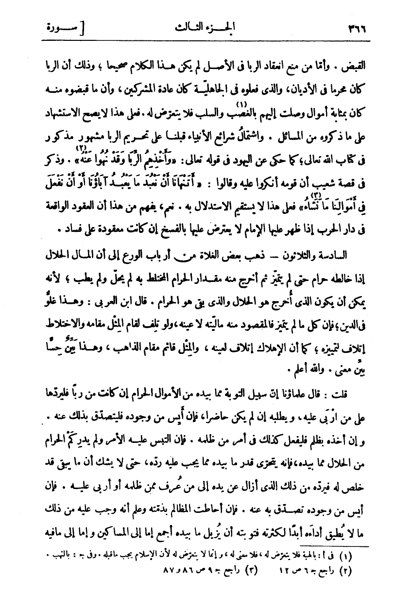 الْقَبْضِ. وَأَمَّا مَنْ مَنَعَ انْعِقَادَ الرِّبَا فِي الْأَصْلِ لَمْ يَكُنْ هَذَا الْكَلَامُ صَحِيحًا، وَذَلِكَ أَنَّ الرِّبَا كَانَ مُحَرَّمًا فِي الْأَدْيَانِ، وَالَّذِي فَعَلُوهُ فِي الْجَاهِلِيَّةِ كَانَ عَادَةَ الْمُشْرِكِينَ، وَأَنَّ مَا قَبَضُوهُ مِنْهُ كَانَ بِمَثَابَةِ أَمْوَالٍ وَصَلَتْ إِلَيْهِمْ بِالْغَصْبِ «١» وَالسَّلْبِ فَلَا يُتَعَرَّضُ لَهُ. فَعَلَى هَذَا لَا يَصِحُّ الِاسْتِشْهَادُ عَلَى مَا ذَكَرُوهُ مِنَ الْمَسَائِلِ. وَاشْتِمَالُ شَرَائِعِ الْأَنْبِيَاءِ قَبْلَنَا عَلَى تَحْرِيمِ الرِّبَا مَشْهُورٌ مَذْكُورٌ فِي كِتَابِ اللَّهِ تَعَالَى، كَمَا حُكِيَ عَنِ الْيَهُودِ فِي قَوْلِهِ تعالى:" وَأَخْذِهِمُ الرِّبَوا وَقَدْ نُهُوا عَنْهُ «٢» ". وَذُكِرَ فِي قِصَّةِ شُعَيْبٍ أن قومه أنكروا عليه وقالوا:" أَتَنْهانا أَنْ نَعْبُدَ مَا يَعْبُدُ آباؤُنا أَوْ أَنْ نَفْعَلَ فِي أَمْوالِنا ما نَشؤُا «٣» " فَعَلَى هَذَا لَا يَسْتَقِيمُ الِاسْتِدْلَالُ بِهِ. نَعَمْ، يُفْهَمُ مِنْ هَذَا أَنَّ الْعُقُودَ الْوَاقِعَةَ فِي دَارِ الْحَرْبِ إِذَا ظَهَرَ عَلَيْهَا الْإِمَامُ لَا يُعْتَرَضُ عَلَيْهَا بِالْفَسْخِ إِنْ كَانَتْ مَعْقُودَةً عَلَى فَسَادٍ. السَّادِسَةُ وَالثَّلَاثُونَ- ذَهَبَ بَعْضُ الْغُلَاةِ مِنْ أَرْبَابِ الْوَرَعِ إِلَى أَنَّ الْمَالَ الْحَلَالَ إِذَا خَالَطَهُ حَرَامٌ حَتَّى لَمْ يَتَمَيَّزْ ثُمَّ أُخْرِجَ مِنْهُ مِقْدَارُ الْحَرَامِ الْمُخْتَلِطِ بِهِ لَمْ يَحِلَّ وَلَمْ يَطِبْ، لِأَنَّهُ يُمْكِنُ أَنْ يَكُونَ الَّذِي أُخْرِجَ هُوَ الْحَلَالُ وَالَّذِي بَقِيَ هُوَ الْحَرَامُ. قَالَ ابْنُ الْعَرَبِيِّ: وَهَذَا غُلُوٌّ فِي الدِّينِ، فَإِنَّ كُلَّ مَا لَمْ يَتَمَيَّزْ فَالْمَقْصُودُ مِنْهُ مَالِيَّتُهُ لَا عَيْنُهُ، وَلَوْ تَلِفَ لَقَامَ الْمِثْلُ مَقَامَهُ وَالِاخْتِلَاطُ إِتْلَافٌ لِتَمْيِيزِهِ، كَمَا أَنَّ الْإِهْلَاكَ إِتْلَافٌ لِعَيْنِهِ، وَالْمِثْلُ قَائِمٌ مَقَامَ الذَّاهِبِ، وَهَذَا بَيِّنٌ حِسًّا بَيِّنٌ مَعْنًى. وَاللَّهُ أَعْلَمُ. قُلْتُ: قَالَ عُلَمَاؤُنَا إِنَّ سَبِيلَ التَّوْبَةِ مِمَّا بِيَدِهِ مِنَ الْأَمْوَالِ الْحَرَامِ إِنْ كَانَتْ مِنْ رِبًا فليردها على من أربى عليه، ومطلبه إِنْ لَمْ يَكُنْ حَاضِرًا، فَإِنْ أَيِسَ مِنْ وُجُودِهِ فَلْيَتَصَدَّقْ بِذَلِكَ عَنْهُ. وَإِنْ أَخَذَهُ بِظُلْمٍ فَلْيَفْعَلْ كَذَلِكَ فِي أَمْرِ مَنْ ظَلَمَهُ. فَإِنِ الْتَبَسَ عَلَيْهِ الْأَمْرُ وَلَمْ يَدْرِ كَمِ الْحَرَامُ مِنَ الْحَلَالِ مِمَّا بِيَدِهِ، فَإِنَّهُ يَتَحَرَّى قَدْرَ مَا بِيَدِهِ مِمَّا يَجِبُ عَلَيْهِ رَدُّهُ، حَتَّى لَا يَشُكَّ أَنَّ مَا يَبْقَى قَدْ خَلَصَ لَهُ فَيَرُدُّهُ مِنْ ذَلِكَ الَّذِي أَزَالَ عَنْ يَدِهِ إِلَى مَنْ عُرِفَ مِمَّنْ ظَلَمَهُ أَوْ أَرْبَى عَلَيْهِ. فَإِنْ أَيِسَ مِنْ وُجُودِهِ تَصَدَّقَ بِهِ عَنْهُ. فَإِنْ أَحَاطَتِ الْمَظَالِمُ بِذِمَّتِهِ وَعَلِمَ أَنَّهُ وَجَبَ عَلَيْهِ مِنْ ذَلِكَ مَا لَا يُطِيقُ أَدَاءَهُ أَبَدًا لِكَثْرَتِهِ فَتَوْبَتُهُ أَنْ يُزِيلَ مَا بِيَدِهِ أَجْمَعَ إِمَّا إِلَى الْمَسَاكِينِ وَإِمَّا إلى ما فيه