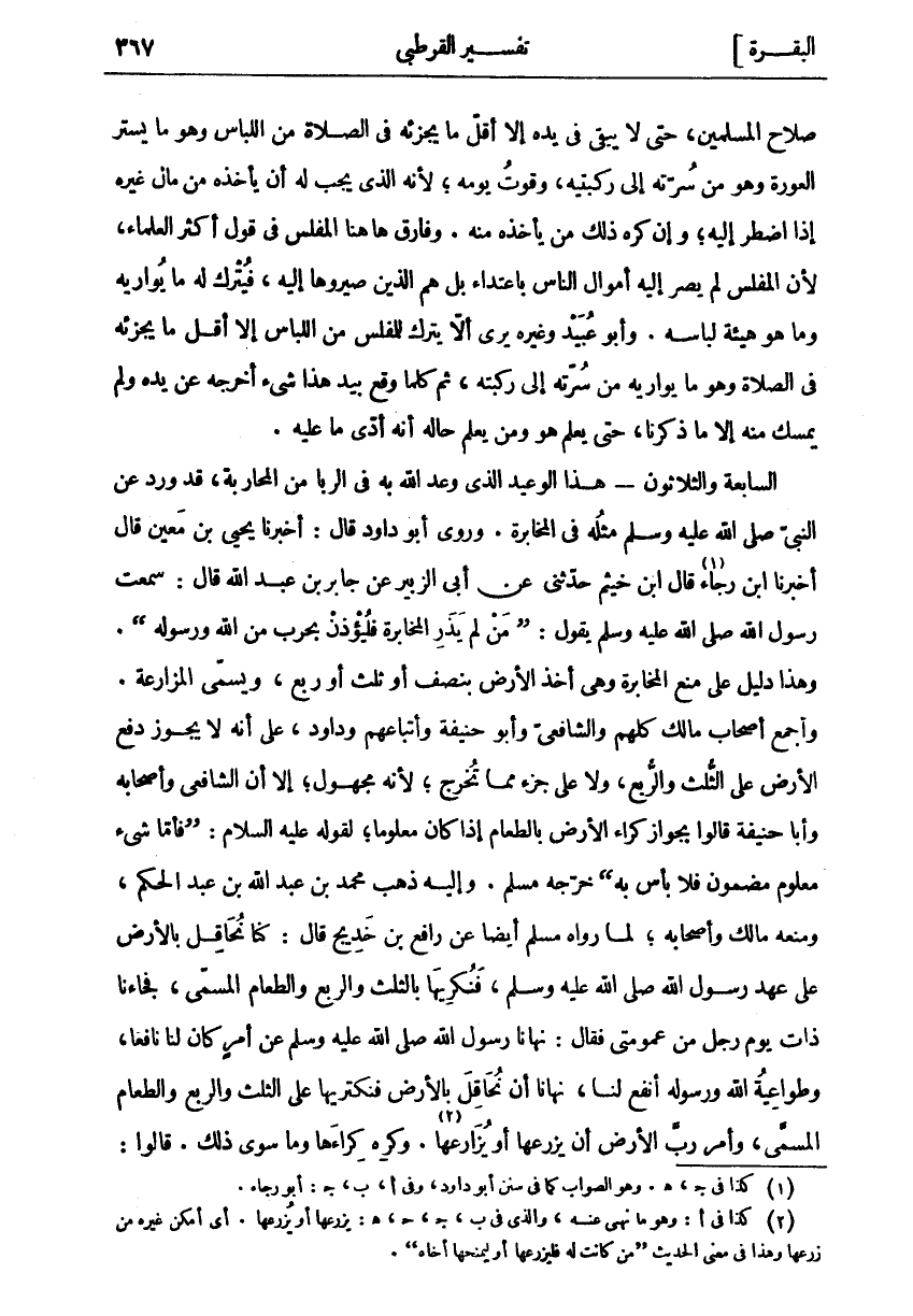صَلَاحُ الْمُسْلِمِينَ، حَتَّى لَا يَبْقَى فِي يَدِهِ إِلَّا أَقَلُّ مَا يُجْزِئُهُ فِي الصَّلَاةِ مِنَ اللِّبَاسِ وَهُوَ مَا يَسْتُرُ الْعَوْرَةَ وَهُوَ مِنْ سُرَّتِهِ إِلَى رُكْبَتَيْهِ، وَقُوتِ يَوْمِهِ، لِأَنَّهُ الَّذِي يَجِبُ لَهُ أَنْ يَأْخُذَهُ مِنْ مَالِ غَيْرِهِ إِذَا اضْطُرَّ إِلَيْهِ، وَإِنْ كَرِهَ ذَلِكَ مَنْ يأخذه منه. وفارق ها هنا الْمُفْلِسُ فِي قَوْلِ أَكْثَرِ الْعُلَمَاءِ، لِأَنَّ الْمُفْلِسَ لَمْ يَصِرْ إِلَيْهِ أَمْوَالُ النَّاسِ بِاعْتِدَاءٍ بَلْ هُمُ الَّذِينَ صَيَّرُوهَا إِلَيْهِ، فَيُتْرَكُ لَهُ مَا يُوَارِيهِ وَمَا هُوَ هَيْئَةُ لِبَاسِهِ. وَأَبُو عُبَيْدٍ وَغَيْرُهُ يَرَى أَلَّا يُتْرَكَ لِلْمُفْلِسِ اللِّبَاسُ إِلَّا أَقَلَّ مَا يُجْزِئُهُ فِي الصَّلَاةِ وَهُوَ مَا يُوَارِيهِ مِنْ سُرَّتِهِ إِلَى رُكْبَتِهِ، ثُمَّ كُلَّمَا وقع بيد هذا شي أَخْرَجَهُ عَنْ يَدِهِ وَلَمْ يُمْسِكْ مِنْهُ إِلَّا مَا ذَكَرْنَا، حَتَّى يَعْلَمَ هُوَ وَمَنْ يَعْلَمُ حَالَهُ أَنَّهُ أَدَّى مَا عَلَيْهِ. السَّابِعَةُ وَالثَّلَاثُونَ- هَذَا الْوَعِيدُ الَّذِي وَعَدَ اللَّهُ بِهِ فِي الرِّبَا مِنَ الْمُحَارَبَةِ، قَدْ وَرَدَ عَنِ النَّبِيِّ صَلَّى اللَّهُ عَلَيْهِ وَسَلَّمَ مِثْلُهُ فِي الْمُخَابَرَةِ. وَرَوَى أَبُو دَاوُدَ قَالَ: أَخْبَرَنَا يَحْيَى بْنُ مَعِينٍ قَالَ أَخْبَرَنَا ابْنُ رَجَاءٍ «١» قَالَ ابْنُ خَيْثَمٍ حَدَّثَنِي عَنْ أَبِي الزُّبَيْرِ عَنْ جَابِرِ بْنِ عَبْدِ اللَّهِ قَالَ: سَمِعْتُ رَسُولَ اللَّهِ صَلَّى اللَّهُ عَلَيْهِ وَسَلَّمَ يَقُولُ:" مَنْ لَمْ يَذَرِ الْمُخَابَرَةَ فَلْيُؤْذِنْ بِحَرْبٍ مِنَ اللَّهِ وَرَسُولِهِ". وَهَذَا دَلِيلٌ عَلَى مَنْعِ الْمُخَابَرَةِ وَهِيَ أَخْذُ الْأَرْضِ بِنِصْفٍ أَوْ ثُلُثٍ أَوْ رُبْعٍ، وَيُسَمَّى الْمُزَارَعَةَ. وَأَجْمَعَ أَصْحَابُ مَالِكٍ كُلُّهُمْ وَالشَّافِعِيُّ وَأَبُو حَنِيفَةَ وَأَتْبَاعُهُمْ وَدَاوُدُ، عَلَى أَنَّهُ لَا يَجُوزُ دَفْعُ الْأَرْضِ عَلَى الثُّلُثِ وَالرُّبْعِ، وَلَا عَلَى جُزْءٍ مِمَّا تُخْرِجُ، لِأَنَّهُ مَجْهُولٌ، إِلَّا أَنَّ الشَّافِعِيَّ وَأَصْحَابَهُ وَأَبَا حَنِيفَةَ قَالُوا بِجَوَازِ كِرَاءِ الْأَرْضِ بِالطَّعَامِ إِذَا كَانَ مَعْلُومًا، لِقَوْلِهِ عَلَيْهِ السلام:" فأما شي مَعْلُومٌ مَضْمُونٌ فَلَا بَأْسَ بِهِ" خَرَّجَهُ مُسْلِمٌ. وَإِلَيْهِ ذَهَبَ مُحَمَّدُ بْنُ عَبْدِ اللَّهِ بْنِ عَبْدِ الْحَكَمِ، وَمَنَعَهُ مَالِكٌ وَأَصْحَابُهُ، لِمَا رَوَاهُ مُسْلِمٌ أَيْضًا عَنْ رَافِعِ بْنِ خَدِيجٍ قَالَ: كُنَّا نُحَاقِلُ بِالْأَرْضِ عَلَى عَهْدِ رَسُولِ اللَّهِ صَلَّى اللَّهُ عَلَيْهِ وَسَلَّمَ، فَنُكْرِيهَا بِالثُّلُثِ وَالرُّبْعِ وَالطَّعَامِ الْمُسَمَّى، فَجَاءَنَا ذَاتَ يَوْمٍ رَجُلٌ مِنْ عُمُومَتِي فَقَالَ: نَهَانَا رَسُولُ اللَّهِ صَلَّى اللَّهُ عَلَيْهِ وَسَلَّمَ عَنْ أَمْرٍ كَانَ لَنَا نَافِعًا، وَطَوَاعِيَةُ اللَّهِ وَرَسُولِهِ أَنْفَعُ لَنَا، نَهَانَا أَنْ نُحَاقِلَ بِالْأَرْضِ فَنَكْتَرِيهَا عَلَى الثُّلُثِ وَالرُّبْعِ وَالطَّعَامِ الْمُسَمَّى، وَأَمَرَ رَبَّ الْأَرْضِ أَنْ يَزْرَعَهَا أَوْ يُزَارِعَهَا «٢». وَكَرِهَ كِرَاءَهَا وَمَا سِوَى ذَلِكَ. قَالُوا: