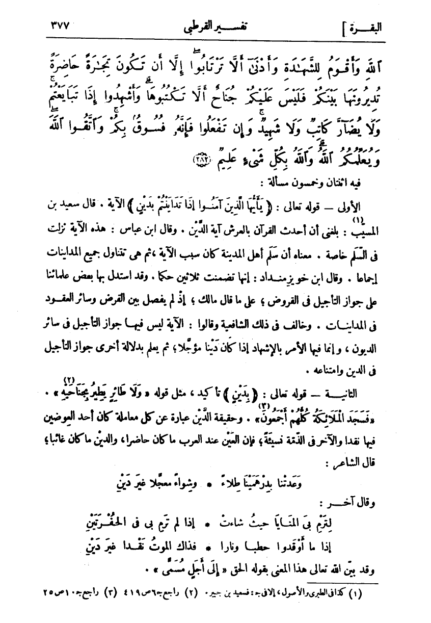 فِيهِ اثْنَتَانِ وَخَمْسُونَ مَسْأَلَةً: الْأُولَى- قَوْلُهُ تَعَالَى: (يَا أَيُّهَا الَّذِينَ آمَنُوا إِذا تَدايَنْتُمْ بِدَيْنٍ) الآية. قَالَ سَعِيدُ بْنُ الْمُسَيَّبِ «١»: بَلَغَنِي أَنَّ أَحْدَثَ الْقُرْآنِ بِالْعَرْشِ آيَةُ الدَّيْنِ. وَقَالَ ابْنُ عَبَّاسٍ: هَذِهِ الْآيَةُ نَزَلَتْ فِي السَّلَمِ خَاصَّةً. مَعْنَاهُ أَنَّ سَلَمَ أَهْلِ الْمَدِينَةِ كَانَ سَبَبَ الْآيَةِ، ثم هي تتناول جميع المدائنات إجماعا. وقال ابن خويز منداد: إِنَّهَا تَضَمَّنَتْ ثَلَاثِينَ حُكْمًا. وَقَدِ اسْتَدَلَّ بِهَا بَعْضُ عُلَمَائِنَا عَلَى جَوَازِ التَّأْجِيلِ فِي الْقُرُوضِ، عَلَى مَا قَالَ مَالِكٌ، إِذْ لَمْ يَفْصِلْ بين القرض وسائر العقود في المدائنات. وَخَالَفَ فِي ذَلِكَ الشَّافِعِيَّةُ وَقَالُوا: الْآيَةُ لَيْسَ فِيهَا جَوَازُ التَّأْجِيلِ فِي سَائِرِ الدُّيُونِ، وَإِنَّمَا فِيهَا الْأَمْرُ بِالْإِشْهَادِ إِذَا كَانَ دَيْنًا مُؤَجَّلًا، ثُمَّ يُعْلَمُ بِدَلَالَةٍ أُخْرَى جَوَازُ التَّأْجِيلِ فِي الدَّيْنِ وَامْتِنَاعِهِ. الثَّانِيَةُ- قَوْلُهُ تَعَالَى: (بِدَيْنٍ) تَأْكِيدٌ، مِثْلَ قَوْلِهِ" وَلا طائِرٍ يَطِيرُ بِجَناحَيْهِ «٢» "." فَسَجَدَ الْمَلائِكَةُ كُلُّهُمْ أَجْمَعُونَ «٣» ". وَحَقِيقَةُ الدَّيْنِ عِبَارَةٌ عَنْ كُلِّ مُعَامَلَةٍ كَانَ أَحَدُ الْعِوَضَيْنِ فِيهَا نَقْدًا وَالْآخَرُ فِي الذِّمَّةِ نَسِيئَةً، فَإِنَّ الْعَيْنَ عِنْدَ الْعَرَبِ مَا كَانَ حَاضِرًا، وَالدَّيْنَ مَا كَانَ غَائِبًا، قَالَ الشَّاعِرُ: