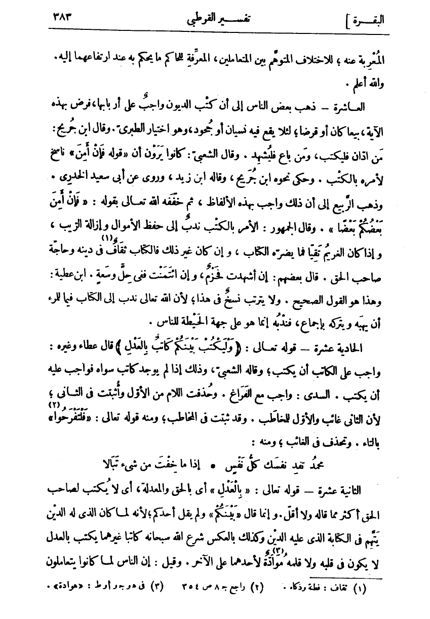 الْمُعْرِبَةِ عَنْهُ، لِلِاخْتِلَافِ الْمُتَوَهَّمِ بَيْنَ الْمُتَعَامِلَيْنِ، الْمُعَرِّفَةِ لِلْحَاكِمِ مَا يَحْكُمُ بِهِ عِنْدَ ارْتِفَاعِهِمَا إِلَيْهِ. وَاللَّهُ أَعْلَمُ. الْعَاشِرَةُ- ذَهَبَ بَعْضُ النَّاسِ إِلَى أَنَّ كَتْبَ الدُّيُونِ وَاجِبٌ عَلَى أَرْبَابِهَا، فَرْضٌ بِهَذِهِ الْآيَةِ، بَيْعًا كَانَ أَوْ قَرْضًا، لِئَلَّا يَقَعَ فِيهِ نِسْيَانٌ أَوْ جُحُودٌ، وَهُوَ اخْتِيَارُ الطَّبَرِيِّ. وَقَالَ ابْنُ جُرَيْجٍ: مَنِ ادَّانَ فَلْيَكْتُبْ، وَمَنْ بَاعَ فَلْيُشْهِدْ. وَقَالَ الشَّعْبِيُّ: كَانُوا يَرَوْنَ أَنَّ" قَوْلَهُ فَإِنْ أَمِنَ" نَاسِخٌ لِأَمْرِهِ بِالْكَتْبِ. وَحَكَى نَحْوَهُ ابْنُ جُرَيْجٍ، وَقَالَهُ ابْنُ زَيْدٍ، وَرُوِيَ عَنْ أَبِي سَعِيدٍ الْخُدْرِيِّ. وَذَهَبَ الرَّبِيعُ إِلَى أَنَّ ذَلِكَ وَاجِبٌ بِهَذِهِ الْأَلْفَاظِ، ثُمَّ خَفَّفَهُ اللَّهُ تَعَالَى بِقَوْلِهِ:" فَإِنْ أَمِنَ بَعْضُكُمْ بَعْضاً". وَقَالَ الْجُمْهُورُ: الْأَمْرُ بِالْكَتْبِ نَدْبٌ إِلَى حِفْظِ الْأَمْوَالِ وَإِزَالَةِ الرَّيْبِ، وَإِذَا كَانَ الْغَرِيمُ تَقِيًّا فَمَا يَضُرُّهُ الْكِتَابُ، وَإِنْ كَانَ غَيْرَ ذَلِكَ فَالْكِتَابُ ثَقَافٌ «١» فِي دِينِهِ وَحَاجَّةُ صَاحِبِ الْحَقِّ. قَالَ بَعْضُهُمْ: إِنْ أَشْهَدْتُ فَحَزْمٌ، وَإِنِ ائْتَمَنْتُ فَفِي حِلٍّ وَسَعَةٍ. ابْنُ عَطِيَّةَ: وَهَذَا هُوَ الْقَوْلُ الصَّحِيحُ. وَلَا يَتَرَتَّبُ نَسْخٌ فِي هَذَا، لِأَنَّ اللَّهَ تَعَالَى نَدَبَ إِلَى الْكِتَابِ فِيمَا لِلْمَرْءِ أَنْ يَهَبَهُ وَيَتْرُكَهُ بِإِجْمَاعٍ، فَنَدْبُهُ إِنَّمَا هُوَ عَلَى جِهَةِ الْحَيْطَةِ لِلنَّاسِ. الْحَادِيَةَ عَشْرَةَ- قَوْلُهُ تَعَالَى: (وَلْيَكْتُبْ بَيْنَكُمْ كاتِبٌ بِالْعَدْلِ) قَالَ عَطَاءٌ وَغَيْرُهُ: وَاجِبٌ عَلَى الْكَاتِبِ أَنْ يكتب، وقال الشَّعْبِيُّ، وَذَلِكَ إِذَا لَمْ يُوجَدْ كَاتِبٌ سِوَاهُ فَوَاجِبٌ عَلَيْهِ أَنْ يَكْتُبَ. السُّدِّيُّ: وَاجِبٌ مَعَ الْفَرَاغِ. وَحُذِفَتِ اللَّامُ مِنَ الْأَوَّلِ وَأُثْبِتَتْ فِي الثَّانِي، لِأَنَّ الثَّانِيَ غَائِبٌ وَالْأَوَّلَ لِلْمُخَاطَبِ. وَقَدْ ثَبَتَتْ فِي الْمُخَاطَبِ، وَمِنْهُ قَوْلُهُ تَعَالَى:" فَلْتَفْرَحُوا «٢» " بِالتَّاءِ. وَتُحْذَفُ فِي الْغَائِبِ، وَمِنْهُ: مُحَمَّدُ تَفْدِ نَفْسَكَ كُلُّ نَفْسٍ إِذَا مَا خِفْتَ مِنْ شي تَبَالَا الثَّانِيَةَ عَشْرَةَ- قَوْلُهُ تَعَالَى: (بِالْعَدْلِ) أَيْ بِالْحَقِّ وَالْمَعْدِلَةِ، أَيْ لَا يَكْتُبْ لِصَاحِبِ الْحَقِّ أَكْثَرَ مِمَّا قَالَهُ وَلَا أَقَلَّ. وَإِنَّمَا قَالَ" بَيْنَكُمْ" وَلَمْ يَقُلْ أَحَدَكُمْ، لِأَنَّهُ لَمَّا كَانَ الَّذِي لَهُ الدَّيْنُ يَتَّهِمُ فِي الْكِتَابَةِ الَّذِي عَلَيْهِ الدَّيْنُ وَكَذَلِكَ بِالْعَكْسِ شَرَعَ اللَّهُ سُبْحَانَهُ كَاتِبًا غَيْرَهُمَا يَكْتُبُ بِالْعَدْلِ لَا يَكُونُ فِي قَلْبِهِ وَلَا قَلَمِهِ مَوَادَّةٌ «٣» لِأَحَدِهِمَا عَلَى الْآخَرِ. وقيل: إن الناس لما كانوا يتعاملون