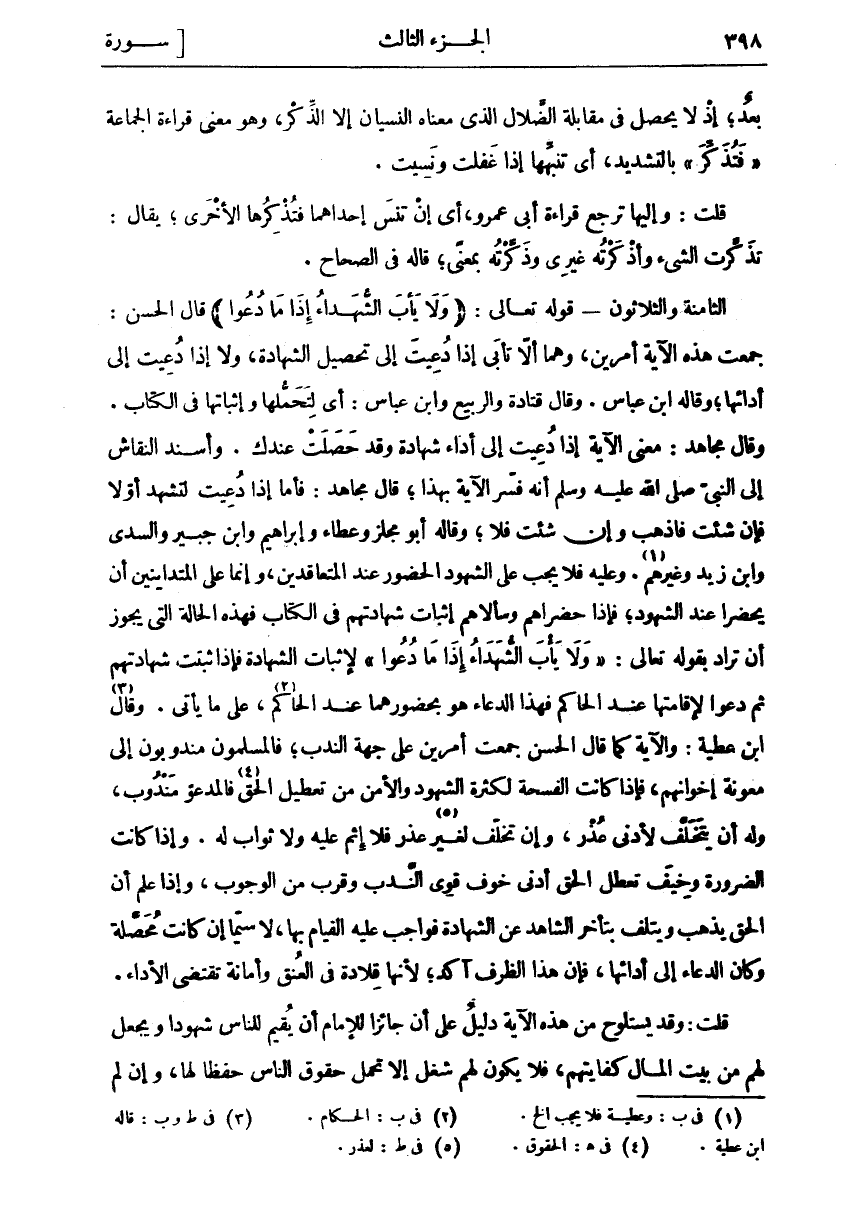 بُعْدٌ، إِذْ لَا يَحْصُلُ فِي مُقَابَلَةِ الضَّلَالِ الَّذِي مَعْنَاهُ النِّسْيَانُ إِلَّا الذِّكْرُ، وَهُوَ مَعْنَى قِرَاءَةِ الْجَمَاعَةِ" فَتُذَكِّرَ" بِالتَّشْدِيدِ، أَيْ تُنَبِّهُهَا إِذَا غَفَلَتْ وَنَسِيَتْ. قُلْتُ: وَإِلَيْهَا تَرْجِعُ قِرَاءَةُ أَبِي عَمْرٍو، أَيْ إِنْ تَنْسَ إِحْدَاهُمَا فَتُذْكِرُهَا الْأُخْرَى، يقال: تذكرت الشيء وأذكرته غيرى وَذَكَّرْتُهُ بِمَعْنًى، قَالَهُ فِي الصِّحَاحِ. الثَّامِنَةُ وَالثَّلَاثُونَ- قَوْلُهُ تَعَالَى: (وَلا يَأْبَ الشُّهَداءُ إِذا مَا دُعُوا) قَالَ الْحَسَنُ: جَمَعَتْ هَذِهِ الْآيَةُ أَمْرَيْنِ، وَهُمَا أَلَّا تَأْبَى إِذَا دُعِيَتْ إِلَى تَحْصِيلِ الشَّهَادَةِ، وَلَا إِذَا دُعِيَتْ إِلَى أَدَائِهَا، وَقَالَهُ ابْنُ عَبَّاسٍ. وَقَالَ قَتَادَةُ وَالرَّبِيعُ وَابْنُ عَبَّاسٍ: أَيْ لِتَحَمُّلِهَا وَإِثْبَاتِهَا فِي الْكِتَابِ. وَقَالَ مُجَاهِدٌ: مَعْنَى الْآيَةِ إِذَا دُعِيَتْ إِلَى أَدَاءِ شَهَادَةٍ وَقَدْ حَصَلَتْ عِنْدَكَ. وَأَسْنَدَ النِّقَاشُ إِلَى النَّبِيِّ صَلَّى اللَّهُ عَلَيْهِ وَسَلَّمَ أَنَّهُ فَسَّرَ الْآيَةَ بِهَذَا، قَالَ مُجَاهِدٌ: فَأَمَّا إِذَا دُعِيَتْ لِتَشْهَدَ أَوَّلًا فَإِنْ شِئْتَ فَاذْهَبْ وَإِنْ شِئْتَ فَلَا، وقال أَبُو مِجْلَزٍ وَعَطَاءٌ وَإِبْرَاهِيمُ وَابْنُ جُبَيْرٍ وَالسُّدِّيُّ وَابْنُ زَيْدٍ وَغَيْرُهُمْ «١». وَعَلَيْهِ فَلَا يَجِبُ عَلَى الشُّهُودِ الْحُضُورُ عِنْدَ الْمُتَعَاقِدَيْنِ، وَإِنَّمَا عَلَى الْمُتَدَايِنَيْنِ أَنْ يَحْضُرَا عِنْدَ الشُّهُودِ، فَإِذَا حَضَرَاهُمْ وَسَأَلَاهُمْ إِثْبَاتَ شَهَادَتِهِمْ فِي الْكِتَابِ فَهَذِهِ الْحَالَةُ الَّتِي يَجُوزُ أَنْ تُرَادَ بِقَوْلِهِ تَعَالَى:" وَلا يَأْبَ الشُّهَداءُ إِذا مَا دُعُوا" لِإِثْبَاتِ الشَّهَادَةِ فَإِذَا ثَبَتَتْ شَهَادَتُهُمْ ثُمَّ دُعُوا لِإِقَامَتِهَا عِنْدَ الْحَاكِمِ فَهَذَا الدُّعَاءُ هُوَ بِحُضُورِهِمَا عِنْدَ الْحَاكِمِ «٢»، عَلَى مَا يَأْتِي. وَقَالَ «٣» ابْنُ عَطِيَّةَ: وَالْآيَةُ كَمَا قَالَ الْحَسَنُ جَمَعَتْ أَمْرَيْنِ عَلَى جِهَةِ النَّدْبِ، فَالْمُسْلِمُونَ مَنْدُوبُونَ إِلَى مَعُونَةِ إِخْوَانِهِمْ، فَإِذَا كَانَتِ الْفُسْحَةُ لِكَثْرَةِ الشُّهُودِ وَالْأَمْنِ مِنْ تَعْطِيلِ الْحَقِّ «٤» فَالْمَدْعُوُّ مَنْدُوبٌ، وَلَهُ أَنْ يَتَخَلَّفَ لِأَدْنَى عُذْرٍ، وَإِنْ تَخَلَّفَ لِغَيْرِ «٥» عُذْرٍ فَلَا إِثْمَ عَلَيْهِ وَلَا ثَوَابَ لَهُ. وَإِذَا كَانَتِ الضَّرُورَةُ وَخِيفُ تَعَطُّلُ الْحَقِّ أَدْنَى خَوْفٍ قَوِيَ النَّدْبُ وَقَرُبَ مِنَ الْوُجُوبِ، وَإِذَا عُلِمَ أَنَّ الْحَقَّ يَذْهَبُ وَيَتْلَفُ بِتَأَخُّرِ الشَّاهِدِ عَنِ الشَّهَادَةِ فَوَاجِبٌ عَلَيْهِ الْقِيَامُ بِهَا، لَا سِيَّمَا إِنْ كَانَتْ مُحَصَّلَةً وَكَانَ الدُّعَاءُ إِلَى أَدَائِهَا، فَإِنَّ هَذَا الظَّرْفَ آكَدُ، لِأَنَّهَا قِلَادَةٌ فِي الْعُنُقِ وَأَمَانَةٌ تَقْتَضِي الأداء. قلت: وقد يستلوح مِنْ هَذِهِ الْآيَةِ دَلِيلٌ عَلَى أَنَّ جَائِزًا لِلْإِمَامِ أَنْ يُقِيمَ لِلنَّاسِ شُهُودًا وَيَجْعَلَ لَهُمْ مِنْ بَيْتِ الْمَالِ كِفَايَتَهُمْ، فَلَا يَكُونُ لَهُمْ شُغْلٌ إِلَّا تَحَمُّلَ حُقُوقِ النَّاسِ حِفْظًا لَهَا، وإن لم