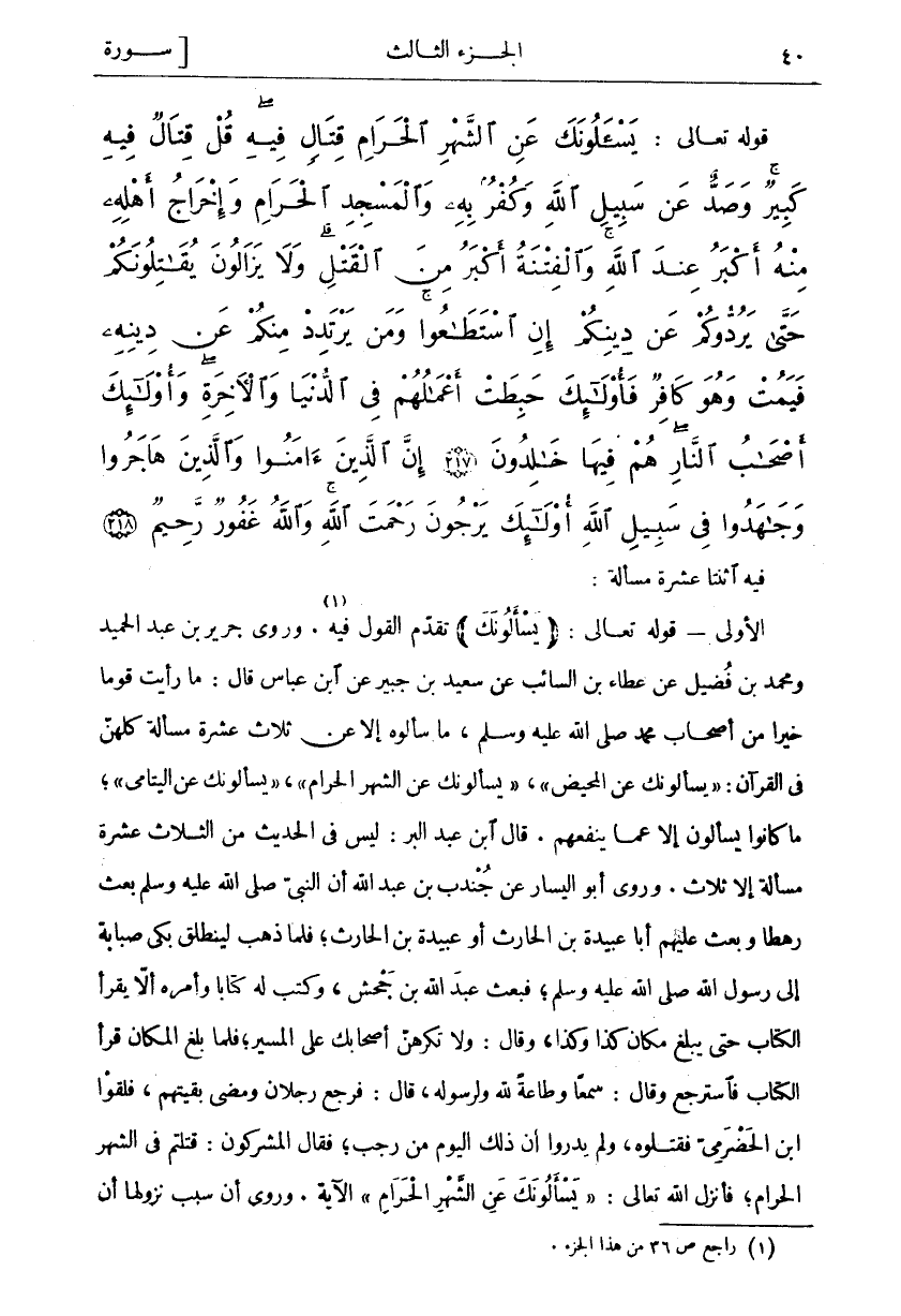 يَسْئَلُونَكَ عَنِ الشَّهْرِ الْحَرامِ قِتالٍ فِيهِ قُلْ قِتالٌ فِيهِ كَبِيرٌ وَصَدٌّ عَنْ سَبِيلِ اللَّهِ وَكُفْرٌ بِهِ وَالْمَسْجِدِ الْحَرامِ وَإِخْراجُ أَهْلِهِ مِنْهُ أَكْبَرُ عِنْدَ اللَّهِ وَالْفِتْنَةُ أَكْبَرُ مِنَ الْقَتْلِ وَلا يَزالُونَ يُقاتِلُونَكُمْ حَتَّى يَرُدُّوكُمْ عَنْ دِينِكُمْ إِنِ اسْتَطاعُوا وَمَنْ يَرْتَدِدْ مِنْكُمْ عَنْ دِينِهِ فَيَمُتْ وَهُوَ كافِرٌ فَأُولئِكَ حَبِطَتْ أَعْمالُهُمْ فِي الدُّنْيا وَالْآخِرَةِ وَأُولئِكَ أَصْحابُ النَّارِ هُمْ فِيها خالِدُونَ (٢١٧) إِنَّ الَّذِينَ آمَنُوا وَالَّذِينَ هاجَرُوا وَجاهَدُوا فِي سَبِيلِ اللَّهِ أُولئِكَ يَرْجُونَ رَحْمَتَ اللَّهِ وَاللَّهُ غَفُورٌ رَحِيمٌ (٢١٨)