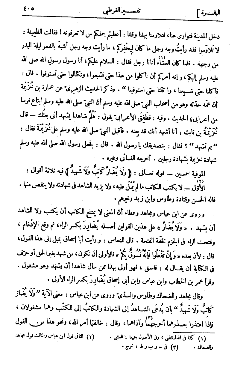 دَخَلَ الْمَدِينَةِ فَتَوَارَى عَنَّا، فَتَلَاوَمْنَا بَيْنَنَا وَقُلْنَا: أَعْطَيْتُمْ جَمَلَكُمْ مَنْ لَا تَعْرِفُونَهُ! فَقَالَتِ الظَّعِينَةُ: لَا تَلَاوَمُوا فَقَدْ رَأَيْتُ وَجْهَ رَجُلٍ مَا كَانَ لِيَخْفِرَكُمْ، مَا رَأَيْتُ وَجْهَ رَجُلٍ أَشْبَهَ بِالْقَمَرِ لَيْلَةَ الْبَدْرِ مِنْ وَجْهِهِ. فَلَمَّا كَانَ الْعِشَاءُ «١» أَتَانَا رَجُلٌ فَقَالَ: السَّلَامُ عَلَيْكُمْ، أَنَا رَسُولُ رَسُولِ اللَّهِ صَلَّى اللَّهُ عَلَيْهِ وَسَلَّمَ إِلَيْكُمْ، وَإِنَّهُ أَمَرَكُمْ أَنْ تَأْكُلُوا مِنْ هَذَا حَتَّى تَشْبَعُوا، وَتَكْتَالُوا حَتَّى تَسْتَوْفُوا. قَالَ: فَأَكَلْنَا حَتَّى شَبِعْنَا، وَاكْتَلْنَا حَتَّى اسْتَوْفَيْنَا". وَذَكَرَ الْحَدِيثَ الزُّهْرِيُّ عَنْ عُمَارَةَ بْنِ خُزَيْمَةَ أَنَّ عَمَّهُ حَدَّثَهُ وَهُوَ مِنْ أَصْحَابِ النَّبِيِّ صَلَّى اللَّهُ عَلَيْهِ وَسَلَّمَ أَنَّ النَّبِيَّ صَلَّى اللَّهُ عَلَيْهِ وَسَلَّمَ ابْتَاعَ فَرَسًا مِنْ أَعْرَابِيٍّ، الْحَدِيثَ. وَفِيهِ: فَطَفِقَ الْأَعْرَابِيُّ يَقُولُ: هَلُمَّ شَاهِدًا يَشْهَدُ أَنِّي بِعْتُكَ- قَالَ خُزَيْمَةُ بْنُ ثَابِتٍ: أَنَا أَشْهَدُ أَنَّكَ قَدْ بِعْتَهُ. فَأَقْبَلَ النَّبِيُّ صَلَّى اللَّهُ عَلَيْهِ وَسَلَّمَ عَلَى خُزَيْمَةَ فَقَالَ:" بِمَ تَشْهَدُ"؟ فَقَالَ: بِتَصْدِيقِكَ يَا رَسُولَ اللَّهِ. قَالَ: فَجَعَلَ رسول الله صلى الله عليه سلم شَهَادَةَ خُزَيْمَةَ بِشَهَادَةِ رَجُلَيْنِ. أَخْرَجَهُ النَّسَائِيُّ وَغَيْرُهُ. الْمُوفِيَةُ خَمْسِينَ- قَوْلُهُ تَعَالَى: (وَلا يُضَارَّ كاتِبٌ وَلا شَهِيدٌ) فِيهِ ثَلَاثَةُ أَقْوَالٍ: الْأَوَّلُ «٢» - لَا يَكْتُبُ الْكَاتِبُ مَا لَمْ يُمْلَ عَلَيْهِ، وَلَا يزيد الشاهد في شهادته ولا ينقض مِنْهَا. قَالَهُ الْحَسَنُ وَقَتَادَةُ وَطَاوُسٌ وَابْنُ زَيْدٍ وَغَيْرُهُمْ. وَرُوِيَ عَنِ ابْنِ عَبَّاسٍ وَمُجَاهِدٍ وَعَطَاءٍ أَنَّ الْمَعْنَى لَا يَمْتَنِعُ الْكَاتِبُ أَنْ يَكْتُبَ وَلَا الشَّاهِدُ أَنْ يَشْهَدَ." وَلا يُضَارَّ" عَلَى هَذَيْنَ الْقَوْلَيْنِ أَصْلُهُ يُضَارِرَ بِكَسْرِ الرَّاءِ، ثُمَّ وَقَعَ الْإِدْغَامُ، وَفُتِحَتِ الرَّاءُ فِي الْجَزْمِ لِخِفَّةِ الْفَتْحَةِ. قَالَ النَّحَّاسُ: وَرَأَيْتُ أَبَا إِسْحَاقَ يَمِيلُ إِلَى هَذَا الْقَوْلِ، قَالَ: لِأَنَّ بَعْدَهُ" وَإِنْ تَفْعَلُوا فَإِنَّهُ فُسُوقٌ بِكُمْ" فَالْأَوْلَى أَنْ تَكُونَ، مَنْ شَهِدَ بِغَيْرِ الْحَقِّ أَوْ حَرَّفَ فِي الْكِتَابَةِ أَنْ يُقَالَ لَهُ: فَاسِقٌ، فَهُوَ أَوْلَى بِهَذَا مِمَّنْ سَأَلَ شَاهِدًا أَنْ يَشْهَدَ وَهُوَ مَشْغُولٌ. وَقَرَأَ عُمَرُ بْنُ الْخَطَّابِ وَابْنُ عَبَّاسٍ وَابْنُ أَبِي إِسْحَاقٍ يُضَارِرَ بِكَسْرِ الرَّاءِ الْأُولَى. وقال مجاهد والضحكاك وَطَاوُسٌ وَالسُّدِّيُّ وَرُوِيَ عَنِ ابْنِ عَبَّاسٍ: مَعْنَى الْآيَةِ" وَلا يُضَارَّ كاتِبٌ وَلا شَهِيدٌ" بِأَنْ يُدْعَى الشَّاهِدُ إِلَى الشَّهَادَةِ وَالْكَاتِبُ إِلَى الْكَتْبِ وَهُمَا مَشْغُولَانِ، فَإِذَا اعْتَذَرَا بِعُذْرِهِمَا أَخْرَجَهُمَا «٣» وَآذَاهُمَا، وقال: خلفتما أمر الله، ونحو هذا من القول