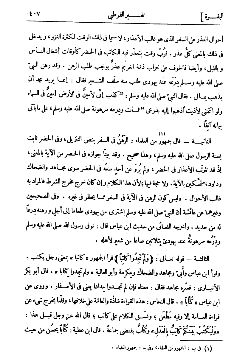 أَحْوَالِ الْعُذْرِ عَلَى السَّفَرِ الَّذِي هُوَ غَالِبُ الْأَعْذَارِ، لَا سِيَّمَا فِي ذَلِكَ الْوَقْتِ لِكَثْرَةِ الْغَزْوِ، وَيَدْخُلُ فِي ذَلِكَ بِالْمَعْنَى كُلُّ عُذْرٍ. فَرُبَّ وَقْتٍ يَتَعَذَّرُ فِيهِ الْكَاتِبُ فِي الْحَضَرِ كَأَوْقَاتِ أَشْغَالِ النَّاسِ وَبِاللَّيْلِ، وَأَيْضًا فَالْخَوْفُ عَلَى خَرَابِ ذِمَّةِ الْغَرِيمِ عُذْرٌ يُوجِبُ طَلَبَ الرَّهْنِ. وَقَدْ رَهَنَ النَّبِيُّ صَلَّى اللَّهُ عَلَيْهِ وَسَلَّمَ دِرْعَهُ عِنْدَ يَهُودِيٍّ طَلَبَ مِنْهُ سَلَفَ الشَّعِيرِ فَقَالَ: إِنَّمَا يُرِيدُ مُحَمَّدٌ أَنْ يَذْهَبَ بِمَالِي. فَقَالَ النَّبِيُّ صَلَّى اللَّهُ عَلَيْهِ وَسَلَّمَ:" كَذَبَ إِنِّي لَأَمِينٌ فِي الْأَرْضِ أَمِينٌ فِي السَّمَاءِ وَلَوِ ائْتَمَنَنِي لَأَدَّيْتُ اذْهَبُوا إِلَيْهِ بِدِرْعِي) فَمَاتَ وَدِرْعُهُ مَرْهُونَةٌ صَلَّى اللَّهُ عَلَيْهِ وَسَلَّمَ، عَلَى مَا يَأْتِي بَيَانُهُ آنِفًا. الثَّانِيَةُ- قَالَ جُمْهُورٌ «١» مِنَ الْعُلَمَاءِ: الرَّهْنُ فِي السَّفَرِ بِنَصِّ التَّنْزِيلِ، وَفِي الْحَضَرِ ثَابِتٌ بِسُنَّةِ الرَّسُولِ صَلَّى اللَّهُ عَلَيْهِ وَسَلَّمَ، وَهَذَا صَحِيحٌ. وَقَدْ بَيَّنَّا جَوَازَهُ في الحضر من الآية بالمعنى، إذا قَدْ تَتَرَتَّبُ الْأَعْذَارُ فِي الْحَضَرِ، وَلَمْ يُرْوَ عَنْ أَحَدٍ مَنْعُهُ فِي الْحَضَرِ سِوَى مُجَاهِدٍ وَالضَّحَّاكِ وَدَاوُدَ، مُتَمَسِّكِينَ بِالْآيَةِ. وَلَا حُجَّةَ فِيهَا، لِأَنَّ هَذَا الْكَلَامَ وَإِنْ كَانَ خَرَجَ مَخْرَجَ الشَّرْطِ فَالْمُرَادُ بِهِ غَالِبُ الْأَحْوَالِ. وَلَيْسَ كَوْنُ الرَّهْنِ فِي الْآيَةِ فِي السَّفَرِ مِمَّا يُحْظَرُ فِي غَيْرِهِ. وَفِي الصَّحِيحَيْنِ وَغَيْرِهِمَا عَنْ عَائِشَةَ أَنَّ النَّبِيَّ صَلَّى اللَّهُ عَلَيْهِ وَسَلَّمَ اشْتَرَى مِنْ يَهُودِيٍّ طَعَامًا إِلَى أَجَلٍ وَرَهَنَهُ دِرْعًا لَهُ مِنْ حَدِيدٍ. وَأَخْرَجَهُ النَّسَائِيُّ مِنْ حَدِيثِ ابْنِ عَبَّاسٍ قَالَ: تُوُفِّيَ رَسُولُ اللَّهِ صَلَّى اللَّهُ عَلَيْهِ وَسَلَّمَ وَدِرْعُهُ مَرْهُونَةٌ عِنْدَ يَهُودِيٍّ بِثَلَاثِينَ صَاعًا مِنْ شَعِيرٍ لِأَهْلِهِ. الثَّالِثَةُ- قَوْلُهُ تَعَالَى: (وَلَمْ تَجِدُوا كاتِباً) قَرَأَ الْجُمْهُورُ" كاتِباً" بِمَعْنَى رَجُلٍ يَكْتُبُ. وَقَرَأَ ابْنُ عَبَّاسٍ وَأُبَيٌّ وَمُجَاهِدٌ وَالضَّحَّاكُ وَعِكْرِمَةُ وَأَبُو الْعَالِيَةِ" وَلَمْ تَجِدُوا كِتَابًا". قَالَ أَبُو بَكْرٍ الْأَنْبَارِيُّ: فَسَّرَهُ مُجَاهِدٌ فَقَالَ: مَعْنَاهُ فَإِنْ لَمْ تَجِدُوا مِدَادًا يَعْنِي فِي الْأَسْفَارِ. وَرُوِيَ عَنِ ابْنِ عَبَّاسٍ" كُتَّابًا". قَالَ النَّحَّاسُ: هَذِهِ الْقِرَاءَةُ شَاذَّةٌ وَالْعَامَّةُ عَلَى خلافها. وقلما يخرج شي عَنْ قِرَاءَةِ الْعَامَّةِ إِلَّا وَفِيهِ مَطْعَنٌ، وَنَسَقُ الْكَلَامِ عَلَى كَاتِبٍ، قَالَ اللَّهُ عَزَّ وَجَلَّ قبل هذا:" وَلْيَكْتُبْ بَيْنَكُمْ كاتِبٌ بِالْعَدْلِ" وكتاب يَقْتَضِي جَمَاعَةً. قَالَ ابْنُ عَطِيَّةَ: كُتَّابًا يَحْسُنُ من حيث