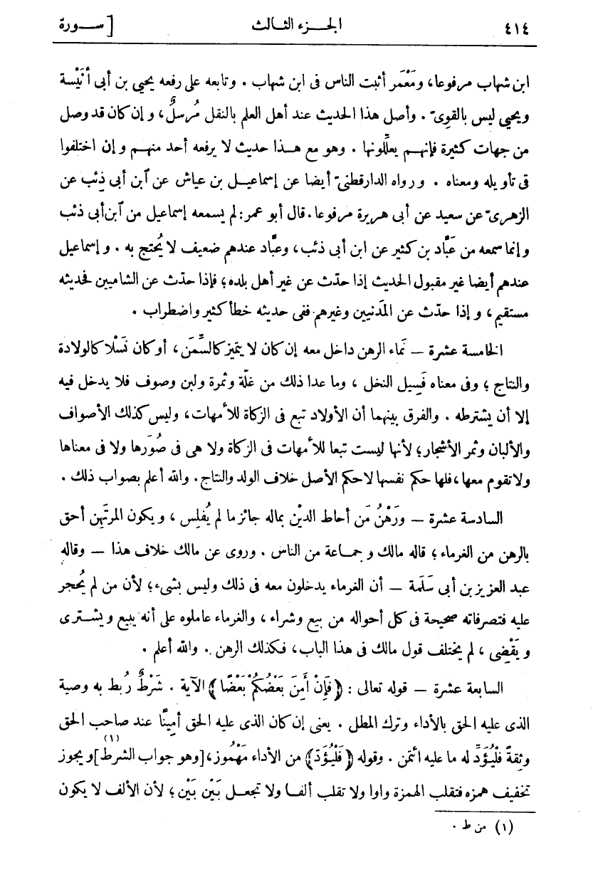 ابْنِ شِهَابٍ مَرْفُوعًا، وَمَعْمَرٌ أَثْبَتُ النَّاسِ فِي ابْنِ شِهَابٍ. وَتَابَعَهُ عَلَى رَفْعِهِ يَحْيَى بْنُ أَبِي أُنَيْسَةَ وَيَحْيَى لَيْسَ بِالْقَوِيِّ. وَأَصْلُ هَذَا الْحَدِيثِ عِنْدَ أَهْلِ الْعِلْمِ بِالنَّقْلِ مُرْسَلٌ، وَإِنْ كَانَ قَدْ وَصَلَ مِنْ جِهَاتٍ كَثِيرَةٍ فَإِنَّهُمْ يُعَلِّلُونَهَا. وَهُوَ مَعَ هَذَا حَدِيثٌ لَا يَرْفَعُهُ أَحَدٌ مِنْهُمْ وَإِنِ اخْتَلَفُوا فِي تَأْوِيلِهِ وَمَعْنَاهُ. وَرَوَاهُ الدَّارَقُطْنِيُّ أَيْضًا عَنْ إِسْمَاعِيلَ بْنِ عَيَّاشٍ عن ابن أبي ذئب عن الزهري عن سَعِيدٍ عَنْ أَبِي هُرَيْرَةَ مَرْفُوعًا. قَالَ أَبُو عُمَرَ: لَمْ يَسْمَعْهُ إِسْمَاعِيلُ مِنِ ابْنِ أَبِي ذِئْبٍ وَإِنَّمَا سَمِعَهُ مِنْ عَبَّادِ بْنِ كَثِيرٍ عَنِ ابْنِ أَبِي ذِئْبٍ، وَعَبَّادٌ عِنْدَهُمْ ضَعِيفٌ لَا يُحْتَجُّ بِهِ. وَإِسْمَاعِيلُ عِنْدَهُمْ أَيْضًا غَيْرُ مَقْبُولِ الْحَدِيثِ إِذَا حَدَّثَ عَنْ غَيْرِ أَهْلِ بَلَدِهِ، فَإِذَا حَدَّثَ عَنِ الشَّامِيِّينَ فَحَدِيثُهُ مُسْتَقِيمٌ، وَإِذَا حَدَّثَ عَنِ الْمَدَنِيِّينَ وَغَيْرِهِمْ فَفِي حَدِيثِهِ خَطَأٌ كَثِيرٌ وَاضْطِرَابٌ. الْخَامِسَةَ عَشْرَةَ- نَمَاءُ الرَّهْنِ دَاخِلٌ مَعَهُ إِنْ كَانَ لَا يَتَمَيَّزُ كَالسِّمَنِ، أَوْ كَانَ نَسْلًا كَالْوِلَادَةِ وَالنِّتَاجِ، وَفِي مَعْنَاهُ فَسِيلُ النَّخْلِ، وَمَا عَدَا ذَلِكَ مِنْ غَلَّةٍ وَثَمَرَةٍ وَلَبَنٍ وَصُوفٍ فَلَا يَدْخُلُ فِيهِ إِلَّا أَنْ يَشْتَرِطَهُ. وَالْفَرْقُ بَيْنَهُمَا أَنَّ الْأَوْلَادَ تَبَعٌ فِي الزَّكَاةِ لِلْأُمَّهَاتِ، وَلَيْسَ كَذَلِكَ الْأَصْوَافُ وَالْأَلْبَانُ وَثَمَرُ الْأَشْجَارِ، لِأَنَّهَا لَيْسَتْ تَبَعًا لِلْأُمَّهَاتِ فِي الزَّكَاةِ وَلَا هِيَ فِي صُوَرِهَا وَلَا فِي مَعْنَاهَا وَلَا تَقُومُ مَعَهَا، فَلَهَا حُكْمُ نَفْسِهَا لَا حُكْمُ الْأَصْلِ خِلَافَ الْوَلَدِ وَالنِّتَاجِ. وَاللَّهُ أَعْلَمُ بِصَوَابِ ذَلِكَ. السَّادِسَةَ عَشْرَةَ- وَرَهْنُ مَنْ أَحَاطَ الدَّيْنُ بِمَالِهِ جَائِزٌ مَا لَمْ يُفْلِسْ، وَيَكُونُ الْمُرْتَهِنُ أَحَقَّ بِالرَّهْنِ مِنَ الْغُرَمَاءِ، قَالَهُ مَالِكٌ وَجَمَاعَةٌ مِنَ النَّاسِ. وَرُوِيَ عَنْ مَالِكٍ خِلَافُ هَذَا- وَقَالَهُ عَبْدُ الْعَزِيزِ بْنُ أَبِي سَلَمَةَ- إِنَّ الْغُرَمَاءَ يَدْخُلُونَ مَعَهُ فِي ذَلِكَ وَلَيْسَ بِشَيْءٍ، لِأَنَّ مَنْ لَمْ يُحْجَرْ عَلَيْهِ فَتَصَرُّفَاتُهُ صَحِيحَةٌ فِي كُلِّ أَحْوَالِهِ مِنْ بَيْعٍ وَشِرَاءٍ، وَالْغُرَمَاءُ عَامَلُوهُ عَلَى أَنَّهُ يَبِيعُ وَيَشْتَرِي وَيَقْضِي، لَمْ يَخْتَلِفْ قَوْلُ مَالِكٍ فِي هَذَا الْبَابِ، فَكَذَلِكَ الرَّهْنُ. وَاللَّهُ أَعْلَمُ. السَّابِعَةَ عَشْرَةَ- قوله تعالى: (فَإِنْ أَمِنَ بَعْضُكُمْ بَعْضاً) الْآيَةُ. شَرْطٌ رُبِطَ بِهِ وَصِيَّةُ الَّذِي عَلَيْهِ الْحَقُّ بِالْأَدَاءِ وَتَرْكِ الْمَطْلِ. يَعْنِي إِنْ كَانَ الَّذِي عَلَيْهِ الْحَقُّ أَمِينًا عِنْدَ صَاحِبِ الْحَقِّ وَثِقَةً فَلْيُؤَدِّ لَهُ ما عليه ائتمن. وَقَوْلُهُ (فَلْيُؤَدِّ) مِنَ الْأَدَاءِ مَهْمُوزٌ، [وَهُوَ جَوَابُ الشَّرْطِ «١» [وَيَجُوزُ تَخْفِيفُ هَمْزِهِ فَتُقْلَبُ الْهَمْزَةُ وَاوًا وَلَا تُقْلَبُ أَلِفًا وَلَا تُجْعَلُ بَيْنَ بَيْنَ، لان الالف لا يكون