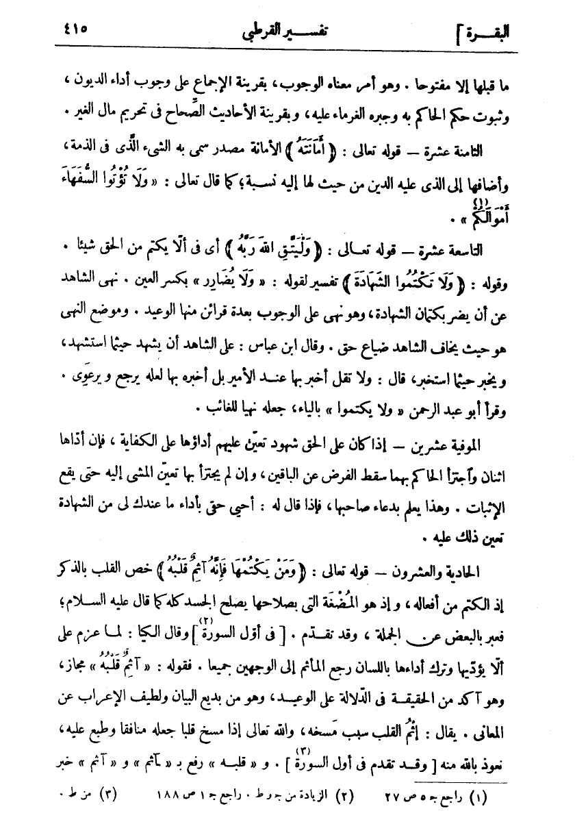 مَا قَبْلَهَا إِلَّا مَفْتُوحًا. وَهُوَ أَمْرٌ مَعْنَاهُ الْوُجُوبُ، بِقَرِينَةِ الْإِجْمَاعِ عَلَى وُجُوبِ أَدَاءِ الدُّيُونِ، وَثُبُوتِ حُكْمِ الْحَاكِمِ بِهِ وَجَبْرِهِ الْغُرَمَاءَ عَلَيْهِ، وَبِقَرِينَةِ الْأَحَادِيثِ الصِّحَاحِ فِي تَحْرِيمِ مَالِ الْغَيْرِ. الثَّامِنَةَ عَشْرَةَ- قَوْلُهُ تَعَالَى: (أَمانَتَهُ) الْأَمَانَةُ مَصْدَرٌ سُمِّيَ بِهِ الشَّيْءُ الَّذِي فِي الذِّمَّةِ، وَأَضَافَهَا إِلَى الَّذِي عَلَيْهِ الدَّيْنُ مِنْ حَيْثُ لَهَا إِلَيْهِ نِسْبَةٌ، كَمَا قَالَ تَعَالَى:" وَلا تُؤْتُوا السُّفَهاءَ أَمْوالَكُمُ «١» ". التَّاسِعَةَ عَشْرَةَ- قَوْلُهُ تَعَالَى: (وَلْيَتَّقِ اللَّهَ رَبَّهُ) أَيْ فِي أَلَّا يَكْتُمَ مِنَ الحق شيئا. وقوله: (وَلا تَكْتُمُوا الشَّهادَةَ) تَفْسِيرٌ لِقَوْلِهِ:" وَلَا يُضَارِرَ" بِكَسْرِ الْعَيْنِ. نَهَى الشَّاهِدَ عَنْ أَنْ يَضُرَّ بِكِتْمَانِ الشَّهَادَةِ، وَهُوَ نَهْيٌ عَلَى الْوُجُوبِ بِعِدَّةِ قَرَائِنَ مِنْهَا الْوَعِيدُ. وَمَوْضِعُ النَّهْيِ هُوَ حَيْثُ يَخَافُ الشَّاهِدُ ضَيَاعَ حَقٍّ. وَقَالَ ابْنُ عَبَّاسٍ: عَلَى الشَّاهِدِ أَنْ يَشْهَدَ حَيْثُمَا اسْتُشْهِدَ، وَيُخْبِرَ حَيْثُمَا اسْتُخْبِرَ، قَالَ: وَلَا تَقُلْ أُخْبِرُ بِهَا عِنْدَ الْأَمِيرِ بَلْ أَخْبِرْهُ بِهَا لَعَلَّهُ يَرْجِعُ وَيَرْعَوِي. وَقَرَأَ أَبُو عَبْدِ الرَّحْمَنِ وَلَا يَكْتُمُوا" بِالْيَاءِ، جَعَلَهُ نَهْيًا لِلْغَائِبِ. الْمُوفِيَةُ عِشْرِينَ- إِذَا كَانَ عَلَى الْحَقِّ شُهُودٌ تَعَيَّنَ عَلَيْهِمْ أَدَاؤُهَا عَلَى الْكِفَايَةِ، فَإِنْ أَدَّاهَا اثْنَانِ وَاجْتَزَأَ الْحَاكِمُ بِهِمَا سَقَطَ الْفَرْضُ عَنِ الْبَاقِينَ، وَإِنْ لَمْ يُجْتَزَأْ بِهَا تَعَيَّنَ الْمَشْيُ إِلَيْهِ حَتَّى يَقَعَ الْإِثْبَاتُ. وَهَذَا يُعْلَمُ بِدُعَاءِ صَاحِبِهَا، فَإِذَا قَالَ له: أحى حَقِّي بِأَدَاءِ مَا عِنْدَكَ لِي مِنَ الشَّهَادَةِ تَعَيَّنَ ذَلِكَ عَلَيْهِ. الْحَادِيَةُ وَالْعِشْرُونَ- قَوْلُهُ تَعَالَى: (وَمَنْ يَكْتُمْها فَإِنَّهُ آثِمٌ قَلْبُهُ) خَصَّ الْقَلْبَ بِالذِّكْرِ إِذِ الْكَتْمُ مِنْ أَفْعَالِهِ، وَإِذْ هُوَ الْمُضْغَةُ الَّتِي بِصَلَاحِهَا يَصْلُحُ الْجَسَدُ كُلُّهُ كَمَا قَالَ عَلَيْهِ السَّلَامُ، فَعَبَّرَ بِالْبَعْضِ عَنِ الْجُمْلَةِ، وَقَدْ تَقَدَّمَ. [فِي أَوَّلِ السُّورَةِ «٢» [وَقَالَ الْكِيَا: لَمَّا عَزَمَ عَلَى أَلَّا يُؤَدِّيَهَا وَتَرَكَ أَدَاءَهَا بِاللِّسَانِ رَجَعَ الْمَأْثَمُ إِلَى الْوَجْهَيْنِ جَمِيعًا. فَقَوْلُهُ:" آثِمٌ قَلْبُهُ" مَجَازٌ، وَهُوَ آكَدُ مِنَ الْحَقِيقَةِ فِي الدَّلَالَةِ عَلَى الْوَعِيدِ، وَهُوَ مِنْ بَدِيعِ الْبَيَانِ وَلَطِيفِ الْإِعْرَابِ عَنِ الْمَعَانِي. يُقَالُ: إِثْمُ الْقَلْبِ سَبَبُ مَسْخِهِ، وَاللَّهُ تَعَالَى إِذَا مَسَخَ قَلْبًا جَعَلَهُ مُنَافِقًا وَطَبَعَ عَلَيْهِ، نَعُوذُ بِاللَّهِ مِنْهُ [وَقَدْ تَقَدَّمَ فِي أَوَّلِ السُّورَةِ «٣»]. وَ" قَلْبُهُ" رُفِعَ بِ" آثِمٌ" وَ" آثِمٌ" خَبَرُ