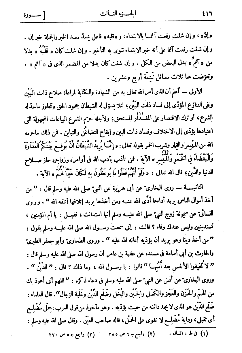 " إِنْ"، وَإِنْ شِئْتَ رَفَعْتَ آثِمًا بِالِابْتِدَاءِ، وَ" قَلْبُهُ" فَاعِلٌ يَسُدُّ مَسَدَّ الْخَبَرِ وَالْجُمْلَةُ خَبَرُ إِنَّ. وَإِنْ شِئْتَ رَفَعْتَ آثِمًا عَلَى أَنَّهُ خَبَرُ الِابْتِدَاءِ تَنْوِي بِهِ التَّأْخِيرَ. وَإِنْ شِئْتَ كَانَ" قَلْبُهُ" بَدَلًا مِنْ" آثِمٌ" بَدَلَ الْبَعْضِ مِنَ الْكُلِّ. وَإِنْ شِئْتَ كَانَ بَدَلًا مِنَ الْمُضْمَرِ الَّذِي فِي" آثِمٌ". وَتَعَرَّضَتْ هُنَا ثَلَاثُ مَسَائِلَ تَتِمَّةُ أَرْبَعٍ وَعِشْرِينَ. الْأُولَى- اعْلَمْ أَنَّ الَّذِي أَمَرَ اللَّهُ تَعَالَى بِهِ مِنَ الشَّهَادَةِ وَالْكِتَابَةِ لِمُرَاعَاةِ صَلَاحِ ذَاتِ الْبَيْنِ وَنَفْيِ التَّنَازُعِ الْمُؤَدِّي إِلَى فَسَادِ ذَاتِ الْبَيْنِ، لِئَلَّا يُسَوِّلَ لَهُ الشَّيْطَانُ جُحُودَ الْحَقِّ وَتَجَاوُزَ مَا حَدَّ لَهُ الشَّرْعُ، أَوْ تَرْكِ الِاقْتِصَارِ عَلَى الْمِقْدَارِ «١» الْمُسْتَحَقِّ، وَلِأَجْلِهِ حَرَّمَ الشَّرْعُ الْبِيَاعَاتِ الْمَجْهُولَةَ الَّتِي اعْتِيَادُهَا يُؤَدِّي إِلَى الِاخْتِلَافِ وَفَسَادِ ذَاتِ الْبَيْنِ وَإِيقَاعِ التَّضَاغُنِ وَالتَّبَايُنِ. فَمِنْ ذَلِكَ مَا حَرَّمَهُ اللَّهُ مِنَ الْمَيْسِرِ وَالْقِمَارِ وَشُرْبِ الْخَمْرِ بِقَوْلِهِ تَعَالَى:" إِنَّما يُرِيدُ الشَّيْطانُ أَنْ يُوقِعَ بَيْنَكُمُ الْعَداوَةَ وَالْبَغْضاءَ فِي الْخَمْرِ وَالْمَيْسِرِ «٢» " الْآيَةَ. فَمَنْ تَأَدَّبَ بِأَدَبِ اللَّهِ فِي أَوَامِرِهِ وَزَوَاجِرِهِ حَازَ صَلَاحَ الدُّنْيَا وَالدِّينِ، قَالَ اللَّهُ تَعَالَى:" وَلَوْ أَنَّهُمْ فَعَلُوا مَا يُوعَظُونَ بِهِ لَكانَ خَيْراً لَهُمْ «٣» " الْآيَةَ. الثَّانِيَةُ- رَوَى الْبُخَارِيِّ عَنْ أَبِي هُرَيْرَةَ عَنِ النَّبِيِّ صَلَّى اللَّهُ عَلَيْهِ وَسَلَّمَ قَالَ:" مَنْ أَخَذَ أَمْوَالَ النَّاسِ يُرِيدُ أَدَاءَهَا أَدَّى اللَّهُ عَنْهُ وَمَنْ أَخَذَهَا يُرِيدُ إِتْلَافَهَا أَتْلَفَهُ اللَّهُ". وَرَوَى النَّسَائِيُّ عَنْ مَيْمُونَةَ زَوْجِ النَّبِيِّ صَلَّى اللَّهُ عَلَيْهِ وَسَلَّمَ أَنَّهَا اسْتَدَانَتْ، فَقِيلَ: يَا أُمَّ الْمُؤْمِنِينَ، تَسْتَدِينِينَ وَلَيْسَ عِنْدَكِ وَفَاءٌ؟ قَالَتْ: إِنِّي سَمِعْتُ رَسُولَ اللَّهِ صَلَّى اللَّهُ عَلَيْهِ وَسَلَّمَ يَقُولُ: (مَنْ أَخَذَ دَيْنًا وَهُوَ يُرِيدُ أَنْ يُؤَدِّيَهُ أَعَانَهُ اللَّهُ عَلَيْهِ). وَرَوَى الطَّحَاوِيُّ وَأَبُو جَعْفَرٍ الطَّبَرِيُّ وَالْحَارِثُ بْنُ أَبِي أُسَامَةَ فِي مُسْنَدِهِ عَنْ عُقْبَةَ بْنِ عَامِرٍ أَنَّ رَسُولَ اللَّهِ صَلَّى اللَّهُ عَلَيْهِ وَسَلَّمَ قَالَ:" لَا تُخِيفُوا الْأَنْفُسَ بَعْدَ أَمْنِهَا" قَالُوا: يَا رَسُولَ اللَّهِ، وَمَا ذَاكَ؟ قَالَ:" الدَّيْنُ". وَرَوَى الْبُخَارِيُّ عَنْ أَنَسٍ عَنِ النَّبِيِّ صَلَّى اللَّهُ عَلَيْهِ وَسَلَّمَ فِي دُعَاءٍ ذَكَرَهُ:" اللَّهُمَّ إِنِّي أَعُوَذُ بِكَ مِنَ الْهَمِّ وَالْحَزَنِ وَالْعَجْزِ وَالْكَسَلِ وَالْجُبْنِ وَالْبُخْلِ وَضَلَعِ الدَّيْنِ وَغَلَبَةِ الرِّجَالِ". قَالَ الْعُلَمَاءُ: ضَلَعُ الدَّيْنِ هُوَ الَّذِي لَا يَجِدُ دَائِنُهُ مِنْ حَيْثُ يُؤَدِّيهِ. وَهُوَ مَأْخُوذٌ مِنْ قَوْلِ الْعَرَبِ: حِمْلٌ مُضْلِعٌ أَيْ ثَقِيلٌ، وَدَابَّةٌ مُضْلِعٌ لَا تَقْوَى عَلَى الْحَمْلِ، قال صَاحِبُ الْعَيْنِ. وَقَالَ صَلَّى اللَّهُ عَلَيْهِ وَسَلَّمَ: