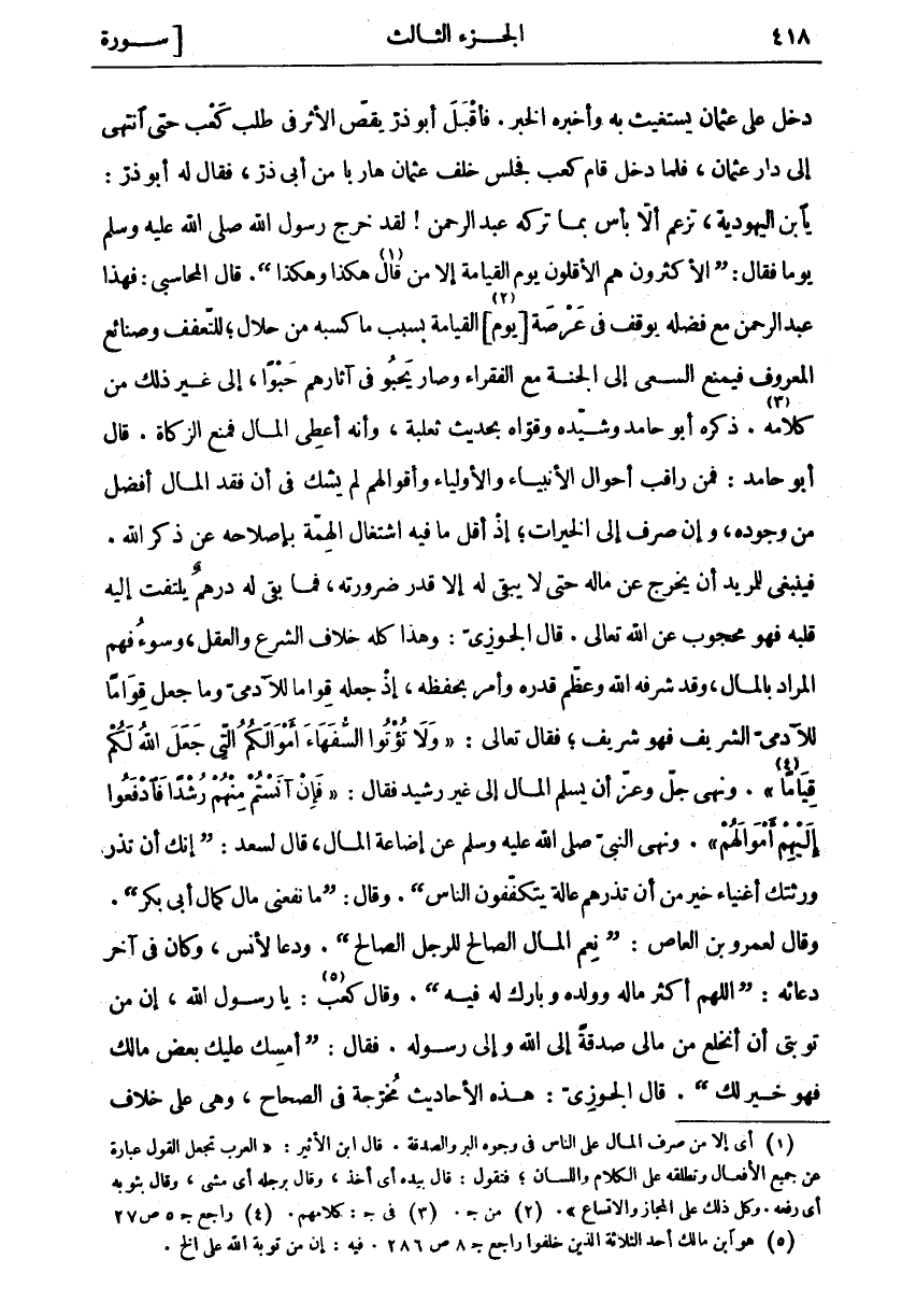 دَخَلَ عَلَى عُثْمَانَ يَسْتَغِيثُ بِهِ وَأَخْبَرَهُ الْخَبَرَ. فَأَقْبَلَ أَبُو ذَرٍّ يَقُصُّ الْأَثَرَ فِي طَلَبِ كَعْبٍ حَتَّى انْتَهَى إِلَى دَارِ عُثْمَانَ، فَلَمَّا دَخَلَ قَامَ كَعْبٌ فَجَلَسَ خَلْفَ عُثْمَانَ هَارِبًا مِنْ أَبِي ذَرٍّ، فَقَالَ لَهُ أَبُو ذَرٍّ: يَا ابْنَ الْيَهُودِيَّةِ، تَزْعُمُ أَلَّا بَأْسَ بِمَا تَرَكَهُ عَبْدُ الرَّحْمَنِ! لَقَدْ خَرَجَ رَسُولُ اللَّهِ صَلَّى اللَّهُ عَلَيْهِ وَسَلَّمَ يَوْمًا فَقَالَ:" الْأَكْثَرُونَ هُمُ الْأَقَلُّونَ يَوْمَ الْقِيَامَةِ إِلَّا مَنْ قَالَ «١» هَكَذَا وَهَكَذَا". قَالَ الْمُحَاسِبِيُّ: فَهَذَا عَبْدُ الرَّحْمَنِ مَعَ فَضْلِهِ يُوقَفُ فِي عَرْصَةِ [يَوْمَ «٢»] الْقِيَامَةِ بِسَبَبِ مَا كَسَبَهُ مِنْ حَلَالٍ، لِلتَّعَفُّفِ وَصَنَائِعِ الْمَعْرُوفِ فَيُمْنَعُ السَّعْيَ إِلَى الْجَنَّةِ مَعَ الْفُقَرَاءِ وَصَارَ يَحْبُو فِي آثَارِهِمْ حَبْوًا، إِلَى غَيْرِ ذَلِكَ مِنْ كَلَامِهِ «٣». ذَكَرَهُ أَبُو حَامِدٍ وَشَيَّدَهُ وَقَوَّاهُ بِحَدِيثِ ثَعْلَبَةَ، وَأَنَّهُ أُعْطِيَ الْمَالَ فَمَنَعَ الزَّكَاةَ. قَالَ أَبُو حَامِدٍ: فَمَنْ رَاقَبَ أَحْوَالَ الْأَنْبِيَاءِ وَالْأَوْلِيَاءِ وَأَقْوَالَهُمْ لَمْ يَشُكَّ فِي أَنَّ فَقْدَ الْمَالِ أَفْضَلُ مِنْ وُجُودِهِ، وَإِنْ صُرِفَ إِلَى الْخَيْرَاتِ، إِذْ أَقَلُّ مَا فِيهِ اشْتِغَالُ الْهِمَّةِ بِإِصْلَاحِهِ عَنْ ذِكْرِ اللَّهِ. فَيَنْبَغِي لِلْمُرِيدِ أَنْ يُخْرِجَ عَنْ مَالِهِ حَتَّى لَا يَبْقَى لَهُ إِلَّا قَدْرُ ضَرُورَتِهِ، فَمَا بَقِيَ لَهُ دِرْهَمٌ يَلْتَفِتُ إِلَيْهِ قَلْبُهُ فَهُوَ مَحْجُوبٌ عَنِ اللَّهِ تَعَالَى. قَالَ الْجَوْزِيُّ: وَهَذَا كُلُّهُ خِلَافُ الشَّرْعِ وَالْعَقْلِ، وَسُوءُ فَهْمِ الْمُرَادِ بِالْمَالِ، وَقَدْ شَرَّفَهُ اللَّهُ وَعَظَّمَ قَدْرَهُ وَأَمَرَ بِحِفْظِهِ، إِذْ جَعَلَهُ قِوَامًا لِلْآدَمِيِّ وَمَا جُعِلَ قِوَامًا لِلْآدَمِيِّ الشَّرِيفِ فَهُوَ شَرِيفٌ، فَقَالَ تَعَالَى:" وَلا تُؤْتُوا السُّفَهاءَ أَمْوالَكُمُ الَّتِي جَعَلَ اللَّهُ لَكُمْ قِياماً «٤» ". ونهى عز وجل أَنْ يُسَلَّمَ الْمَالُ إِلَى غَيْرِ رَشِيدٍ فَقَالَ:" فَإِنْ آنَسْتُمْ مِنْهُمْ رُشْداً فَادْفَعُوا إِلَيْهِمْ أَمْوالَهُمْ". وَنَهَى النَّبِيُّ صَلَّى اللَّهُ عَلَيْهِ وَسَلَّمَ عَنْ إِضَاعَةِ الْمَالِ، قَالَ لِسَعْدٍ:" إِنَّكَ أَنْ تَذَرَ وَرَثَتَكَ أَغْنِيَاءَ خَيْرٌ مِنْ أَنْ تَذَرَهُمْ عَالَةً يَتَكَفَّفُونَ النَّاسَ. وَقَالَ:" مَا نَفَعَنِي مَالٌ كَمَالِ أَبِي بَكْرٍ". وَقَالَ لِعَمْرِو بْنِ الْعَاصِ:" نِعْمَ الْمَالُ الصَّالِحُ لِلرَّجُلِ الصَّالِحِ". وَدَعَا لِأَنَسٍ، وَكَانَ فِي آخِرِ دُعَائِهِ:" اللَّهُمَّ أَكْثِرْ مَالَهُ وَوَلَدَهُ وَبَارِكْ لَهُ فِيهِ". وَقَالَ كَعْبٌ «٥»: يَا رَسُولَ اللَّهِ، إِنَّ مِنْ تَوْبَتِي أَنْ أَنْخَلِعَ مِنْ مَالِي صَدَقَةً إِلَى اللَّهِ وَإِلَى رَسُولِهِ. فَقَالَ:" أَمْسِكْ عَلَيْكَ بَعْضَ مَالِكَ فَهُوَ خَيْرٌ لَكَ". قَالَ الْجَوْزِيُّ: هَذِهِ الْأَحَادِيثُ مُخَرَّجَةٌ فِي الصِّحَاحِ، وهى على خلاف