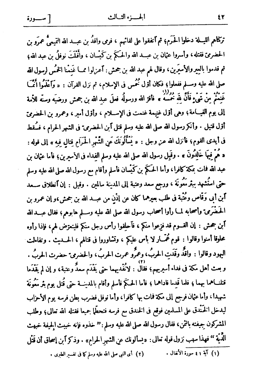 تَرَكْنَاهُمُ اللَّيْلَةَ دَخَلُوا الْحَرَمَ، ثُمَّ اتَّفَقُوا عَلَى لِقَائِهِمْ، فَرَمَى وَاقِدُ بْنُ عَبْدِ اللَّهِ التَّمِيمِيُّ عَمْرَو بْنَ الْحَضْرَمِيِّ فَقَتَلَهُ، وَأَسَرُوا عُثْمَانَ بْنَ عَبْدِ اللَّهِ وَالْحَكَمَ بْنَ كَيْسَانَ، وَأَفْلَتَ نَوْفَلُ بْنُ عَبْدِ اللَّهِ، ثُمَّ قَدِمُوا بِالْعِيرِ وَالْأَسِيرَيْنِ، وَقَالَ لَهُمْ عَبْدُ اللَّهِ بْنُ جَحْشٍ: اعْزِلُوا مِمَّا غَنِمْنَا الْخُمُسَ لِرَسُولِ اللَّهِ صَلَّى اللَّهُ عَلَيْهِ وَسَلَّمَ فَفَعَلُوا، فَكَانَ أَوَّلَ خُمُسٍ فِي الْإِسْلَامِ، ثُمَّ نَزَلَ الْقُرْآنُ:" وَاعْلَمُوا أَنَّما غَنِمْتُمْ مِنْ شَيْءٍ فَأَنَّ لِلَّهِ خُمُسَهُ «١» " فَأَقَرَّ اللَّهُ وَرَسُولُهُ فِعْلَ عَبْدِ اللَّهِ بْنِ جَحْشٍ وَرَضِيَهُ وَسَنَّهُ لِلْأُمَّةِ إِلَى يَوْمِ الْقِيَامَةِ، وَهِيَ أَوَّلُ غَنِيمَةٍ غُنِمَتْ فِي الْإِسْلَامِ، وَأَوَّلُ أَمِيرٍ، وَعَمْرُو بْنُ الْحَضْرَمِيِّ أَوَّلُ قَتِيلٍ. وَأَنْكَرَ رَسُولُ اللَّهِ صَلَّى اللَّهُ عَلَيْهِ وَسَلَّمَ قَتْلَ ابْنِ الْحَضْرَمِيِّ فِي الشَّهْرِ الْحَرَامِ، فَسَقَطَ فِي أَيْدِي الْقَوْمِ، فأنزل الله عز وجل:" يَسْئَلُونَكَ عَنِ الشَّهْرِ الْحَرامِ قِتالٍ فِيهِ" إِلَى قَوْلِهِ:" هُمْ فِيها خالِدُونَ". وَقَبِلَ رَسُولُ اللَّهِ صَلَّى اللَّهُ عَلَيْهِ وَسَلَّمَ الْفِدَاءَ فِي الْأَسِيرَيْنِ، فَأَمَّا عُثْمَانُ بْنُ عَبْدِ اللَّهِ فَمَاتَ بِمَكَّةَ كَافِرًا، وَأَمَّا الْحَكَمُ بْنُ كَيْسَانَ فَأَسْلَمَ وَأَقَامَ مَعَ رَسُولِ اللَّهِ صَلَّى اللَّهُ عَلَيْهِ وَسَلَّمَ حتى اسْتُشْهِدَ بِبِئْرِ مَعُونَةَ، وَرَجَعَ سَعْدٌ وَعُتْبَةُ إِلَى الْمَدِينَةِ سَالِمَيْنِ. وَقِيلَ: إِنَّ انْطِلَاقَ سَعْدِ بْنِ أَبِي وَقَّاصٍ وَعُتْبَةَ فِي طَلَبِ بَعِيرِهِمَا كَانَ عَنْ إِذْنٍ مِنْ عَبْدِ اللَّهِ بْنِ جَحْشٍ، وَإِنَّ عَمْرَو بْنَ الْحَضْرَمِيِّ وَأَصْحَابَهُ لَمَّا رَأَوْا أَصْحَابِ رَسُولِ اللَّهِ صَلَّى اللَّهُ عَلَيْهِ وَسَلَّمَ هَابُوهُمْ، فَقَالَ عَبْدُ اللَّهِ بْنُ جَحْشٍ: إِنَّ الْقَوْمَ قَدْ فَزِعُوا مِنْكُمْ، فَاحْلِقُوا رَأْسَ رَجُلٍ مِنْكُمْ فَلْيَتَعَرَّضْ لَهُمْ، فَإِذَا رَأَوْهُ مَحْلُوقًا أَمِنُوا وَقَالُوا: قَوْمٌ عُمَّارٌ لَا بَأْسَ عَلَيْكُمْ، وَتَشَاوَرُوا فِي قِتَالِهِمُ، الْحَدِيثَ. وَتَفَاءَلَتِ الْيَهُودُ وَقَالُوا: وَاقِدٌ وَقَدَتِ الْحَرْبُ، وَعَمْرٌو عَمَرَتِ الْحَرْبُ، وَالْحَضْرَمِيُّ حَضَرَتِ الْحَرْبُ. وَبَعَثَ أَهْلُ مَكَّةَ فِي فَدَاءِ أَسِيرَيْهِمْ، فَقَالَ «٢»: لَا نَفْدِيهِمَا حَتَّى يَقْدَمَ سَعْدٌ وَعُتْبَةُ، وَإِنْ لَمْ يَقْدَمَا قَتَلْنَاهُمَا بِهِمَا، فَلَمَّا قَدِمَا فَادَاهُمَا، فَأَمَّا الْحَكَمُ فَأَسْلَمَ وَأَقَامَ بِالْمَدِينَةِ حَتَّى قُتِلَ يَوْمَ بِئْرِ مَعُونَةَ شَهِيدًا، وَأَمَّا عُثْمَانُ فَرَجَعَ إِلَى مَكَّةَ فَمَاتَ بِهَا كَافِرًا، وَأَمَّا نَوْفَلٌ فَضَرَبَ بَطْنَ فَرَسِهِ يَوْمَ الْأَحْزَابِ لِيَدْخُلَ الْخَنْدَقَ عَلَى الْمُسْلِمِينَ فَوَقَعَ فِي الْخَنْدَقِ مَعَ فَرَسِهِ فَتَحَطَّمَا جَمِيعًا فَقَتَلَهُ اللَّهُ تَعَالَى، وَطَلَبَ الْمُشْرِكُونَ جِيفَتَهُ بِالثَّمَنِ، فَقَالَ رَسُولُ اللَّهِ صَلَّى اللَّهُ عَلَيْهِ وَسَلَّمَ:" خُذُوهُ فَإِنَّهُ خَبِيثُ الْجِيفَةِ خَبِيثُ الدِّيَةِ" فَهَذَا سَبَبُ نُزُولِ قَوْلِهِ تَعَالَى:" يَسْئَلُونَكَ عَنِ الشَّهْرِ الْحَرامِ". وَذَكَرَ ابْنُ إِسْحَاقَ أَنَّ قتل