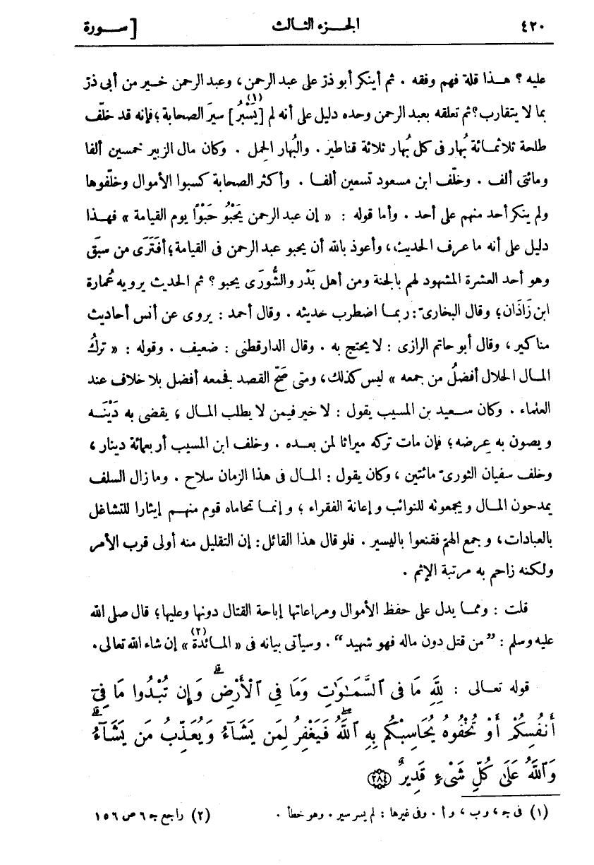 عَلَيْهِ؟ هَذَا قِلَّةُ فَهْمٍ وَفِقْهٍ. ثُمَّ أَيُنْكِرُ أَبُو ذَرٍّ عَلَى عَبْدِ الرَّحْمَنِ، وَعَبْدُ الرَّحْمَنِ خَيْرٌ مِنْ أَبِي ذَرٍّ بِمَا لَا يَتَقَارَبُ؟ ثُمَّ تَعَلُّقُهُ بِعَبْدِ الرَّحْمَنِ وَحْدَهُ دَلِيلٌ عَلَى أَنَّهُ لَمْ [يَسْبُرْ «١»] سَيْرَ الصَّحَابَةِ، فَإِنَّهُ قَدْ خَلَّفَ طَلْحَةُ ثَلَاثَمِائَةِ بُهَارٍ فِي كُلِّ بُهَارٍ ثَلَاثَةُ قَنَاطِيرَ. وَالْبُهَارُ الْحِمْلُ. وَكَانَ مَالُ الزُّبَيْرِ خَمْسِينَ أَلْفًا وَمِائَتَيْ أَلْفٍ. وَخَلَّفَ ابْنُ مَسْعُودٍ تِسْعِينَ أَلْفًا. وَأَكْثَرُ الصَّحَابَةِ كَسَبُوا الْأَمْوَالَ وَخَلَّفُوهَا وَلَمْ يُنْكِرْ أَحَدٌ مِنْهُمْ عَلَى أَحَدٍ. وَأَمَّا قَوْلُهُ:" إِنَّ عَبْدَ الرَّحْمَنِ يَحْبُو حَبْوًا يَوْمَ الْقِيَامَةِ" فَهَذَا دَلِيلٌ عَلَى أَنَّهُ مَا عَرَفَ الْحَدِيثَ، وَأَعُوذُ بِاللَّهِ أَنْ يَحْبُوَ عَبْدُ الرَّحْمَنِ فِي الْقِيَامَةِ، أَفَتَرَى مِنْ سَبَقٍ وَهُوَ أَحَدُ الْعَشَرَةِ الْمَشْهُودُ لَهُمْ بِالْجَنَّةِ وَمِنْ أَهْلِ بَدْرٍ والشورى يحبو؟ ثم الحديث يرويه عمارة ابن زَاذَانَ، وَقَالَ الْبُخَارِيُّ: رُبَّمَا اضْطَرَبَ حَدِيثُهُ. وَقَالَ أَحْمَدُ: يَرْوِي عَنْ أَنَسٍ أَحَادِيثَ مَنَاكِيرَ، وَقَالَ أَبُو حَاتِمٍ الرَّازِيُّ: لَا يُحْتَجُّ بِهِ. وَقَالَ الدَّارَقُطْنِيُّ: ضَعِيفٌ. وَقَوْلُهُ:" تَرْكُ الْمَالِ الْحَلَالِ أَفْضَلُ مِنْ جَمْعِهِ" لَيْسَ كَذَلِكَ، وَمَتَى صَحَّ الْقَصْدُ فَجَمْعُهُ أَفْضَلُ بِلَا خِلَافٍ عِنْدِ الْعُلَمَاءِ. وَكَانَ سَعِيدُ بْنُ الْمُسَيَّبِ يَقُولُ: لَا خَيْرَ فِيمَنْ لَا يَطْلُبُ الْمَالَ، يَقْضِيَ بِهِ دَيْنَهُ وَيَصُونُ بِهِ عِرْضَهُ، فَإِنْ مَاتَ تَرَكَهُ مِيرَاثًا لِمَنْ بَعْدَهُ. وَخَلَّفَ ابْنُ الْمُسَيَّبِ أَرْبَعَمِائَةِ دِينَارٍ، وَخَلَّفَ سُفْيَانُ الثَّوْرِيُّ مِائَتَيْنِ، وَكَانَ يَقُولُ: الْمَالُ فِي هَذَا الزَّمَانِ سِلَاحٌ. وَمَا زَالَ السَّلَفُ يَمْدَحُونَ الْمَالَ وَيَجْمَعُونَهُ لِلنَّوَائِبِ وَإِعَانَةِ الْفُقَرَاءِ، وَإِنَّمَا تَحَامَاهُ قَوْمٌ مِنْهُمْ إِيثَارًا لِلتَّشَاغُلِ بِالْعِبَادَاتِ، وَجَمْعِ الْهَمِّ فَقَنَعُوا بِالْيَسِيرِ. فَلَوْ قَالَ هَذَا الْقَائِلُ: إِنَّ التَّقْلِيلَ مِنْهُ أَوْلَى قَرُبَ الْأَمْرُ وَلَكِنَّهُ زَاحَمَ بِهِ مَرْتَبَةَ الْإِثْمِ. قُلْتُ: وَمِمَّا يَدُلُّ عَلَى حِفْظِ الْأَمْوَالِ وَمُرَاعَاتِهَا إِبَاحَةُ الْقِتَالِ دُونَهَا وَعَلَيْهَا، قَالَ صَلَّى اللَّهُ عَلَيْهِ وَسَلَّمَ:" مَنْ قُتِلَ دُونَ مَالِهِ فَهُوَ شَهِيدٌ". وَسَيَأْتِي بَيَانُهُ فِي" الْمَائِدَةِ «٢» " إِنْ شَاءَ اللَّهُ تعالى.