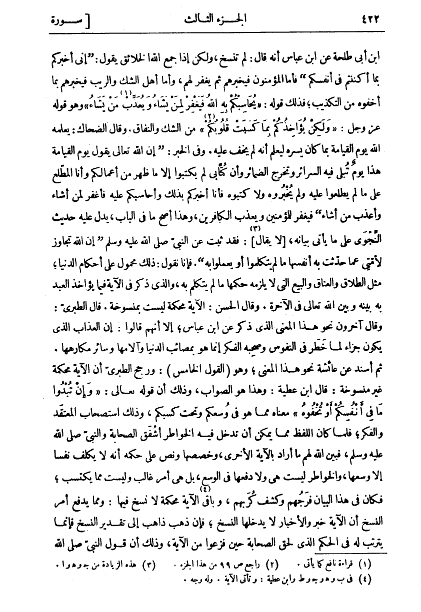 بْنِ أَبِي طَلْحَةَ عَنِ ابْنِ عَبَّاسٍ أَنَّهُ قَالَ: لَمْ تُنْسَخْ، وَلَكِنْ إِذَا جَمَعَ اللَّهُ الْخَلَائِقَ يَقُولُ:" إِنِّي أُخْبِرُكُمْ بِمَا أَكْنَنْتُمْ فِي أَنْفُسِكُمْ" فَأَمَّا الْمُؤْمِنُونَ فَيُخْبِرُهُمْ ثُمَّ يَغْفِرُ لَهُمْ، وَأَمَّا أَهْلُ الشَّكِّ وَالرَّيْبِ فَيُخْبِرُهُمْ بِمَا أَخْفَوْهُ مِنَ التَّكْذِيبِ، فَذَلِكَ قَوْلُهُ:" يُحاسِبْكُمْ بِهِ اللَّهُ فَيَغْفِرُ لِمَنْ يَشاءُ وَيُعَذِّبُ «١» مَنْ يَشاءُ" وَهُوَ قَوْلُهُ عَزَّ وَجَلَّ:" وَلكِنْ يُؤاخِذُكُمْ بِما كَسَبَتْ قُلُوبُكُمْ «٢» " مِنَ الشَّكِّ وَالنِّفَاقِ. وَقَالَ الضَّحَّاكُ: يُعْلِمُهُ اللَّهُ يَوْمَ الْقِيَامَةِ بِمَا كَانَ يُسِرُّهُ لِيَعْلَمَ أَنَّهُ لَمْ يَخَفْ عَلَيْهِ. وَفِي الْخَبَرِ:" إِنَّ اللَّهَ تَعَالَى يَقُولُ يَوْمَ الْقِيَامَةِ هَذَا يَوْمٌ تُبْلَى فِيهِ السَّرَائِرُ وَتُخْرَجُ الضَّمَائِرُ وَأَنَّ كُتَّابِي لَمْ يَكْتُبُوا إِلَّا مَا ظَهَرَ مِنْ أَعْمَالِكُمْ وَأَنَا الْمُطَّلِعُ عَلَى مَا لَمْ يَطَّلِعُوا عَلَيْهِ وَلَمْ يُخْبَرُوهُ وَلَا كَتَبُوهُ فَأَنَا أُخْبِرُكُمْ بِذَلِكَ وَأُحَاسِبُكُمْ عَلَيْهِ فَأَغْفِرُ لِمَنْ أَشَاءُ وَأُعَذِّبُ مَنْ أَشَاءُ" فَيَغْفِرُ لِلْمُؤْمِنِينَ وَيُعَذِّبُ الْكَافِرِينَ، وَهَذَا أَصَحُّ مَا فِي الْبَابِ، يَدُلُّ عَلَيْهِ حَدِيثُ النَّجْوَى عَلَى مَا يَأْتِي بَيَانُهُ، [لَا يُقَالُ «٣»]: فَقَدْ ثَبَتَ عَنِ النَّبِيِّ صَلَّى اللَّهُ عَلَيْهِ وَسَلَّمَ" إِنَّ اللَّهَ تَجَاوَزَ لِأُمَّتِي عَمَّا حَدَّثَتْ بِهِ أَنْفُسَهَا مَا لَمْ يَتَكَلَّمُوا أَوْ يَعْمَلُوا بِهِ". فَإِنَّا نَقُولُ: ذَلِكَ مَحْمُولٌ عَلَى أَحْكَامِ الدُّنْيَا، مِثْلَ الطَّلَاقِ وَالْعَتَاقِ وَالْبَيْعِ الَّتِي لَا يَلْزَمُهُ حُكْمُهَا مَا لَمْ يَتَكَلَّمْ بِهِ، وَالَّذِي ذُكِرَ فِي الْآيَةِ فِيمَا يُؤَاخَذُ الْعَبْدُ بِهِ بَيْنَهُ وَبَيْنَ اللَّهِ تَعَالَى فِي الْآخِرَةِ. وَقَالَ الْحَسَنُ: الْآيَةُ مُحْكَمَةٌ لَيْسَتْ بِمَنْسُوخَةٍ. قَالَ الطَّبَرِيُّ: وَقَالَ آخَرُونَ نَحْوَ هَذَا الْمَعْنَى الَّذِي ذُكِرَ عَنِ ابْنِ عَبَّاسٍ، إِلَّا أَنَّهُمْ قَالُوا: إِنَّ الْعَذَابَ الَّذِي يَكُونُ جَزَاءً لِمَا خَطَرَ فِي النُّفُوسِ وَصَحِبَهُ الْفِكْرُ إِنَّمَا هُوَ بِمَصَائِبِ الدُّنْيَا وَآلَامِهَا وَسَائِرِ مَكَارِهِهَا. ثُمَّ أُسْنِدَ عَنْ عَائِشَةَ نَحْوُ هَذَا الْمَعْنَى، وَهُوَ (الْقَوْلُ الْخَامِسُ): وَرَجَّحَ الطَّبَرِيُّ أَنَّ الْآيَةَ مُحْكَمَةٌ غَيْرُ مَنْسُوخَةٍ: قَالَ ابْنُ عَطِيَّةَ: وَهَذَا هُوَ الصَّوَابُ، وَذَلِكَ أَنَّ قَوْلَهُ تَعَالَى:" وَإِنْ تُبْدُوا مَا فِي أَنْفُسِكُمْ أَوْ تُخْفُوهُ" مَعْنَاهُ مِمَّا هُوَ فِي وُسْعِكُمْ وَتَحْتَ كَسْبِكُمْ، وَذَلِكَ اسْتِصْحَابُ الْمُعْتَقَدِ وَالْفِكْرِ، فَلَمَّا كَانَ اللَّفْظُ مِمَّا يُمْكِنُ أَنْ تَدْخُلَ فِيهِ الْخَوَاطِرُ أَشْفَقَ الصَّحَابَةُ وَالنَّبِيُّ صَلَّى اللَّهُ عَلَيْهِ وَسَلَّمَ، فَبَيَّنَ اللَّهُ لَهُمْ مَا أَرَادَ بِالْآيَةِ الْأُخْرَى، وَخَصَّصَهَا وَنَصَّ عَلَى حُكْمِهِ أَنَّهُ لَا يُكَلِّفُ نَفْسًا إِلَّا وُسْعَهَا، وَالْخَوَاطِرُ لَيْسَتْ هِيَ وَلَا دَفْعُهَا فِي الْوُسْعِ، بَلْ هِيَ أَمْرٌ غَالِبٌ وَلَيْسَتْ مِمَّا يُكْتَسَبُ، فَكَانَ فِي هَذَا الْبَيَانِ فَرَجُهُمْ وَكَشْفُ كُرَبِهِمْ، وَبَاقِي «٤» الْآيَةِ مُحْكَمَةٌ لَا نَسْخَ فِيهَا: وَمِمَّا يَدْفَعُ أَمْرَ النَّسْخِ أَنَّ الْآيَةَ خَبَرٌ وَالْأَخْبَارُ لَا يَدْخُلُهَا النَّسْخُ، فَإِنْ ذَهَبَ ذَاهِبٌ إِلَى تَقْدِيرِ النَّسْخِ فَإِنَّمَا يَتَرَتَّبُ لَهُ فِي الْحُكْمِ الَّذِي لَحِقَ الصَّحَابَةَ حِينَ فَزِعُوا مِنَ الْآ