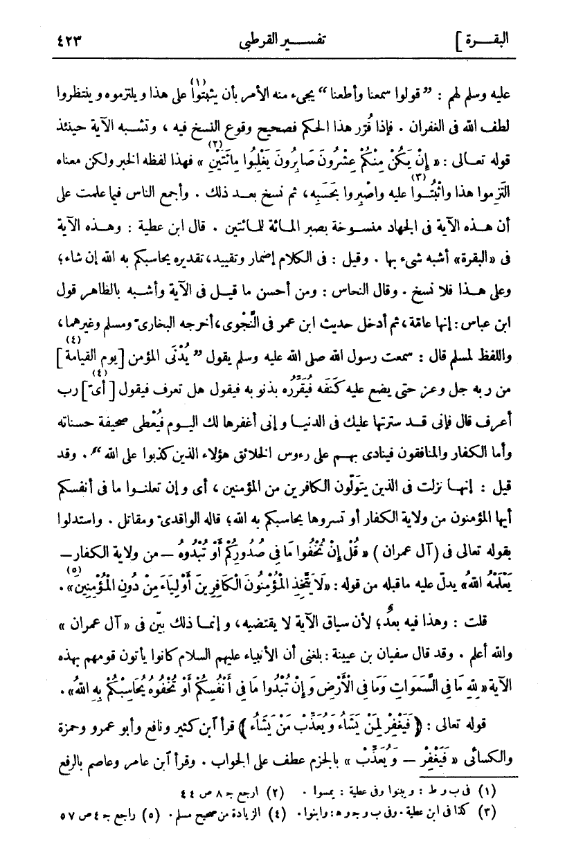عليه وسلم لهم:" قولوا سَمِعْنا وَأَطَعْنا" يجئ مِنْهُ الْأَمْرُ بِأَنْ يَثْبُتُوا «١» عَلَى هَذَا وَيَلْتَزِمُوهُ وَيَنْتَظِرُوا لُطْفَ اللَّهِ فِي الْغُفْرَانِ. فَإِذَا قُرِّرَ هَذَا الْحُكْمُ فَصَحِيحٌ وُقُوعُ النَّسْخِ فِيهِ، وَتُشْبِهُ الْآيَةُ حِينَئِذٍ قَوْلَهُ تَعَالَى:" إِنْ يَكُنْ مِنْكُمْ عِشْرُونَ صابِرُونَ يَغْلِبُوا مِائَتَيْنِ «٢» " فَهَذَا لَفْظُهُ الْخَبَرُ وَلَكِنْ مَعْنَاهُ الْتَزِمُوا هَذَا وَاثْبُتُوا «٣» عَلَيْهِ وَاصْبِرُوا بِحَسْبِهِ، ثُمَّ نُسِخَ بَعْدَ ذَلِكَ. وَأَجْمَعَ النَّاسُ فِيمَا عَلِمْتُ عَلَى أَنَّ هَذِهِ الْآيَةَ فِي الْجِهَادِ مَنْسُوخَةٌ بِصَبْرِ الْمِائَةِ لِلْمِائَتَيْنِ. قَالَ ابْنُ عطية: وهذه الآية في" البقرة" أشبه شي بِهَا. وَقِيلَ: فِي الْكَلَامِ إِضْمَارٌ وَتَقْيِيدٌ، تَقْدِيرُهُ يُحَاسِبْكُمْ بِهِ اللَّهُ إِنْ شَاءَ، وَعَلَى هَذَا فَلَا نَسْخَ. وَقَالَ النَّحَّاسُ: وَمِنْ أَحْسَنِ مَا قِيلَ فِي الْآيَةِ وَأَشْبَهُ بِالظَّاهِرِ قَوْلُ ابْنِ عَبَّاسٍ: إِنَّهَا عَامَّةٌ، ثُمَّ أُدْخِلَ حَدِيثُ ابْنِ عُمَرَ فِي النَّجْوَى، أَخْرَجَهُ الْبُخَارِيُّ وَمُسْلِمٌ وَغَيْرُهُمَا، وَاللَّفْظُ لِمُسْلِمٍ قَالَ: سَمِعْتُ رَسُولَ اللَّهِ صَلَّى اللَّهُ عَلَيْهِ وَسَلَّمَ يَقُولُ" يُدْنَى الْمُؤْمِنُ [يَوْمَ القيامة «٤»] من ربه عز وجل حَتَّى يَضَعَ عَلَيْهِ كَنَفَهُ فَيُقْرِرُهُ بِذُنُوبِهِ فَيَقُولُ هَلْ تَعْرِفُ فَيَقُولُ [أَيْ «٥»] رَبِّ أَعْرِفُ قَالَ فَإِنِّي قَدْ سَتَرْتُهَا عَلَيْكَ فِي الدُّنْيَا وَإِنِّي أَغْفِرُهَا لَكَ الْيَوْمَ فَيُعْطَى صَحِيفَةَ حَسَنَاتِهِ وَأَمَّا الْكُفَّارُ وَالْمُنَافِقُونَ فَيُنَادَى بِهِمْ عَلَى رُءُوسِ الْخَلَائِقِ هَؤُلَاءِ الَّذِينَ كَذَبُوا عَلَى اللَّهِ". وَقَدْ قِيلَ: إِنَّهَا نَزَلَتْ فِي الَّذِينَ يَتَوَلَّوْنَ الْكَافِرِينَ مِنَ الْمُؤْمِنِينَ، أَيْ وَإِنْ تُعْلِنُوا مَا فِي أَنْفُسِكُمْ أَيُّهَا الْمُؤْمِنُونَ مِنْ وِلَايَةِ الْكُفَّارِ أَوْ تُسِرُّوهَا يُحَاسِبْكُمْ بِهِ اللَّهُ، قَالَهُ الْوَاقِدِيُّ وَمُقَاتِلٌ. وَاسْتَدَلُّوا بِقَوْلِهِ تَعَالَى فِي (آلِ عِمْرَانَ) " قُلْ إِنْ تُخْفُوا مَا فِي صُدُورِكُمْ أَوْ تُبْدُوهُ