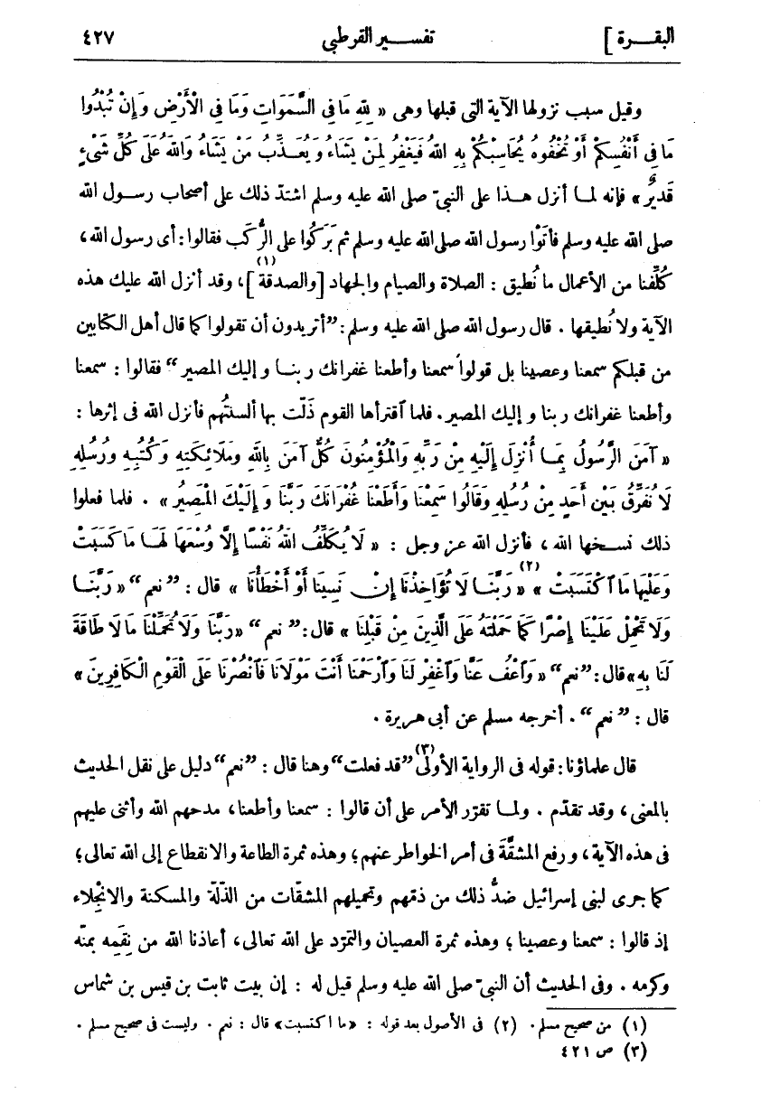 وَقِيلَ سَبَبُ نُزُولِهَا الْآيَةُ الَّتِي قَبْلَهَا وَهِيَ:" لِلَّهِ مَا فِي السَّماواتِ وَما فِي الْأَرْضِ وَإِنْ تُبْدُوا مَا فِي أَنْفُسِكُمْ أَوْ تُخْفُوهُ يُحاسِبْكُمْ بِهِ اللَّهُ فَيَغْفِرُ لِمَنْ يَشاءُ وَيُعَذِّبُ مَنْ يَشاءُ وَاللَّهُ عَلى كُلِّ شَيْءٍ قَدِيرٌ" فَإِنَّهُ لَمَّا أُنْزِلَ هَذَا عَلَى النَّبِيِّ صَلَّى اللَّهُ عَلَيْهِ وَسَلَّمَ اشْتَدَّ ذَلِكَ عَلَى أَصْحَابِ رَسُولِ اللَّهِ صَلَّى اللَّهُ عَلَيْهِ وَسَلَّمَ فَأَتَوْا رَسُولِ اللَّهِ صَلَّى اللَّهُ عَلَيْهِ وَسَلَّمَ ثُمَّ بَرَكُوا عَلَى الرُّكَبِ فَقَالُوا: أَيْ رَسُولَ اللَّهِ، كُلِّفْنَا مِنَ. الْأَعْمَالِ مَا نُطِيقُ: الصَّلَاةُ وَالصِّيَامُ والجهاد [والصدقة «١»]، وقد أنزل الله عليك هَذِهِ الْآيَةَ وَلَا نُطِيقُهَا. قَالَ رَسُولُ اللَّهِ صَلَّى اللَّهُ عَلَيْهِ وَسَلَّمَ:" أَتُرِيدُونَ أَنْ تَقُولُوا كَمَا قَالَ أَهْلُ الْكِتَابَيْنِ مِنْ قَبْلِكُمْ سَمِعْنا وَعَصَيْنا بَلْ قُولُوا سَمِعْنا وَأَطَعْنا غُفْرانَكَ رَبَّنا وَإِلَيْكَ الْمَصِيرُ" فَقَالُوا: سَمِعْنا وَأَطَعْنا غُفْرانَكَ رَبَّنا وَإِلَيْكَ الْمَصِيرُ. فَلَمَّا اقْتَرَأَهَا الْقَوْمُ ذَلَّتْ بِهَا أَلْسِنَتُهُمْ فَأَنْزَلَ اللَّهُ فِي إِثْرِهَا:" آمَنَ الرَّسُولُ بِما أُنْزِلَ إِلَيْهِ مِنْ رَبِّهِ وَالْمُؤْمِنُونَ كُلٌّ آمَنَ بِاللَّهِ وَمَلائِكَتِهِ وَكُتُبِهِ وَرُسُلِهِ لَا نُفَرِّقُ بَيْنَ أَحَدٍ مِنْ رُسُلِهِ وَقالُوا سَمِعْنا وَأَطَعْنا غُفْرانَكَ رَبَّنا وَإِلَيْكَ الْمَصِيرُ". فَلَمَّا فَعَلُوا ذَلِكَ نَسَخَهَا اللَّهُ، فَأَنْزَلَ اللَّهُ عَزَّ وَجَلَّ:" لَا يُكَلِّفُ اللَّهُ نَفْساً إِلَّا وُسْعَها لَها مَا كَسَبَتْ وَعَلَيْها مَا اكْتَسَبَتْ" «٢» " رَبَّنا لَا تُؤاخِذْنا إِنْ نَسِينا أَوْ أَخْطَأْنا" قَالَ:" نَعَمْ"" رَبَّنا وَلا تَحْمِلْ عَلَيْنا إِصْراً كَما حَمَلْتَهُ عَلَى الَّذِينَ مِنْ قَبْلِنا" قَالَ:" نَعَمْ"" رَبَّنا وَلا تُحَمِّلْنا مَا لَا طاقَةَ لَنا بِهِ" قَالَ:" نَعَمْ"" وَاعْفُ عَنَّا وَاغْفِرْ لَنا وَارْحَمْنا أَنْتَ مَوْلانا فَانْصُرْنا عَلَى الْقَوْمِ الْكافِرِينَ" قَالَ:" نَعَمْ". أَخْرَجَهُ مُسْلِمٌ عَنْ أَبِي هُرَيْرَةَ. قَالَ عُلَمَاؤُنَا: قَوْلُهُ فِي الرِّوَايَةِ الْأُولَى «٣» " قَدْ فَعَلْتُ" وَهُنَا قَالَ:" نَعَمْ" دَلِيلٌ عَلَى نَقْلِ الْحَدِيثِ بِالْمَعْنَى، وَقَدْ تَقَدَّمَ. وَلَمَّا تَقَرَّرَ الْأَمْرُ عَلَى أَنْ قَالُوا: سَمِعْنَا وَأَطَعْنَا، مَدَحَهُمُ اللَّهُ وَأَثْنَى عَلَيْهِمْ فِي هَذِهِ الْآيَةِ، وَرَفَعَ الْمَشَقَّةَ فِي أَمْرِ الْخَوَاطِرِ عَنْهُمْ، وَهَذِهِ ثَمَرَةُ الطَّاعَةِ وَالِانْقِطَاعِ إِلَى اللَّهِ تَعَالَى، كَمَا جَرَى لِبَنِي إِسْرَائِيلَ ضِدُّ ذَلِكَ مِنْ ذَمِّهِمْ وَتَحْمِيلِهِمُ الْمَشَقَّاتِ مِنَ الذِّلَّةِ وَالْمَسْكَنَةِ وَالِانْجِلَاءِ إِذْ قَالُوا: سَمِعْنَا وَعَصَيْنَا، وَهَذِهِ ثَمَرَةُ الْعِصْيَانِ وَالتَّمَرُّدِ عَلَى اللَّهِ تَعَالَى، أَعَاذَنَا اللَّهُ مِنْ نِقَمِهِ بِمَنِّهِ وَكَرَمِهِ. وَفِي الْحَدِيثِ أَنَّ النَّبِيَّ صَلَّى اللَّهُ عَلَيْهِ وَسَلَّمَ قِيلَ لَهُ: إِنَّ بَيْتَ ثَابِتِ بْنِ قَيْسِ بْنِ شماس