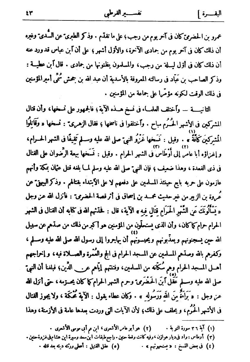 عَمْرِو بْنِ الْحَضْرَمِيِّ كَانَ فِي آخِرِ يَوْمٍ مِنْ رَجَبٍ، عَلَى مَا تَقَدَّمَ. وَذَكَرَ الطَّبَرِيُّ عَنِ السُّدِّيِّ وَغَيْرِهِ أَنَّ ذَلِكَ كَانَ فِي آخِرِ يَوْمٍ مِنْ جُمَادَى الْآخِرَةِ، وَالْأَوَّلُ أَشْهَرُ، عَلَى أَنَّ ابْنَ عَبَّاسٍ قَدْ وَرَدَ عَنْهُ أَنَّ ذَلِكَ كَانَ فِي أَوَّلِ لَيْلَةٍ مِنْ رَجَبٍ، وَالْمُسْلِمُونَ يَظُنُّونَهَا مِنْ جُمَادَى. قَالَ ابْنُ عَطِيَّةَ: وَذَكَرَ الصَّاحِبُ بْنُ عَبَّادٍ فِي رِسَالَتِهِ الْمَعْرُوفَةِ بِالْأَسَدِيَّةِ أَنَّ عَبْدَ اللَّهِ بْنَ جَحْشٍ سُمِّيَ أَمِيرَ الْمُؤْمِنِينَ فِي ذَلِكَ الْوَقْتِ لِكَوْنِهِ مُؤَمَّرًا عَلَى جَمَاعَةٍ مِنَ الْمُؤْمِنِينَ. الثَّانِيَةُ- وَاخْتَلَفَ الْعُلَمَاءُ فِي نَسْخِ هَذِهِ الْآيَةِ، فَالْجُمْهُورُ عَلَى نَسْخِهَا، وَأَنَّ قِتَالَ الْمُشْرِكِينَ فِي الْأَشْهُرِ الْحُرُمِ مُبَاحٌ. وَاخْتَلَفُوا فِي نَاسِخِهَا، فَقَالَ الزُّهْرِيُّ: نَسَخَهَا" وَقاتِلُوا الْمُشْرِكِينَ كَافَّةً «١» ". وَقِيلَ: نَسَخَهَا غَزْوُ النَّبِيِّ صَلَّى اللَّهُ عَلَيْهِ وَسَلَّمَ ثَقِيفًا فِي الشَّهْرِ الْحَرَامِ، وَإِغْزَاؤُهُ أَبَا عَامِرٍ «٢» إِلَى أَوْطَاسٍ «٣» فِي الشَّهْرِ الْحَرَامِ. وَقِيلَ: نَسَخَهَا بَيْعَةُ الرِّضْوَانِ عَلَى الْقِتَالِ فِي ذِي الْقَعْدَةِ، وَهَذَا ضَعِيفٌ، فَإِنَّ النَّبِيَّ صَلَّى اللَّهُ عَلَيْهِ وَسَلَّمَ لَمَّا بَلَغَهُ قَتْلُ عُثْمَانَ بِمَكَّةَ وَأَنَّهُمْ عَازِمُونَ عَلَى حَرْبِهِ بَايَعَ حِينَئِذٍ الْمُسْلِمِينَ عَلَى دَفْعِهِمْ لَا عَلَى الِابْتِدَاءِ بِقِتَالِهِمْ. وَذَكَرَ الْبَيْهَقِيُّ عَنْ عُرْوَةَ بْنِ الزُّبَيْرِ مِنْ غَيْرِ حَدِيثِ مُحَمَّدِ بْنِ إِسْحَاقَ في أثر قصة الحضرمي: فأنزل عز وجل" يَسْئَلُونَكَ عَنِ الشَّهْرِ الْحَرامِ قِتالٍ فِيهِ" الْآيَةَ، قَالَ: فَحَدَّثَهُمُ اللَّهُ فِي كِتَابِهِ أَنَّ الْقِتَالَ فِي الشَّهْرِ الْحَرَامِ حَرَامٌ كَمَا كَانَ، وَأَنَّ الَّذِي يَسْتَحِلُّونَ مِنَ الْمُؤْمِنِينَ هُوَ أَكْبَرُ مِنْ ذَلِكَ مِنْ صَدِّهِمْ عَنْ سَبِيلِ اللَّهِ حِينَ يَسْجُنُونَهُمْ وَيُعَذِّبُونَهُمْ وَيَحْبِسُونَهُمْ «٤» أَنْ يُهَاجِرُوا إِلَى رَسُولِ اللَّهِ صَلَّى اللَّهُ عَلَيْهِ وَسَلَّمَ، وَكُفْرِهِمْ بِاللَّهِ وَصَدِّهِمُ الْمُسْلِمِينَ عَنِ الْمَسْجِدِ الْحَرَامِ فِي الْحَجِّ وَالْعُمْرَةِ وَالصَّلَاةِ فِيهِ، وَإِخْرَاجِهِمْ أَهْلَ الْمَسْجِدِ الْحَرَامِ وَهُمْ سُكَّانُهُ مِنَ الْمُسْلِمِينَ، وَفِتْنَتِهِمْ إِيَّاهُمْ عَنِ الدِّينِ، فَبَلَغَنَا أَنَّ النَّبِيَّ صَلَّى اللَّهُ عَلَيْهِ وَسَلَّمَ عَقَلَ «٥» ابْنَ الْحَضْرَمِيِّ وَحَرَّمَ الشَّهْرَ الْحَرَامَ كَمَا كَانَ يُحَرِّمُهُ، حَتَّى أَنْزَلَ اللَّهُ عَزَّ وَجَلَّ:" بَراءَةٌ مِنَ اللَّهِ وَرَسُولِهِ". وَكَانَ عَطَاءٌ يَقُولُ: الْآيَةُ مُحْكَمَةٌ، وَلَا يَجُوزُ الْقِتَالُ فِي الْأَشْهُرِ الْحُرُمِ، وَيَحْلِفُ عَلَى ذَلِكَ، لِأَنَّ الْآيَاتِ الَّتِي وردت بعدها عامة في الأزمنة، وهذا