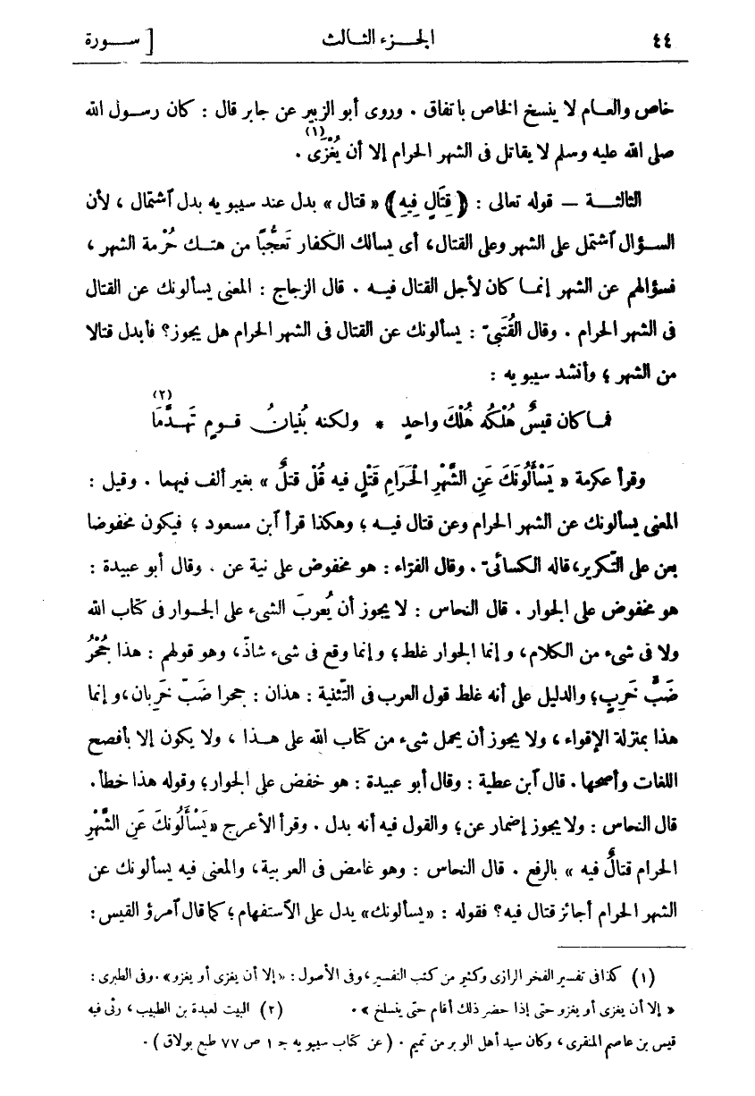 خَاصٌّ وَالْعَامُّ لَا يَنْسَخُ الْخَاصَّ بِاتِّفَاقٍ. وَرَوَى أَبُو الزُّبَيْرِ عَنْ جَابِرٍ قَالَ: كَانَ رَسُولُ اللَّهِ صَلَّى اللَّهُ عَلَيْهِ وَسَلَّمَ لَا يُقَاتِلُ فِي الشَّهْرِ الْحَرَامِ إِلَّا أَنْ يُغْزَى «١». الثَّالِثَةُ- قَوْلُهُ تَعَالَى: (قِتالٍ فِيهِ) " قِتَالٍ" بَدَلٌ عِنْدَ سِيبَوَيْهِ بَدَلُ اشْتِمَالٍ، لِأَنَّ السُّؤَالَ اشْتَمَلَ عَلَى الشَّهْرِ وَعَلَى الْقِتَالِ، أَيْ يَسْأَلُكَ الْكُفَّارُ تَعَجُّبًا مِنْ هَتْكِ حُرْمَةِ الشَّهْرِ، فَسُؤَالَهُمْ عَنِ الشَّهْرِ إِنَّمَا كَانَ لِأَجْلِ الْقِتَالِ فِيهِ. قَالَ الزَّجَّاجُ: الْمَعْنَى يَسْأَلُونَكَ عَنِ الْقِتَالِ فِي الشَّهْرِ الْحَرَامِ. وَقَالَ الْقُتَبِيُّ: يَسْأَلُونَكَ عَنِ الْقِتَالِ فِي الشَّهْرِ الْحَرَامِ هَلْ يَجُوزُ؟ فَأَبْدَلَ قِتَالًا مِنَ الشَّهْرِ، وأنشد سيبويه: