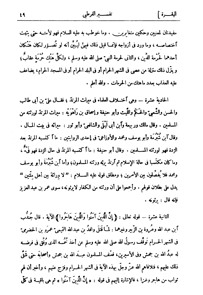 مُفِيدَتَانِ لِمَعْنَيَيْنِ وَحُكْمَيْنِ مُتَغَايِرَيْنِ. وَمَا خُوطِبَ بِهِ عَلَيْهِ السَّلَامُ فَهُوَ لِأُمَّتِهِ حَتَّى يَثْبُتَ اخْتِصَاصُهُ، وَمَا وَرَدَ فِي أَزْوَاجِهِ فَإِنَّمَا قِيلَ ذَلِكَ فِيهِنَّ لِيُبَيِّنَ أَنَّهُ لَوْ تُصُوِّرَ لَكَانَ هَتْكَانِ أَحَدُهُمَا لِحُرْمَةِ الدِّينِ، وَالثَّانِي لِحُرْمَةِ النَّبِيِّ صَلَّى اللَّهُ عَلَيْهِ وَسَلَّمَ، وَلِكُلِّ هَتْكِ حُرْمَةٍ عِقَابٌ، وَيَنْزِلُ ذَلِكَ مَنْزِلَةَ مَنْ عَصَى فِي الشَّهْرِ الْحَرَامِ أَوْ فِي الْبَلَدِ الْحَرَامِ أَوْ فِي الْمَسْجِدِ الْحَرَامِ، يُضَاعَفُ عَلَيْهِ الْعَذَابُ بِعَدَدِ مَا هَتَكَ مِنَ الْحُرُمَاتِ. وَاللَّهُ أَعْلَمُ. الْحَادِيَةَ عَشْرَةَ- وَهِيَ اخْتِلَافُ الْعُلَمَاءِ فِي مِيرَاثِ الْمُرْتَدِّ، فَقَالَ عَلَيُّ بْنُ أَبِي طَالِبٍ وَالْحَسَنُ وَالشَّعْبِيُّ وَالْحَكَمُ وَاللَّيْثُ وَأَبُو حَنِيفَةَ وَإِسْحَاقُ بْنُ رَاهَوَيْهِ: مِيرَاثُ الْمُرْتَدِّ لِوَرَثَتِهِ مِنَ الْمُسْلِمِينَ. وَقَالَ مَالِكٌ وَرَبِيعَةُ وَابْنُ أَبِي لَيْلَى وَالشَّافِعِيُّ وَأَبُو ثَوْرٍ: مِيرَاثُهُ فِي بَيْتِ الْمَالِ. وَقَالَ ابْنُ شُبْرُمَةَ وَأَبُو يُوسُفَ وَمُحَمَّدٌ وَالْأَوْزَاعِيُّ فِي إِحْدَى الرِّوَايَتَيْنِ: مَا اكْتَسَبَهُ الْمُرْتَدُّ بَعْدَ الرِّدَّةِ فَهُوَ لِوَرَثَتِهِ الْمُسْلِمِينَ. وَقَالَ أَبُو حَنِيفَةَ: مَا اكْتَسَبَهُ الْمُرْتَدُّ فِي حال الردة فهو في، وَمَا كَانَ مُكْتَسَبًا فِي حَالَةِ الْإِسْلَامِ ثُمَّ ارْتَدَّ يَرِثُهُ وَرَثَتُهُ الْمُسْلِمُونَ، وَأَمَّا ابْنُ شُبْرُمَةَ وَأَبُو يُوسُفَ وَمُحَمَّدٌ فَلَا يَفْصِلُونَ بَيْنَ الْأَمْرَيْنِ، وَمُطْلَقُ قَوْلِهِ عَلَيْهِ السَّلَامُ:" لَا وِرَاثَةَ بَيْنَ أَهْلِ مِلَّتَيْنِ" يَدُلُّ عَلَى بُطْلَانِ قَوْلِهِمْ. وَأَجْمَعُوا عَلَى أَنَّ وَرَثَتَهُ مِنَ الْكُفَّارِ لَا يَرِثُونَهُ، سِوَى عُمَرَ بْنِ عَبْدِ الْعَزِيزِ فَإِنَّهُ قَالَ: يَرِثُونَهُ. الثَّانِيَةَ عَشْرَةَ- قَوْلُهُ تَعَالَى: (إِنَّ الَّذِينَ آمَنُوا وَالَّذِينَ هاجَرُوا) الآية. قال جندب ابن عَبْدِ اللَّهِ وَعُرْوَةُ بْنُ الزُّبَيْرِ وَغَيْرُهُمَا: لَمَّا قَتَلَ وَاقِدُ بْنُ عَبْدِ اللَّهِ التَّمِيمِيُّ عَمْرَو بْنَ الْحَضْرَمِيِّ فِي الشَّهْرِ الْحَرَامِ تَوَقَّفَ رَسُولُ اللَّهِ صَلَّى اللَّهُ عَلَيْهِ وَسَلَّمَ عَنْ أَخْذِ خُمُسِهِ الَّذِي وُفِّقَ فِي فَرْضِهِ لَهُ عَبْدُ اللَّهِ بْنُ جَحْشٍ وَفِي الْأَسِيرَيْنِ، فَعَنَّفَ الْمُسْلِمُونَ عَبْدَ اللَّهِ بْنَ جَحْشٍ وَأَصْحَابَهُ حَتَّى شَقَّ ذَلِكَ عَلَيْهِمْ، فَتَلَافَاهُمُ اللَّهُ عَزَّ وَجَلَّ بِهَذِهِ الْآيَةِ فِي الشَّهْرِ الْحَرَامِ وَفَرَّجَ عَنْهُمْ، وَأَخْبَرَ أَنَّ لَهُمْ ثَوَابَ مَنْ هَاجَرَ وَغَزَا، فَالْإِشَارَةُ إِلَيْهِمْ فِي قَوْلِهِ:" إِنَّ الَّذِينَ آمَنُوا" ثُمَّ هِيَ بَاقِيَةٌ فِي كُلِّ