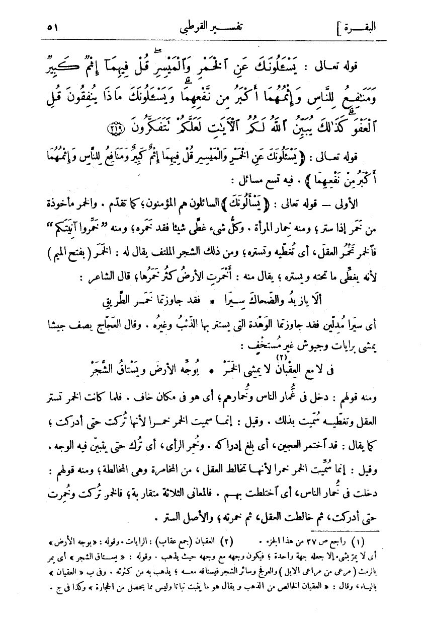 قوله تعالى: (يَسْئَلُونَكَ عَنِ الْخَمْرِ وَالْمَيْسِرِ قُلْ فِيهِما إِثْمٌ كَبِيرٌ وَمَنافِعُ لِلنَّاسِ وَإِثْمُهُما أَكْبَرُ مِنْ نَفْعِهِما). فِيهِ تسع مسائل: الاولى- قوله تعالى: (يَسْئَلُونَكَ) «١» السَّائِلُونَ هُمُ الْمُؤْمِنُونَ، كَمَا تَقَدَّمَ. وَالْخَمْرُ مَأْخُوذَةٌ مِنْ خَمَرَ إِذَا سَتَرَ، وَمِنْهُ خِمَارُ الْمَرْأَةِ. وكل شي غَطَّى شَيْئًا فَقَدْ خَمَرَهُ، وَمِنْهُ" خَمِّرُوا آنِيَتَكُمْ" فَالْخَمْرُ تَخْمُرُ الْعَقْلَ، أَيْ تُغَطِّيهِ وَتَسْتُرُهُ، وَمِنْ ذَلِكَ الشَّجَرُ الْمُلْتَفُّ يُقَالُ لَهُ: الْخَمَرُ (بِفَتْحِ الْمِيمِ) لِأَنَّهُ يُغَطِّي مَا تَحْتَهُ وَيَسْتُرُهُ، يُقَالُ مِنْهُ: أَخَمَرَتِ الْأَرْضُ كَثُرَ خَمَرُهَا، قَالَ الشَّاعِرُ: