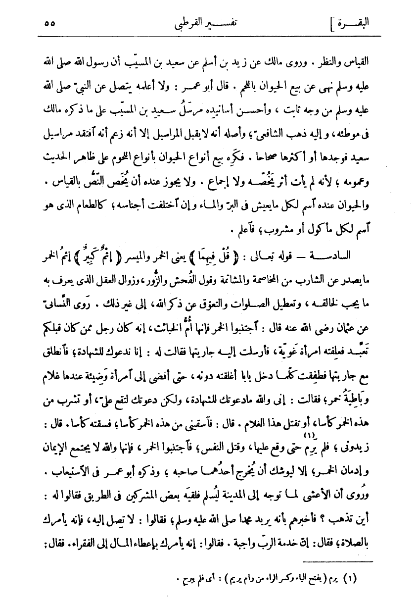 الْقِيَاسُ وَالنَّظَرُ. وَرَوَى مَالِكٌ عَنْ زَيْدِ بْنِ أَسْلَمَ عَنْ سَعِيدِ بْنِ الْمُسَيَّبِ أَنَّ رَسُولَ الله صَلَّى اللَّهُ عَلَيْهِ وَسَلَّمَ نهى عن بَيْعِ الْحَيَوَانِ بِاللَّحْمِ. قَالَ أَبُو عُمَرَ: وَلَا أَعْلَمُهُ يَتَّصِلُ عَنِ النَّبِيِّ صَلَّى اللَّهُ عَلَيْهِ وَسَلَّمَ مِنْ وَجْهٍ ثَابِتٍ، وَأَحْسَنُ أَسَانِيدِهِ مُرْسَلُ سَعِيدِ بْنِ الْمُسَيَّبِ عَلَى مَا ذَكَرَهُ مَالِكٌ فِي مُوَطَّئِهِ، وَإِلَيْهِ ذَهَبَ الشَّافِعِيُّ، وَأَصْلُهُ أَنَّهُ لَا يَقْبَلُ الْمَرَاسِيلَ إِلَّا أَنَّهُ زَعَمَ أَنَّهُ افْتَقَدَ مَرَاسِيلَ سَعِيدٍ فَوَجَدَهَا أَوْ أَكْثَرَهَا صِحَاحًا. فَكَرِهَ بَيْعَ أَنْوَاعِ الْحَيَوَانِ بِأَنْوَاعِ اللُّحُومِ عَلَى ظَاهِرِ الْحَدِيثِ وَعُمُومِهِ، لِأَنَّهُ لَمْ يَأْتِ أَثَرٌ يَخُصُّهُ وَلَا إِجْمَاعٌ. وَلَا يَجُوزُ عِنْدَهُ أَنْ يُخَصَّ النَّصُّ بِالْقِيَاسِ. وَالْحَيَوَانُ عِنْدَهُ اسْمٌ لِكُلِّ مَا يَعِيشُ فِي الْبَرِّ وَالْمَاءِ وَإِنِ اخْتَلَفَتْ أَجْنَاسُهُ، كَالطَّعَامِ الَّذِي هُوَ اسْمٌ لِكُلِّ مَأْكُولٍ أَوْ مَشْرُوبٍ، فَاعْلَمْ. السَّادِسَةُ- قَوْلُهُ تَعَالَى: (قُلْ فِيهِما) يَعْنِي الْخَمْرَ وَالْمَيْسِرَ (إِثْمٌ كَبِيرٌ) إِثْمُ الْخَمْرِ مَا يَصْدُرُ عَنِ الشَّارِبِ مِنَ الْمُخَاصَمَةِ وَالْمُشَاتَمَةِ وَقَوْلِ الْفُحْشِ وَالزُّورِ، وَزَوَالِ الْعَقْلِ الَّذِي يَعْرِفُ بِهِ مَا يَجِبُ لِخَالِقِهِ، وَتَعْطِيلِ الصَّلَوَاتِ وَالتَّعَوُّقِ عَنْ ذِكْرِ اللَّهِ، إِلَى غَيْرِ ذَلِكَ. رَوَى النَّسَائِيُّ عَنْ عُثْمَانَ رَضِيَ اللَّهُ عَنْهُ قَالَ: اجْتَنِبُوا الْخَمْرَ فَإِنَّهَا أُمُّ الْخَبَائِثِ، إِنَّهُ كَانَ رَجُلٌ مِمَّنْ كَانَ قَبْلَكُمْ تَعَبَّدَ فَعَلِقَتْهُ امْرَأَةٌ غَوِيَّةٌ، فَأَرْسَلَتْ إِلَيْهِ جَارِيَتَهَا فَقَالَتْ لَهُ: إِنَّا نَدْعُوكَ لِلشَّهَادَةِ، فَانْطَلَقَ مَعَ جَارِيَتِهَا فَطَفِقَتْ كُلَّمَا دَخَلَ بَابًا أَغْلَقَتْهُ دُونَهُ، حَتَّى أَفْضَى إِلَى امْرَأَةٍ وَضِيئَةٍ عِنْدَهَا غُلَامٌ وَبَاطِيَةُ خَمْرٍ، فَقَالَتْ: إِنِّي وَاللَّهِ مَا دَعَوْتُكَ لِلشَّهَادَةِ، وَلَكِنْ دَعَوْتُكَ لِتَقَعَ عَلَيَّ، أَوْ تَشْرَبَ مِنْ هَذِهِ الْخَمْرِ كَأْسًا، أَوْ تَقْتُلَ هَذَا الْغُلَامَ. قَالَ: فَاسْقِينِي مِنْ هَذِهِ الْخَمْرِ كَأْسًا، فَسَقَتْهُ كَأْسًا. قَالَ: زِيدُونِي، فَلَمْ يَرِمْ «١» حَتَّى وَقَعَ عَلَيْهَا، وَقَتَلَ النَّفْسَ، فَاجْتَنِبُوا الْخَمْرَ، فَإِنَّهَا وَاللَّهِ لَا يَجْتَمِعُ الْإِيمَانُ وَإِدْمَانُ الْخَمْرِ، إِلَّا لَيُوشِكُ أَنْ يُخْرِجَ أَحَدُهُمَا صَاحِبَهُ، وَذَكَرَهُ أَبُو عُمَرَ فِي الِاسْتِيعَابِ. وَرُوِيَ أَنَّ الْأَعْشَى لَمَّا تَوَجَّهَ إِلَى الْمَدِينَةِ لِيُسْلِمَ فَلَقِيَهُ بَعْضُ الْمُشْرِكِينَ فِي الطَّرِيقِ فَقَالُوا لَهُ: أَيْنَ تَذْهَبُ؟ فَأَخْبَرَهُمْ بِأَنَّهُ يُرِيدُ مُحَمَّدًا صَلَّى اللَّهُ عَلَيْهِ وَسَلَّمَ، فَقَالُوا: لَا تَصِلُ إِلَيْهِ، فَإِنَّهُ يَأْمُرُكَ بِالصَّلَاةِ، فَقَالَ: إِنَّ خِدْمَةَ الرَّبِّ وَاجِبَةٌ. فَقَالُوا: إِنَّهُ يَأْمُرُكَ بِإِعْطَاءِ المال إلى الفقراء. فقال: