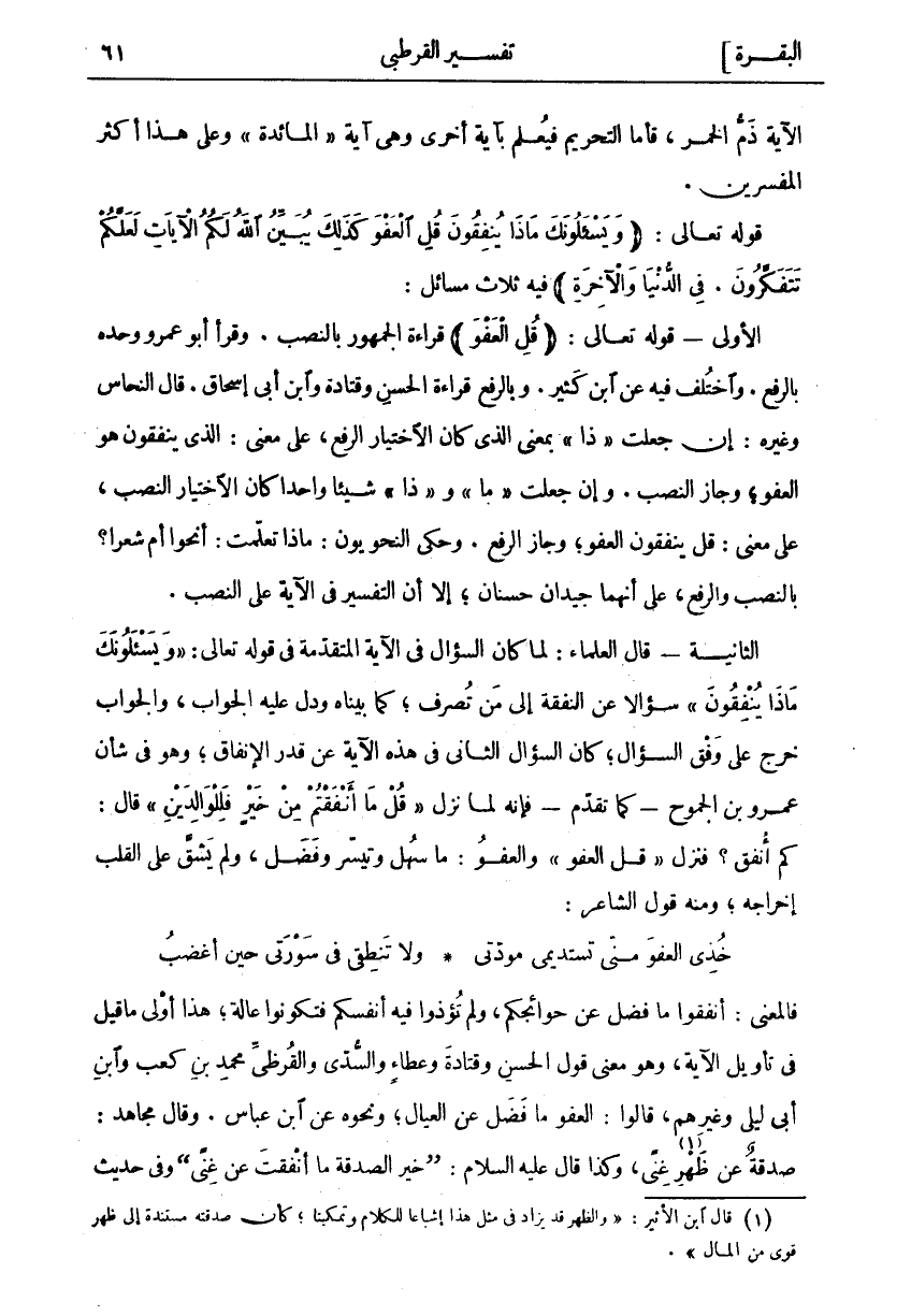الْآيَةِ ذَمُّ الْخَمْرِ، فَأَمَّا التَّحْرِيمُ فَيُعْلَمُ بِآيَةٍ أُخْرَى وَهِيَ آيَةُ" الْمَائِدَةِ" وَعَلَى هَذَا أَكْثَرُ المفسرين. قوله تعالى: (وَيَسْئَلُونَكَ مَاذَا يُنْفِقُونَ قُلِ الْعَفْوَ كَذلِكَ يُبَيِّنُ اللَّهُ لَكُمُ الْآياتِ لَعَلَّكُمْ تَتَفَكَّرُونَ. فِي الدُّنْيا وَالْآخِرَةِ) فِيهِ ثَلَاثُ مَسَائِلَ: الْأُولَى- قَوْلُهُ تَعَالَى: (قُلِ الْعَفْوَ) قِرَاءَةُ الْجُمْهُورِ بِالنَّصْبِ. وَقَرَأَ أَبُو عَمْرٍو وَحْدَهُ بِالرَّفْعِ. وَاخْتُلِفَ فِيهِ عَنِ ابْنِ كَثِيرٍ. وَبِالرَّفْعِ قِرَاءَةُ الْحَسَنِ وَقَتَادَةَ وَابْنِ أَبِي إِسْحَاقَ. قَالَ النَّحَّاسُ وَغَيْرُهُ: إِنْ جَعَلْتَ" ذَا" بِمَعْنَى الَّذِي كَانَ الِاخْتِيَارُ الرَّفْعَ، عَلَى مَعْنَى: الَّذِي يُنْفِقُونَ هُوَ الْعَفْوُ، وَجَازَ النَّصْبُ. وَإِنْ جَعَلْتَ" مَا" وَ" ذَا" شَيْئًا وَاحِدًا كَانَ الِاخْتِيَارُ النَّصْبَ، عَلَى مَعْنَى: قُلْ يُنْفِقُونَ الْعَفْوَ، وَجَازَ الرَّفْعُ. وَحَكَى النَّحْوِيُّونَ: مَاذَا تَعَلَّمْتَ: أَنَحْوًا أَمْ شِعْرًا؟ بِالنَّصْبِ وَالرَّفْعِ، عَلَى أَنَّهُمَا جَيِّدَانِ حَسَنَانِ، إِلَّا أَنَّ التَّفْسِيرَ فِي الْآيَةِ عَلَى النَّصْبِ. الثَّانِيَةُ- قَالَ الْعُلَمَاءُ: لَمَّا كَانَ السُّؤَالُ فِي الآية المتقدمة في قوله تعالى:" وَيَسْئَلُونَكَ مَاذَا يُنْفِقُونَ" سُؤَالًا عَنِ النَّفَقَةِ إِلَى مَنْ تُصْرَفُ، كَمَا بَيَّنَّاهُ وَدَلَّ عَلَيْهِ الْجَوَابُ، وَالْجَوَابُ خَرَجَ عَلَى وَفْقِ السُّؤَالِ، كَانَ السُّؤَالُ الثَّانِي فِي هَذِهِ الْآيَةِ عَنْ قَدْرِ الْإِنْفَاقِ، وَهُوَ فِي شَأْنِ عَمْرِو بْنِ الْجَمُوحِ- كَمَا تَقَدَّمَ- فَإِنَّهُ لَمَّا نَزَلَ" قُلْ مَا أَنْفَقْتُمْ مِنْ خَيْرٍ فَلِلْوالِدَيْنِ" قَالَ: كَمْ أُنْفِقُ؟ فَنَزَلَ" قُلِ الْعَفْوَ" وَالْعَفْوُ: مَا سَهُلَ وَتَيَسَّرَ وَفَضَلَ، وَلَمْ يَشُقَّ عَلَى الْقَلْبِ إِخْرَاجُهُ، وَمِنْهُ قَوْلُ الشَّاعِرِ: