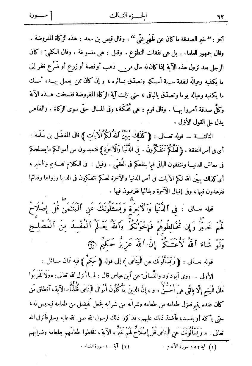 آخَرَ:" خَيْرُ الصَّدَقَةِ مَا كَانَ عَنْ ظَهْرِ غِنًى". وَقَالَ قَيْسُ بْنُ سَعْدٍ: هَذِهِ الزَّكَاةُ الْمَفْرُوضَةُ. وَقَالَ جُمْهُورُ الْعُلَمَاءِ: بَلْ هِيَ نَفَقَاتُ التَّطَوُّعِ. وَقِيلَ: هِيَ مَنْسُوخَةٌ. وَقَالَ الْكَلْبِيُّ: كَانَ الرَّجُلُ بَعْدَ نُزُولِ هَذِهِ الْآيَةِ إِذَا كَانَ لَهُ مَالٌ مِنْ ذَهَبٍ أَوْ فِضَّةٍ أَوْ زَرْعٍ أَوْ ضَرْعٍ نَظَرَ إِلَى مَا يَكْفِيهِ وَعِيَالَهُ لِنَفَقَةِ سَنَةٍ أَمْسَكَهُ وَتَصَدَّقَ بِسَائِرِهِ، وَإِنْ كَانَ مِمَّنْ يَعْمَلُ بِيَدِهِ أَمْسَكَ مَا يَكْفِيهِ وَعِيَالَهُ يَوْمًا وَتَصَدَّقَ بِالْبَاقِي، حَتَّى نَزَلَتْ آيَةُ الزَّكَاةِ الْمَفْرُوضَةِ فَنَسَخَتْ هَذِهِ الْآيَةَ وَكُلَّ صَدَقَةٍ أُمِرُوا بِهَا. وَقَالَ قَوْمٌ: هِيَ مُحْكَمَةٌ، وَفِي الْمَالِ حَقٌّ سِوَى الزَّكَاةِ. وَالظَّاهِرُ يَدُلُّ عَلَى الْقَوْلِ الْأَوَّلِ. الثَّالِثَةُ- قَوْلُهُ تَعَالَى: (كَذلِكَ يُبَيِّنُ اللَّهُ لَكُمُ الْآياتِ) قَالَ الْمُفَضَّلُ بْنُ سَلَمَةَ: أَيْ فِي أَمْرِ النَّفَقَةِ. (لَعَلَّكُمْ تَتَفَكَّرُونَ. فِي الدُّنْيا وَالْآخِرَةِ) فَتَحْبِسُونَ مِنْ أَمْوَالِكُمْ مَا يُصْلِحُكُمْ فِي مَعَاشِ الدُّنْيَا وَتُنْفِقُونَ الْبَاقِي فِيمَا يَنْفَعُكُمْ فِي الْعُقْبَى وَقِيلَ: فِي الْكَلَامِ تَقْدِيمٌ وَتَأْخِيرٌ، أَيْ كَذَلِكَ يُبَيِّنُ اللَّهُ لَكُمُ الْآيَاتِ فِي أَمْرِ الدُّنْيَا وَالْآخِرَةِ لَعَلَّكُمْ تَتَفَكَّرُونَ فِي الدُّنْيَا وَزَوَالِهَا وَفَنَائِهَا فَتَزْهَدُونَ فِيهَا، وَفِي إِقْبَالِ الْآخِرَةِ وبقائها فترغبون فيها.
