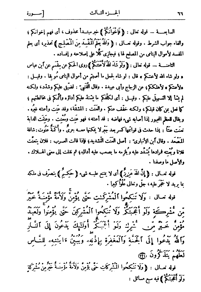 السابعة- قوله تعالى: (فَإِخْوانُكُمْ) خبر مبتدأ مَحْذُوفٍ، أَيْ فَهُمْ إِخْوَانُكُمْ، وَالْفَاءُ جَوَابُ الشَّرْطِ. وَقَوْلُهُ تَعَالَى: (وَاللَّهُ يَعْلَمُ الْمُفْسِدَ مِنَ الْمُصْلِحِ) تَحْذِيرٌ، أَيْ يَعْلَمُ الْمُفْسِدَ لِأَمْوَالِ الْيَتَامَى مِنَ الْمُصْلِحِ لَهَا، فَيُجَازِي كُلًّا عَلَى إِصْلَاحِهِ وَإِفْسَادِهِ. الثَّامِنَةُ- قَوْلُهُ تَعَالَى: (وَلَوْ شاءَ اللَّهُ لَأَعْنَتَكُمْ) رَوَى الْحَكَمُ عَنْ مِقْسَمٍ عَنِ ابْنِ عَبَّاسٍ" وَلَوْ شاءَ اللَّهُ لَأَعْنَتَكُمْ