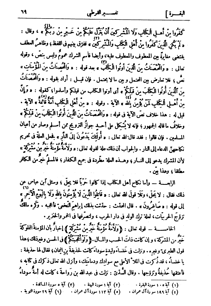 «١» "، وَقَالَ:" لَمْ يَكُنِ الَّذِينَ كَفَرُوا مِنْ أَهْلِ الْكِتابِ وَالْمُشْرِكِينَ «٢» " فَفَرَّقَ بَيْنَهُمْ فِي اللَّفْظِ، وَظَاهِرُ الْعَطْفِ يَقْتَضِي مُغَايَرَةً بَيْنَ الْمَعْطُوفِ وَالْمَعْطُوفِ عَلَيْهِ، وَأَيْضًا فَاسْمُ الشِّرْكِ عُمُومٌ وَلَيْسَ بِنَصٍّ، وَقَوْلُهُ تَعَالَى:" وَالْمُحْصَناتُ مِنَ الَّذِينَ أُوتُوا الْكِتابَ «٣» " بَعْدَ قَوْلِهِ:" وَالْمُحْصَناتُ مِنَ الْمُؤْمِناتِ" نَصٌّ، فَلَا تَعَارُضَ بَيْنَ الْمُحْتَمَلِ وَبَيْنَ مَا لَا يُحْتَمَلُ. فَإِنْ قِيلَ: أَرَادَ بِقَوْلِهِ:" وَالْمُحْصَناتُ مِنَ الَّذِينَ أُوتُوا الْكِتابَ مِنْ قَبْلِكُمْ" أَيْ أُوتُوا الْكِتَابَ مِنْ قَبْلِكُمْ وَأَسْلَمُوا، كَقَوْلِهِ:" وَإِنَّ مِنْ أَهْلِ الْكِتابِ لَمَنْ يُؤْمِنُ بِاللَّهِ «٤» " الْآيَةَ. وَقَوْلُهُ:" مِنْ أَهْلِ الْكِتابِ أُمَّةٌ قائِمَةٌ «٥» " الْآيَةَ. قِيلَ لَهُ: هَذَا خِلَافُ نَصِّ الْآيَةِ فِي قَوْلِهِ:" وَالْمُحْصَناتُ مِنَ الَّذِينَ أُوتُوا الْكِتابَ مِنْ قَبْلِكُمْ" وَخِلَافُ مَا قَالَهُ الْجُمْهُورُ، فَإِنَّهُ لَا يُشْكِلُ عَلَى أَحَدٍ جَوَازُ التَّزْوِيجِ مِمَّنْ أَسْلَمَ وَصَارَ مِنْ أَعْيَانِ الْمُسْلِمِينَ. فَإِنْ قَالُوا: فَقَدْ قَالَ اللَّهُ تَعَالَى:" أُولئِكَ يَدْعُونَ إِلَى النَّارِ" فَجَعَلَ الْعِلَّةَ فِي تَحْرِيمِ نِكَاحِهِنَّ الدُّعَاءَ إِلَى النَّارِ. وَالْجَوَابُ أَنَّ ذَلِكَ عِلَّةٌ لِقَوْلِهِ تَعَالَى:" وَلَأَمَةٌ مُؤْمِنَةٌ خَيْرٌ مِنْ مُشْرِكَةٍ" لِأَنَّ الْمُشْرِكَ يَدْعُو إِلَى النَّارِ، وَهَذِهِ الْعِلَّةُ مُطَّرِدَةٌ فِي جَمِيعِ الْكُفَّارِ، فَالْمُسْلِمُ خَيْرٌ مِنَ الْكَافِرِ مُطْلَقًا، وَهَذَا بَيِّنٌ. الرَّابِعَةُ- وَأَمَّا نِكَاحُ أَهْلِ الْكِتَابِ إِذَا كَانُوا حَرْبًا فَلَا يحل، وسيل ابْنُ عَبَّاسٍ عَنْ ذَلِكَ فَقَالَ: لَا يَحِلُّ، وَتَلَا قَوْلَ اللَّهِ تَعَالَى:" قاتِلُوا الَّذِينَ لَا يُؤْمِنُونَ بِاللَّهِ وَلا بِالْيَوْمِ الْآخِرِ «٦» " إِلَى قَوْلِهِ:" صاغِرُونَ". قَالَ الْمُحَدِّثُ: حَدَّثْتُ بِذَلِكَ إِبْرَاهِيمَ النَّخَعِيَّ فَأَعْجَبَهُ. وَكَرِهَ مَالِكٌ تَزَوُّجَ الْحَرْبِيَّاتِ، لِعِلَّةِ تَرْكِ الْوَلَدِ فِي دَارِ الْحَرْبِ، وَلِتَصَرُّفَهَا فِي الْخَمْرِ وَالْخِنْزِيرِ. الْخَامِسَةُ- قَوْلُهُ تَعَالَى: (وَلَأَمَةٌ مُؤْمِنَةٌ خَيْرٌ مِنْ مُشْرِكَةٍ) إِخْبَارٌ بِأَنَّ الْمُؤْمِنَةَ الْمَمْلُوكَةَ خَيْرٌ مِنَ الْمُشْرِكَةِ، وَإِنْ كَانَتْ ذَاتَ الْحَسَبِ وَالْمَالِ. (وَلَوْ أَعْجَبَتْكُمْ) فِي الْحُسْنِ وَغَيْرِ ذَلِكَ، هَذَا قَوْلُ الطَّبَرِيِّ وَغَيْرِهِ. وَنَزَلَتْ فِي خَنْسَاءَ وَلِيدَةٍ سَوْدَاءَ كَانَتْ لِحُذَيْفَةَ بْنَ الْيَمَانِ، فَقَالَ لَهَا حُذَيْفَةُ: يَا خَنْسَاءُ، قَدْ ذُكِرْتِ فِي الْمَلَإِ الْأَعْلَى مَعَ سَوَادِكِ وَدَمَامَتِكِ، وَأَنْزَلَ اللَّهُ