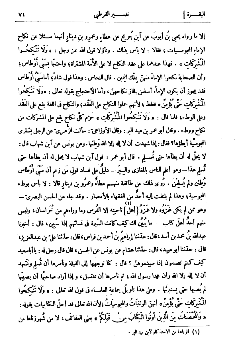 ". فَهَذَا عِنْدَهُمَا. عَلَى عَقْدِ النِّكَاحِ لَا عَلَى الْأَمَةِ الْمُشْتَرَاةِ، وَاحْتَجَّا بِسَبْيِ أَوْطَاسٍ، وَأَنَّ الصَّحَابَةَ نَكَحُوا الْإِمَاءَ مِنْهُنَّ بِمِلْكِ الْيَمِينِ. قَالَ النَّحَّاسُ: وَهَذَا قَوْلٌ شَاذٌّ، أَمَّا سَبْيٌ أَوْطَاسٍ فَقَدْ يَجُوزُ أَنْ يَكُونَ الْإِمَاءُ أَسْلَمْنَ فَجَازَ نِكَاحُهُنَّ، وَأَمَّا الِاحْتِجَاجُ بِقَوْلِهِ تَعَالَى:" وَلا تَنْكِحُوا الْمُشْرِكاتِ حَتَّى يُؤْمِنَّ" فَغَلَطٌ، لِأَنَّهُمْ حَمَلُوا النِّكَاحَ عَلَى الْعَقْدِ، وَالنِّكَاحُ فِي اللغة يقع على العقد وعلى الوطي، فَلَمَّا قَالَ:" وَلا تَنْكِحُوا الْمُشْرِكاتِ" حَرَّمَ كُلَّ نكاح يقع على المشركات من نكاح ووطئ. وَقَالَ أَبُو عُمَرَ بْنُ عَبْدِ الْبَرِّ: وَقَالَ الْأَوْزَاعِيُّ: سَأَلْتُ الزُّهْرِيَّ عَنِ الرَّجُلِ يَشْتَرِي الْمَجُوسِيَّةَ أَيَطَؤُهَا؟ فَقَالَ: إِذَا شَهِدَتْ أَنْ لَا إِلَهَ إِلَّا اللَّهُ وَطِئَهَا. وَعَنْ يُونُسَ عَنِ ابْنِ شِهَابٍ قَالَ: لَا يَحِلُّ لَهُ أَنْ يَطَأَهَا حَتَّى تُسْلِمَ. قَالَ أَبُو عُمَرَ: قَوْلُ ابْنِ شِهَابٍ لَا يَحِلُّ لَهُ أَنْ يَطَأَهَا حَتَّى تُسْلِمَ هَذَا- وَهُوَ أَعْلَمُ النَّاسِ بِالْمَغَازِي وَالسِّيَرِ- دَلِيلٌ عَلَى فَسَادِ قَوْلِ مَنْ زَعَمَ أَنَّ سبى أوطاس وطين وَلَمْ يُسْلِمْنَ. رُوِيَ ذَلِكَ عَنْ طَائِفَةٍ مِنْهُمْ عَطَاءٌ وَعَمْرُو بْنُ دِينَارٍ قَالَا: لَا بَأْسَ بوطي الْمَجُوسِيَّةِ، وَهَذَا لَمْ يَلْتَفِتْ إِلَيْهِ أَحَدٌ مِنَ الْفُقَهَاءِ بِالْأَمْصَارِ. وَقَدْ جَاءَ عَنِ الْحَسَنِ الْبَصْرِيِّ- وَهُوَ مِمَّنْ لَمْ يَكُنْ غَزْوُهُ وَلَا غَزْوُ [أَهْلِ «١»] نَاحِيَتِهِ إِلَّا الْفُرْسَ وَمَا وَرَاءَهُمْ مِنْ خُرَاسَانَ، وَلَيْسَ مِنْهُمْ أَحَدٌ أَهْلَ كِتَابٍ- مَا يُبَيِّنُ لَكَ كَيْفَ كَانَتِ السِّيرَةُ فِي نِسَائِهِمْ إِذَا سُبِينَ، قَالَ: أَخْبَرَنَا عَبْدُ اللَّهِ بْنُ مُحَمَّدِ بْنِ أَسَدٍ، قَالَ: حَدَّثَنَا إِبْرَاهِيمُ بْنُ أَحْمَدَ بْنِ فِرَاسٍ، قَالَ: حَدَّثَنَا عَلِيُّ بْنُ عَبْدِ الْعَزِيزِ، قَالَ: حَدَّثَنَا أَبُو عُبَيْدٍ، قَالَ: حَدَّثَنَا هِشَامٌ عَنْ يُونُسَ عَنِ الْحَسَنِ، قَالَ قَالَ رَجُلٌ لَهُ: يَا أَبَا سَعِيدٍ كَيْفَ كُنْتُمْ تَصْنَعُونَ إِذَا سَبَيْتُمُوهُنَّ؟ قَالَ: كُنَّا نُوَجِّهُهَا إِلَى الْقِبْلَةِ وَنَأْمُرُهَا أَنْ تُسْلِمَ وَتَشْهَدَ أَنْ لَا إِلَهَ إِلَّا اللَّهُ وَأَنَّ مُحَمَّدًا رَسُولُ اللَّهِ، ثُمَّ نَأْمُرُهَا أَنْ تَغْتَسِلَ، وَإِذَا أَرَادَ صَاحِبُهَا أَنْ يُصِيبَهَا لَمْ يُصِبْهَا حَتَّى يَسْتَبْرِئَهَا. وَعَلَى هَذَا تَأْوِيلُ جَمَاعَةِ الْعُلَمَاءِ فِي قَوْلِ اللَّهِ تَعَالَى:" وَلا تَنْكِحُوا الْمُشْرِكاتِ حَتَّى يُؤْمِنَّ". أَنَّهُنَّ الْوَثَنِيَّاتُ وَالْمَجُوسِيَّاتُ، لِأَنَّ اللَّهَ تَعَالَى قَدْ أَحَلَّ الْكِتَابِيَّاتِ بِقَوْلِهِ:" وَالْمُحْصَناتُ مِنَ الَّذِينَ أُوتُوا الْكِتابَ مِنْ قَبْلِكُمْ" يَعْنِي الْعَفَائِفَ، لَا مَنْ شهر زناها من