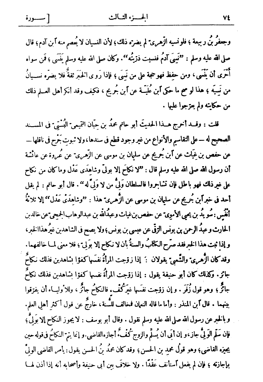 وَجَعْفَرُ بْنُ رَبِيعَةَ، فَلَوْ نَسِيَهُ الزُّهْرِيُّ لَمْ يَضُرَّهُ ذَلِكَ، لِأَنَّ النِّسْيَانَ لَا يُعْصَمُ مِنْهُ ابْنُ آدَمَ، قَالَ صَلَّى اللَّهُ عَلَيْهِ وَسَلَّمَ:" نَسِيَ آدَمُ فَنَسِيَتْ ذُرِّيَّتُهُ". وَكَانَ صَلَّى اللَّهُ عَلَيْهِ وَسَلَّمَ يَنْسَى، فَمَنْ سِوَاهُ أَحْرَى أَنْ يَنْسَى، وَمَنْ حَفِظَ فَهُوَ حُجَّةٌ عَلَى مَنْ نَسِيَ، فَإِذَا رَوَى الْخَبَرَ ثِقَةٌ فَلَا يَضُرُّهُ نِسْيَانُ مَنْ نَسِيَهُ، هَذَا لَوْ صَحَّ مَا حَكَى ابْنُ عُلَيَّةَ عَنِ ابْنِ جُرَيْجٍ، فَكَيْفَ وَقَدْ أَنْكَرَ أَهْلُ الْعِلْمِ ذَلِكَ مِنْ حِكَايَتِهِ وَلَمْ يُعَرِّجُوا عَلَيْهَا. قُلْتُ: وَقَدْ أَخْرَجَ هَذَا الْحَدِيثَ أَبُو حَاتِمٍ مُحَمَّدُ بْنُ حِبَّانَ التَّمِيمِيُّ الْبُسْتِيُّ فِي الْمُسْنَدِ الصَّحِيحِ لَهُ- عَلَى التَّقَاسِيمِ وَالْأَنْوَاعِ مِنْ غَيْرِ وُجُودِ قَطْعٍ فِي سَنَدِهَا، وَلَا ثُبُوتِ جَرْحٍ فِي نَاقِلِهَا- عَنْ حَفْصِ بْنِ غِيَاثٍ عَنِ ابْنِ جُرَيْجٍ عَنْ سُلَيْمَانَ بْنِ مُوسَى عَنِ الزُّهْرِيِّ عَنْ عُرْوَةَ عَنْ عَائِشَةَ أَنَّ رَسُولَ اللَّهِ صَلَّى اللَّهُ عَلَيْهِ وَسَلَّمَ قَالَ:" لَا نِكَاحَ إِلَّا بِوَلِيٍّ وَشَاهِدَيْ عَدْلٍ وَمَا كَانَ مِنْ نِكَاحٍ عَلَى غَيْرِ ذَلِكَ فَهُوَ بَاطِلٌ فَإِنْ تَشَاجَرُوا فَالسُّلْطَانُ وَلِيُّ مَنْ لَا وَلِيَّ لَهُ". قَالَ أَبُو حَاتِمٍ: لَمْ يَقُلْ أَحَدٌ فِي خَبَرِ ابْنِ جُرَيْجٍ عَنْ سُلَيْمَانَ بْنِ مُوسَى عَنِ الزُّهْرِيِّ هَذَا:" وَشَاهِدَيْ عَدْلٍ" إِلَّا ثَلَاثَةُ أَنْفُسٍ: سُوَيْدُ بْنُ يَحْيَى الْأُمَوِيُّ عَنْ حَفْصِ بْنِ غِيَاثٍ وَعَبْدُ اللَّهِ بْنُ عَبْدِ الْوَهَّابِ الْجُمَحِيُّ عَنْ خَالِدِ بْنِ الْحَارِثِ وَعَبْدُ الرَّحْمَنِ بْنُ يُونُسَ الرَّقِّيُّ عَنْ عِيسَى بْنِ يُونُسَ، وَلَا يَصِحُّ فِي الشَّاهِدَيْنِ غَيْرُ هَذَا الْخَبَرِ، وَإِذَا ثَبَتَ هَذَا الْخَبَرُ فَقَدْ صَرَّحَ الْكِتَابُ وَالسُّنَّةُ بِأَنْ لَا نِكَاحَ إِلَّا بِوَلِيٍّ، فَلَا مَعْنَى لِمَا خَالَفَهُمَا. وَقَدْ كَانَ الزُّهْرِيُّ وَالشَّعْبِيُّ يَقُولَانِ: إِذَا زَوَّجَتِ الْمَرْأَةُ نَفْسَهَا كُفُؤًا بِشَاهِدَيْنِ فَذَلِكَ نِكَاحٌ جَائِزٌ. وَكَذَلِكَ كَانَ أَبُو حَنِيفَةَ يَقُولُ: إِذَا زَوَّجَتِ الْمَرْأَةُ نَفْسَهَا كُفُؤًا بِشَاهِدَيْنِ فَذَلِكَ نِكَاحٌ جَائِزٌ، وَهُوَ قَوْلُ زُفَرَ. وَإِنْ زَوَّجَتْ نَفْسَهَا غَيْرَ كُفْءٍ فَالنِّكَاحُ جَائِزٌ، وَلِلْأَوْلِيَاءِ أَنْ يُفَرِّقُوا بَيْنَهُمَا. قَالَ ابْنُ الْمُنْذِرِ: وَأَمَّا مَا قَالَهُ النُّعْمَانُ فَمُخَالِفٌ لِلسُّنَّةِ، خَارِجٌ عَنْ قَوْلِ أَكْثَرِ أَهْلِ الْعِلْمِ. وَبِالْخَبَرِ عَنْ رَسُولِ اللَّهِ صَلَّى اللَّهُ عَلَيْهِ وَسَلَّمَ نَقُولُ. وَقَالَ أَبُو يُوسُفَ: لَا يَجُوزُ النِّكَاحُ إِلَّا بِوَلِيٍّ، فَإِنْ سَلَّمَ الْوَلِيُّ جَازَ، وَإِنْ أَبَى أَنْ يُسَلِّمَ وَالزَّوْجُ كُفْءٌ أَجَازَهُ الْقَاضِي. وَإِنَّمَا يَتِمُّ النِّكَاحُ فِي قَوْلِهِ حِينَ يُجِيزُهُ الْقَاضِي، وَهُوَ قَوْلُ مُحَمَّدِ بْنِ الْحَسَنِ، وَقَدْ كَانَ مُحَمَّدُ بْنُ الْحَسَنِ يَقُولُ: يَأْمُرُ الْقَاضِي الْوَلِيَّ بِإِجَازَتِهِ، فَإِنْ لَمْ يَفْعَلِ اسْتَأْنَفَ عَقْدًا. وَلَا خِلَافَ بَيْنَ أَبِي حَنِيفَةَ وَأَصْحَابِهِ أَنَّهُ إِذَا أَذِنَ لَهَا
