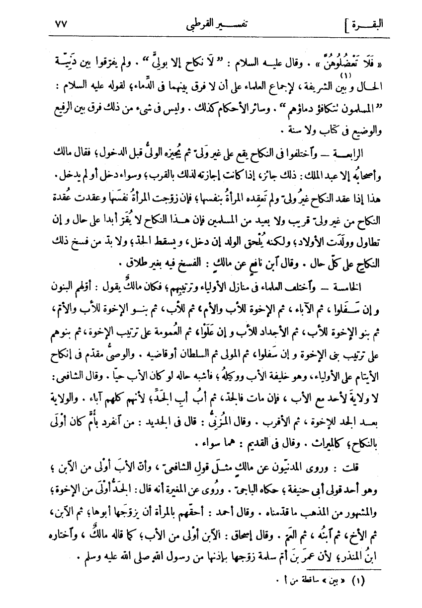 " فَلا تَعْضُلُوهُنَّ". وَقَالَ عَلَيْهِ السَّلَامُ:" لَا نِكَاحَ إِلَّا بِوَلِيٍّ". وَلَمْ يُفَرِّقُوا بَيْنَ دَنِيَّةِ الْحَالِ «١» وَبَيْنَ الشَّرِيفَةِ، لِإِجْمَاعِ الْعُلَمَاءِ عَلَى أَنْ لَا فرق بينهما في الدماء، لقوله عليه السلام:" المسلمون تتكافؤ دماؤهم". وسائر الأحكام كذلك. وليس في شي مِنْ ذَلِكَ فَرْقٌ بَيْنَ الرَّفِيعِ وَالْوَضِيعِ فِي كِتَابٍ وَلَا سُنَّةٍ. الرَّابِعَةُ- وَاخْتَلَفُوا فِي النِّكَاحِ يَقَعُ عَلَى غَيْرِ وَلِيٍّ ثُمَّ يُجِيزُهُ الْوَلِيُّ قَبْلَ الدُّخُولِ، فَقَالَ مَالِكٌ وَأَصْحَابُهُ إِلَّا عَبْدَ الْمَلِكِ: ذَلِكَ جَائِزٌ، إِذَا كَانَتْ إِجَازَتُهُ لِذَلِكَ بِالْقُرْبِ، وَسَوَاءٌ دَخَلَ أَوْ لَمْ يَدْخُلْ. هَذَا إِذَا عَقَدَ النِّكَاحَ غَيْرُ وَلِيٍّ وَلَمْ تَعْقِدْهُ الْمَرْأَةُ بِنَفْسِهَا، فَإِنْ زَوَّجَتِ الْمَرْأَةُ نَفْسَهَا وَعَقَدَتْ عُقْدَةَ النِّكَاحِ مِنْ غَيْرِ وَلِيٍّ قَرِيبٍ وَلَا بَعِيدٍ مِنَ الْمُسْلِمِينَ فَإِنَّ هَذَا النِّكَاحَ لَا يُقَرُّ أَبَدًا عَلَى حَالٍ وَإِنْ تَطَاوَلَ وَوَلَدَتِ الْأَوْلَادَ، وَلَكِنَّهُ يُلْحَقُ الْوَلَدُ إِنْ دَخَلَ، وَيَسْقُطُ الحد، ولا بد مِنْ فَسْخِ ذَلِكَ النِّكَاحِ عَلَى كُلِّ حَالٍ. وَقَالَ ابْنُ نَافِعٍ عَنْ مَالِكٍ: الْفَسْخُ فِيهِ بِغَيْرِ طَلَاقٍ. الْخَامِسَةُ- وَاخْتَلَفَ الْعُلَمَاءُ فِي مَنَازِلِ الْأَوْلِيَاءِ وَتَرْتِيبِهِمْ، فَكَانَ مَالِكٌ يَقُولُ: أَوَّلُهُمُ الْبَنُونَ وَإِنْ سَفَلُوا، ثُمَّ الْآبَاءُ، ثُمَّ الْإِخْوَةُ لِلْأَبِ وَالْأُمِّ، ثُمَّ لِلْأَبِ، ثُمَّ بَنُو الْإِخْوَةِ لِلْأَبِ وَالْأُمِّ، ثُمَّ بَنُو الْإِخْوَةِ لِلْأَبِ، ثُمَّ الْأَجْدَادُ لِلْأَبِ وَإِنْ عَلَوْا، ثُمَّ الْعُمُومَةُ عَلَى تَرْتِيبِ الْإِخْوَةِ، ثُمَّ بَنُوهُمْ عَلَى تَرْتِيبِ بَنِي الْإِخْوَةِ وَإِنْ سَفَلُوا، ثُمَّ الْمَوْلَى ثُمَّ السُّلْطَانُ أَوْ قَاضِيهِ. وَالْوَصِيُّ مُقَدَّمٌ فِي إِنْكَاحِ الْأَيْتَامِ عَلَى الْأَوْلِيَاءِ، وَهُوَ خَلِيفَةُ الْأَبِ وَوَكِيلُهُ، فَأَشْبَهَ حَالُهُ لَوْ كَانَ الْأَبُ حَيًّا. وَقَالَ الشَّافِعِيُّ: لَا وِلَايَةَ لِأَحَدٍ مَعَ الْأَبِ، فَإِنْ مَاتَ فَالْجَدُّ، ثُمَّ أَبُ أَبِ الْجَدِّ، لِأَنَّهُمْ كُلَّهُمْ آبَاءٌ. وَالْوِلَايَةُ بَعْدَ الْجَدِّ لِلْإِخْوَةِ، ثُمَّ الْأَقْرَبُ. وَقَالَ الْمُزَنِيُّ: قَالَ فِي الْجَدِيدِ: مَنِ انْفَرَدَ بِأُمٍّ كَانَ أَوْلَى بِالنِّكَاحِ، كَالْمِيرَاثِ. وَقَالَ فِي الْقَدِيمِ: هُمَا سَوَاءٌ. قُلْتُ: وَرَوَى الْمَدَنِيُّونَ عَنْ مَالِكٍ مِثْلَ قَوْلِ الشَّافِعِيِّ، وَأَنَّ الْأَبَ أَوْلَى مِنَ الِابْنِ، وَهُوَ أَحَدُ قَوْلَيْ أَبِي حَنِيفَةَ، حَكَاهُ الْبَاجِيُّ. وَرُوِيَ عَنِ الْمُغِيرَةِ أَنَّهُ قَالَ: الْجَدُّ أَوْلَى مِنَ الْإِخْوَةِ، وَالْمَشْهُورُ مِنَ الْمَذْهَبِ مَا قَدَّمْنَاهُ. وَقَالَ أَحْمَدُ: أَحَقُّهُمْ بِالْمَرْأَةِ أَنْ يُزَوِّجَهَا أَبُوهَا، ثُمَّ الِابْنُ، ثُمَّ الْأَخُ، ثُمَّ ابْنُهُ، ثُمَّ الْعَمُّ. وَقَالَ إِسْحَاقُ: الِابْنُ أَوْلَى مِنَ الْأَبِ، كَمَا قَالَهُ مَالِكٌ، وَاخْتَارَهُ ابْنُ الْمُنْذِرِ، لان عمر بن أُمِّ سَلَمَةَ زَوَّجَهَا بِإِذْنِهَا مِنْ رَسُولِ اللَّهِ صَلَّى اللَّهُ عَلَيْهِ وَسَلَّمَ.