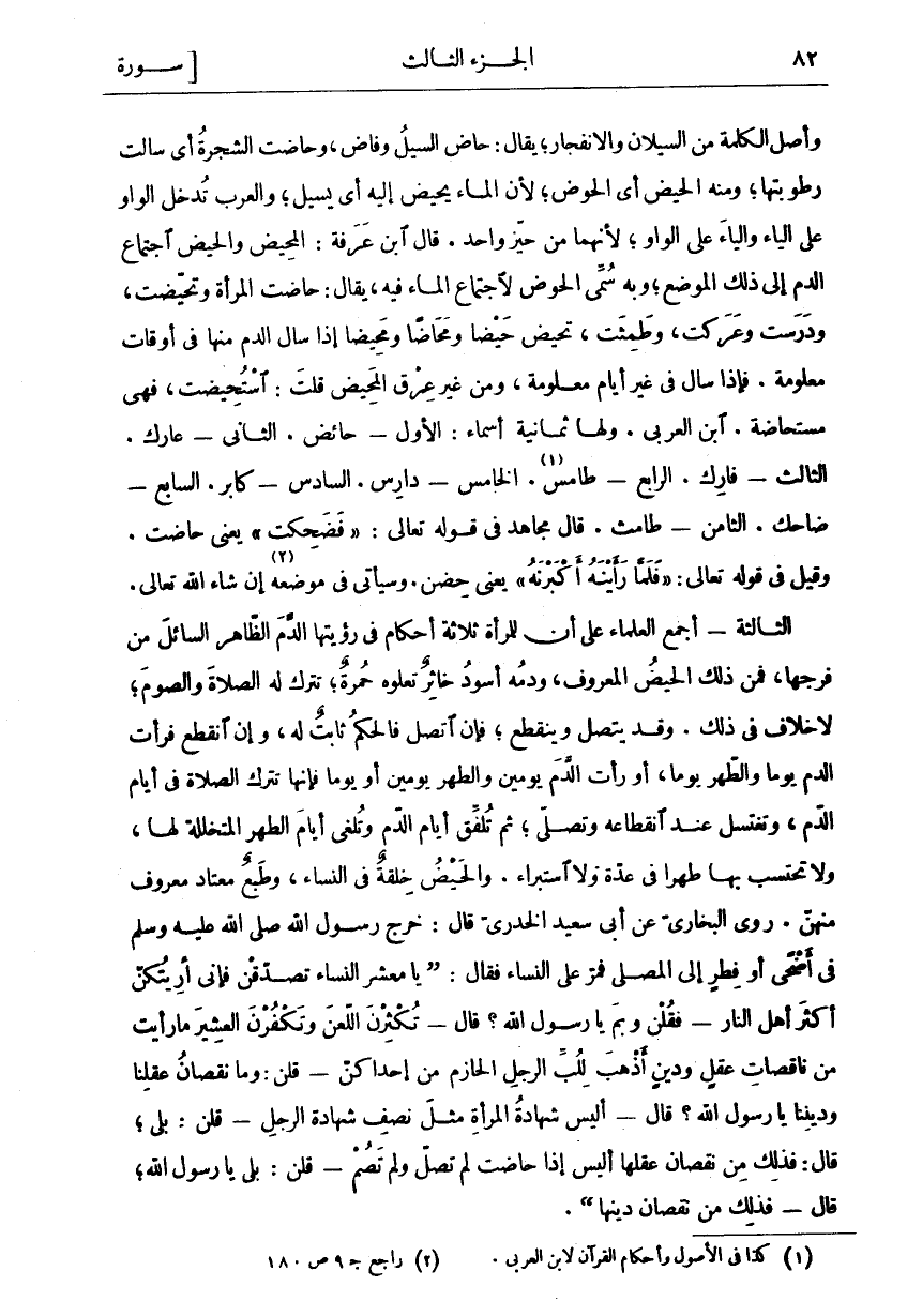 وَأَصْلُ الْكَلِمَةِ مِنَ السَّيَلَانِ وَالِانْفِجَارِ، يُقَالُ: حَاضَ السَّيْلُ وَفَاضَ، وَحَاضَتِ الشَّجَرَةُ أَيْ سَالَتْ رُطُوبَتُهَا، وَمِنْهُ الْحَيْضُ أَيِ الْحَوْضُ، لِأَنَّ الْمَاءَ يَحِيضُ إِلَيْهِ أَيْ يَسِيلُ، وَالْعَرَبُ تُدْخِلُ الْوَاوَ عَلَى الْيَاءِ وَالْيَاءَ عَلَى الْوَاوِ، لِأَنَّهُمَا مِنْ حَيِّزٍ وَاحِدٍ. قَالَ ابْنُ عَرَفَةَ: الْمَحِيضُ وَالْحَيْضُ اجْتِمَاعُ الدَّمِ إِلَى ذَلِكَ الْمَوْضِعِ، وَبِهِ سُمِّيَ الْحَوْضُ لِاجْتِمَاعِ الْمَاءِ فِيهِ، يُقَالُ: حَاضَتِ الْمَرْأَةُ وَتَحَيَّضَتْ، وَدَرَسَتْ وَعَرَكَتْ، وَطَمِثَتْ، تَحِيضُ حَيْضًا وَمَحَاضًا وَمَحِيضًا إِذَا سَالَ الدَّمُ مِنْهَا فِي أَوْقَاتٍ مَعْلُومَةٍ. فَإِذَا سَالَ فِي غَيْرِ أَيَّامٍ مَعْلُومَةٍ، وَمِنْ غَيْرِ عِرْقِ الْمَحِيضِ قُلْتُ: اسْتُحِيضَتْ، فَهِيَ مُسْتَحَاضَةٌ. ابْنُ الْعَرَبِيِّ. وَلَهَا ثَمَانِيَةُ أَسْمَاءٍ: الْأَوَّلُ- حَائِضٌ. الثَّانِي- عَارِكٌ. الثَّالِثُ- فَارِكٌ. الرَّابِعُ- طَامِسٌ «١». الْخَامِسُ دَارِسٌ. السَّادِسُ- كَابِرٌ. السَّابِعُ- ضَاحِكٌ. الثَّامِنُ- طَامِثٌ. قَالَ مُجَاهِدٌ فِي قَوْلِهِ تَعَالَى:" فَضَحِكَتْ" يَعْنِي حَاضَتْ. وَقِيلَ فِي قَوْلِهِ تَعَالَى:" فَلَمَّا رَأَيْنَهُ أَكْبَرْنَهُ" يَعْنِي حِضْنَ. وَسَيَأْتِي فِي مَوْضِعِهِ «٢» إِنْ شَاءَ اللَّهُ تَعَالَى. الثَّالِثَةُ- أَجْمَعَ الْعُلَمَاءُ عَلَى أَنَّ لِلْمَرْأَةِ ثَلَاثَةَ أَحْكَامٍ فِي رُؤْيَتِهَا الدَّمَ الظَّاهِرَ السَّائِلَ مِنْ فَرْجِهَا، فَمِنْ ذَلِكَ الْحَيْضُ الْمَعْرُوفُ، وَدَمُهُ أَسْوَدُ خَاثِرٌ تَعْلُوهُ حُمْرَةٌ، تُتْرَكُ لَهُ الصَّلَاةُ وَالصَّوْمُ، لَا خِلَافَ فِي ذَلِكَ. وَقَدْ يَتَّصِلُ وَيَنْقَطِعُ، فَإِنِ اتَّصَلَ فَالْحُكْمُ ثَابِتٌ لَهُ، وَإِنِ انْقَطَعَ فَرَأَتِ الدَّمَ يَوْمًا وَالطُّهْرَ يَوْمًا، أَوْ رَأَتِ الدَّمَ يَوْمَيْنِ وَالطُّهْرَ يَوْمَيْنِ أَوْ يَوْمًا فَإِنَّهَا تَتْرُكُ الصَّلَاةَ فِي أَيَّامِ الدَّمِ، وَتَغْتَسِلُ عِنْدَ انْقِطَاعِهِ وَتُصَلِّي، ثُمَّ تُلَفِّقُ أَيَّامَ الدَّمِ وَتُلْغِي أَيَّامَ الطُّهْرِ الْمُتَخَلِّلَةَ لَهَا، وَلَا تَحْتَسِبُ بِهَا طُهْرًا فِي عِدَّةٍ وَلَا اسْتِبْرَاءَ. وَالْحَيْضُ خِلْقَةٌ فِي النِّسَاءِ، وَطَبْعٌ مُعْتَادٌ مَعْرُوفٌ مِنْهُنَّ. رَوَى الْبُخَارِيُّ عَنْ أَبِي سَعِيدٍ الْخُدْرِيِّ قَالَ: خَرَجَ رَسُولُ اللَّهِ صَلَّى اللَّهُ عَلَيْهِ وَسَلَّمَ فِي أَضْحَى أَوْ فِطْرٍ إِلَى الْمُصَلَّى فَمَرَّ عَلَى النِّسَاءِ فَقَالَ:" يَا مَعْشَرَ النِّسَاءِ تَصَدَّقْنَ فَإِنِّي أُرِيتُكُنَّ أَكْثَرَ أَهْلِ النَّارِ- فَقُلْنَ وَبِمَ يَا رَسُولَ اللَّهِ؟ قَالَ- تُكْثِرْنَ اللَّعْنَ وَتَكْفُرْنَ الْعَشِيرَ مَا رَأَيْتُ مِنْ نَاقِصَاتِ عَقْلٍ وَدِينٍ أَذْهَبَ لِلُبِّ الرَّجُلِ الْحَازِمِ مِنْ إِحْدَاكُنَّ- قُلْنَ: وَمَا نُقْصَانُ عَقْلِنَا وَدِينِنَا يَا رَسُولَ اللَّهِ؟ قَالَ: أَلَيْسَ شَهَادَةُ الْمَرْأَةِ مِثْلَ نِصْفِ شَهَادَةِ الرَّجُلِ؟ قُلْنَ: بَلَى، قَالَ: فَذَلِكَ مِنْ نُقْصَانِ عَقْلِهَا أَلَيْسَ إِذَا حَاضَتْ لَمْ تُصَلِّ وَلَمْ تَصُمْ- قُلْنَ: بَلَى يَا رَسُولَ الله، قال- فذلك من نقصان دينها".